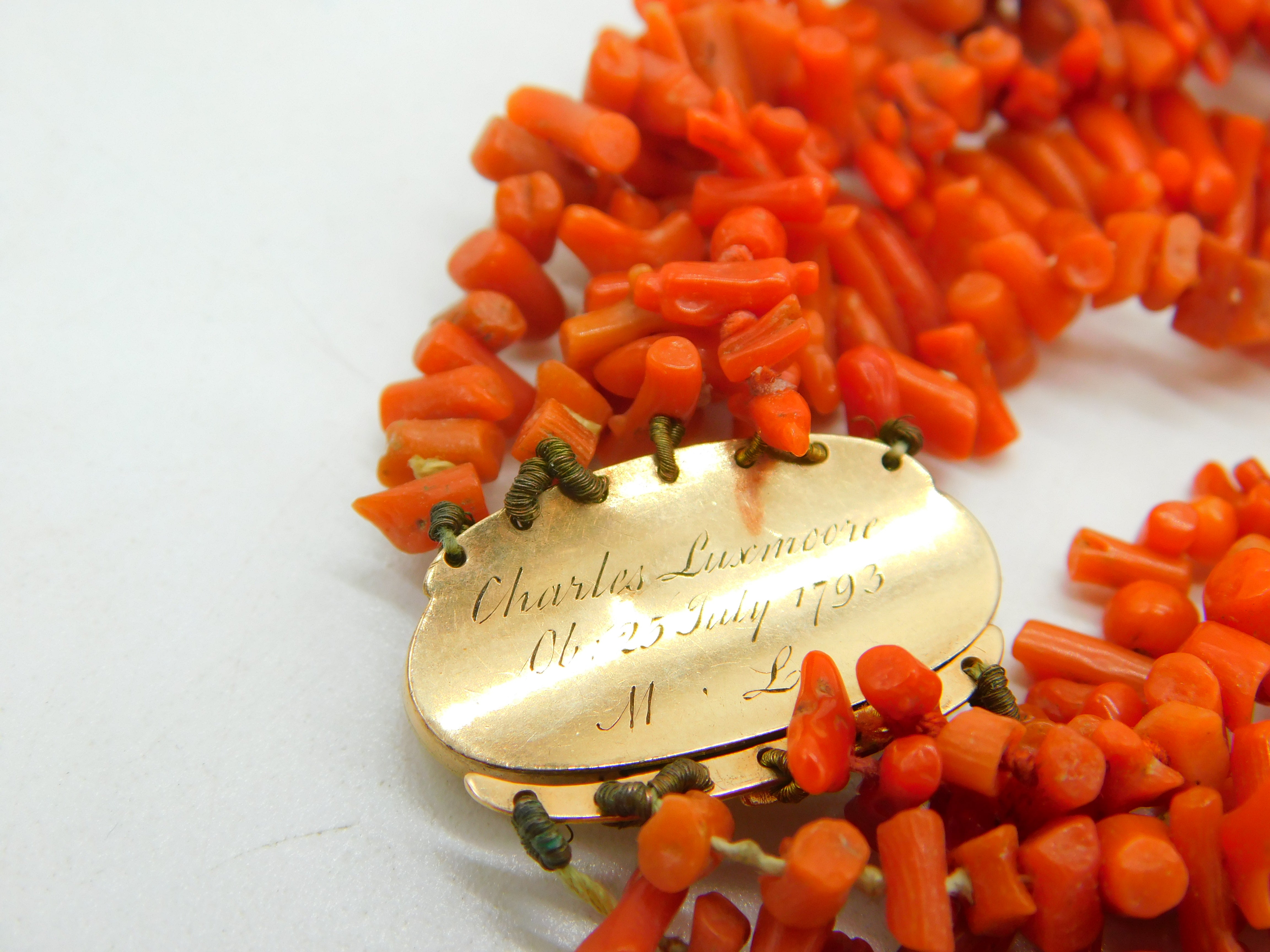 Details: A fantastic and wonderfully designed antique georgian 9ct rose gold & graduated red coral four strand necklace with superb mourning detailing set with hair plait & engraved to the reverse 'Charles Luxmoore, Ob. 25 July 1793, M-L', the gold has been XRF tested. This is a wonderful item that would make a perfect gift or addition to any collection. The BOX pictured is for PRESENTATION ONLY and is NOT included in the listings but used to frame the pictures unless specifically stated otherwise.