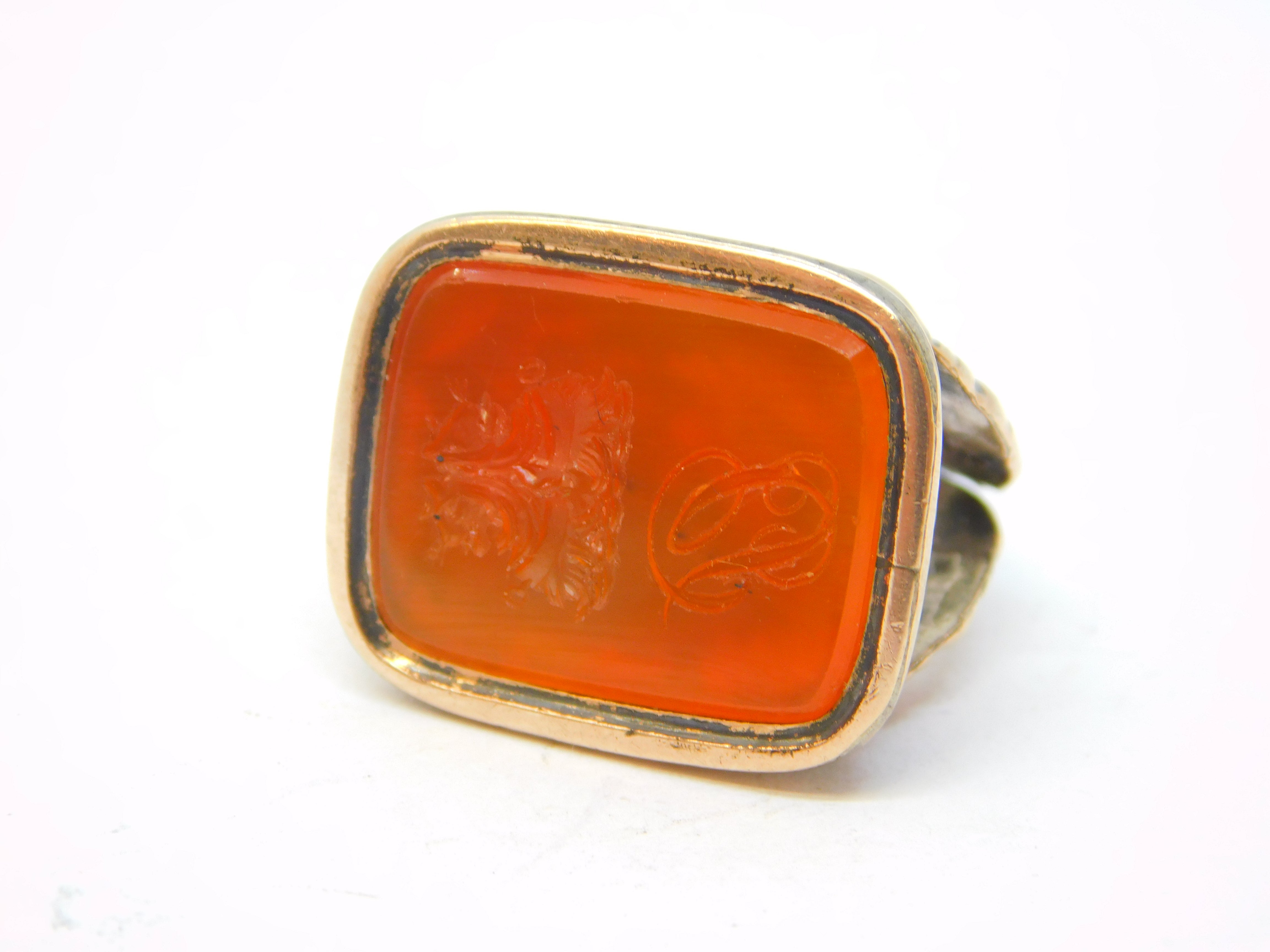 Details: A fantastic and wonderfully designed antique georgian 9ct rose gold carved carnelian agate intaglio fob seal pendant depicting back-to-back roaring lions over a monogram initial c1800, the gold has been XRF tested as it is unmarked, one of the links on the fob seal has been repaired with base metal please note. This is a wonderful item that would make a perfect gift or addition to any collection.