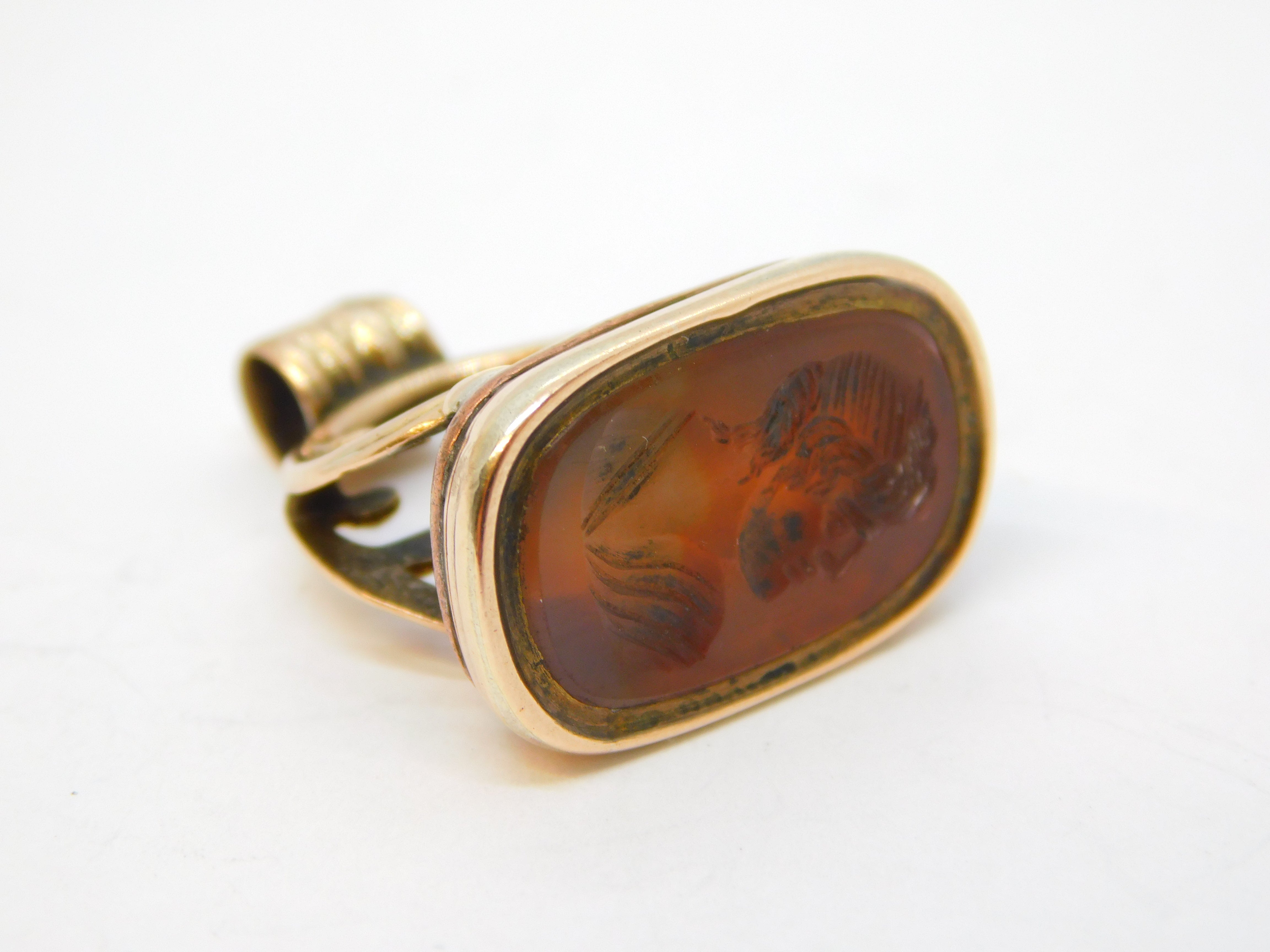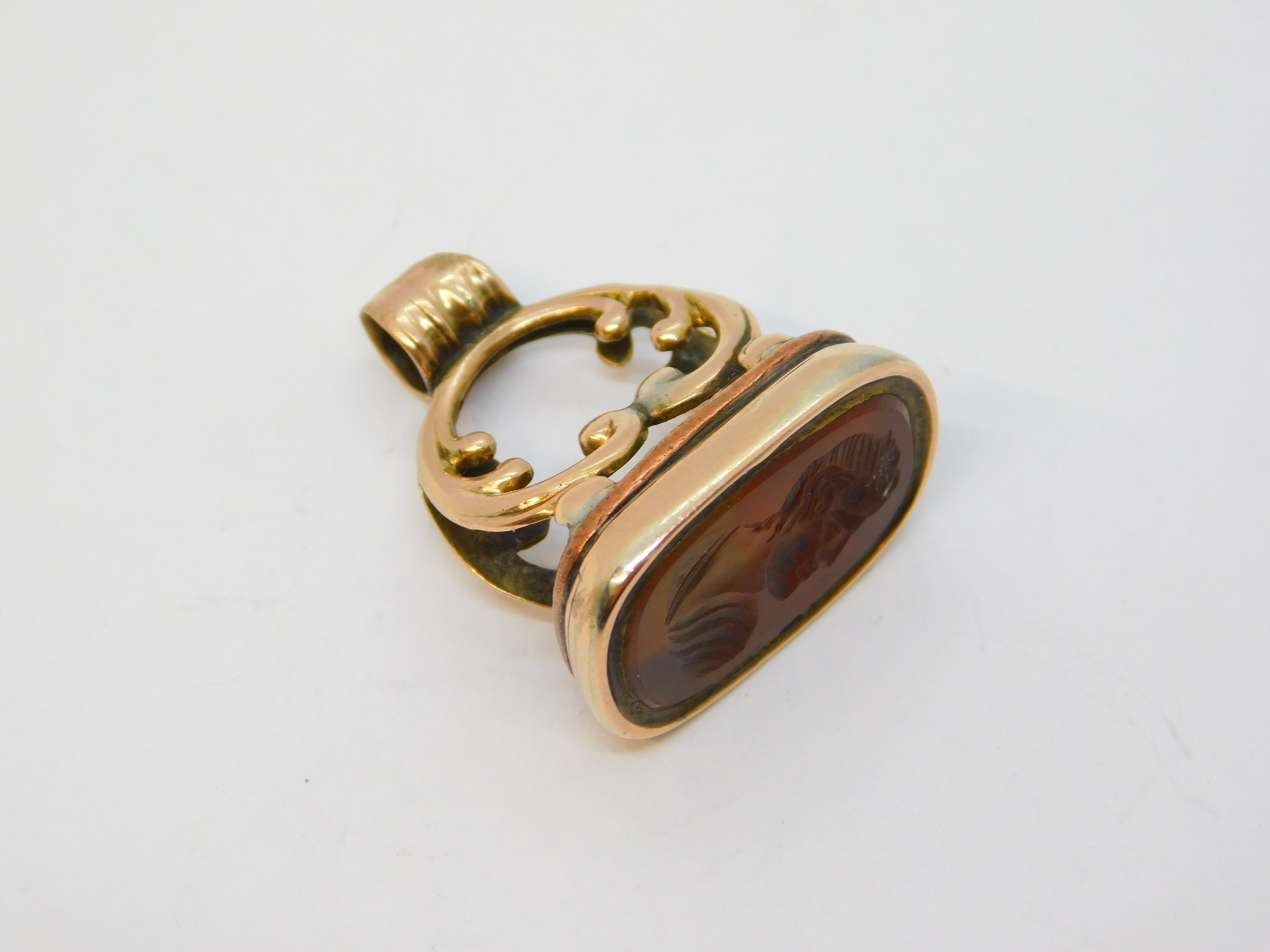 Details: A fantastic and wonderfully designed antique georgian grand tour period 9ct rose gold mounted carved carnelian agate intaglio fob seal depicting a classical gentleman c1800, the gold has been XRF tested - see pictures for XRF report. This is a wonderful item that would make a perfect gift or addition to any collection. We are more than happy to provide XRF reports for items upon request.