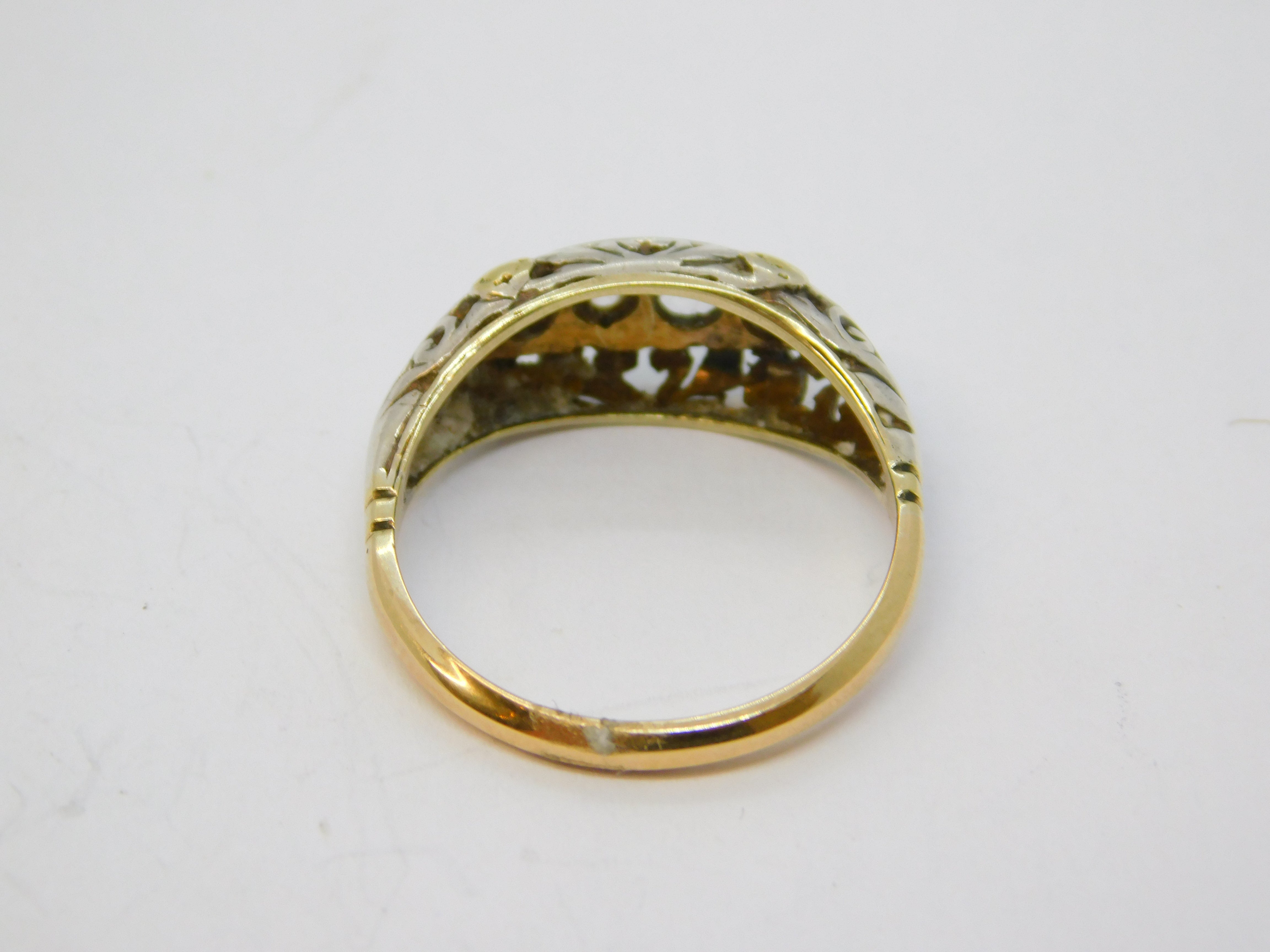 Details: A fantastic and wonderfully designed antique georgian 9ct yellow gold band & silver set old-cut diamond boat ring with superb detailing to include gold aspects to the silver front, the gold has been XRF tested - please see pictures for report. One of the diamonds has a chip. This is a wonderful item that would make a perfect gift or addition to any collection. We are more than happy to provide XRF reports for items upon request.