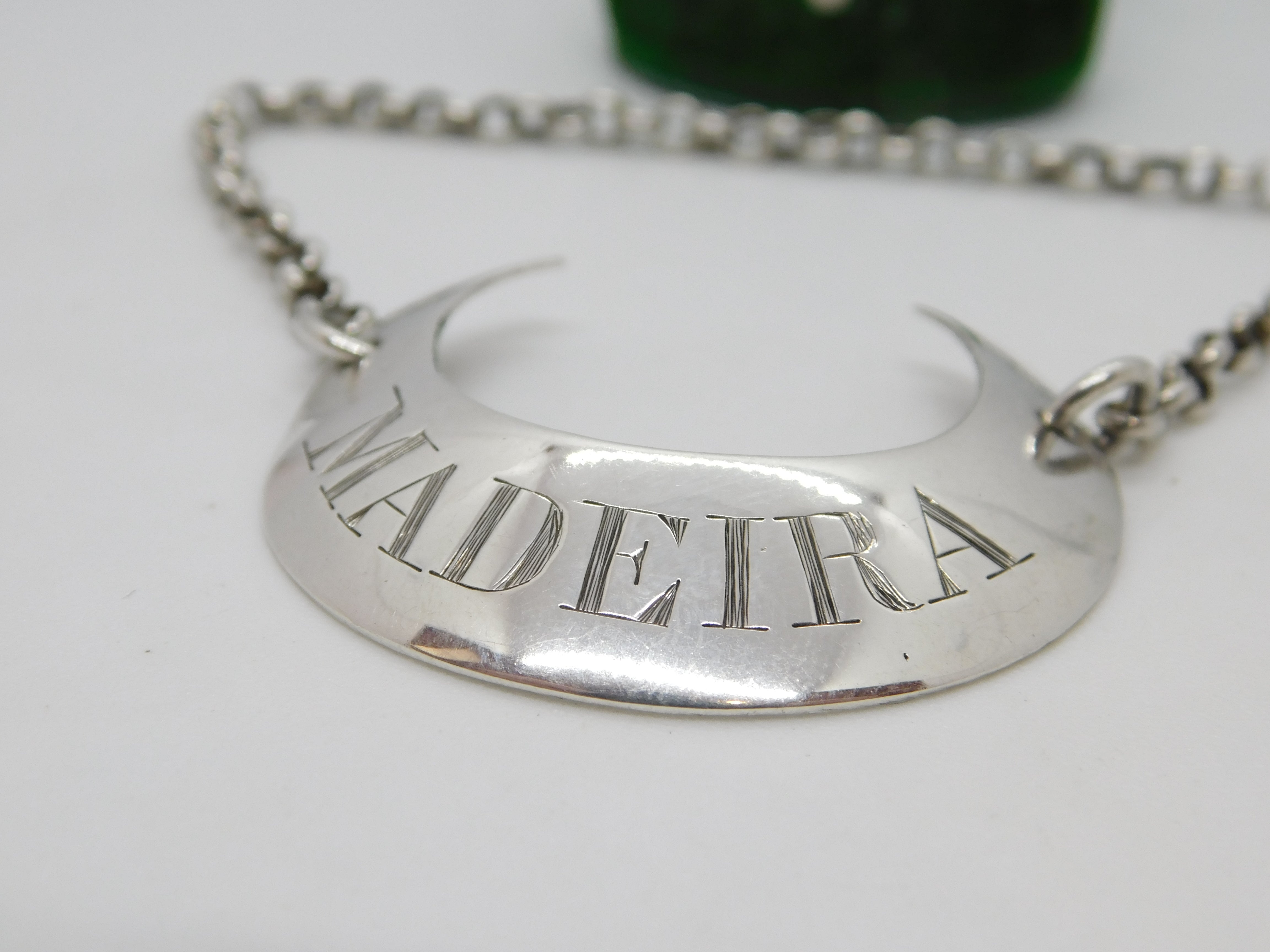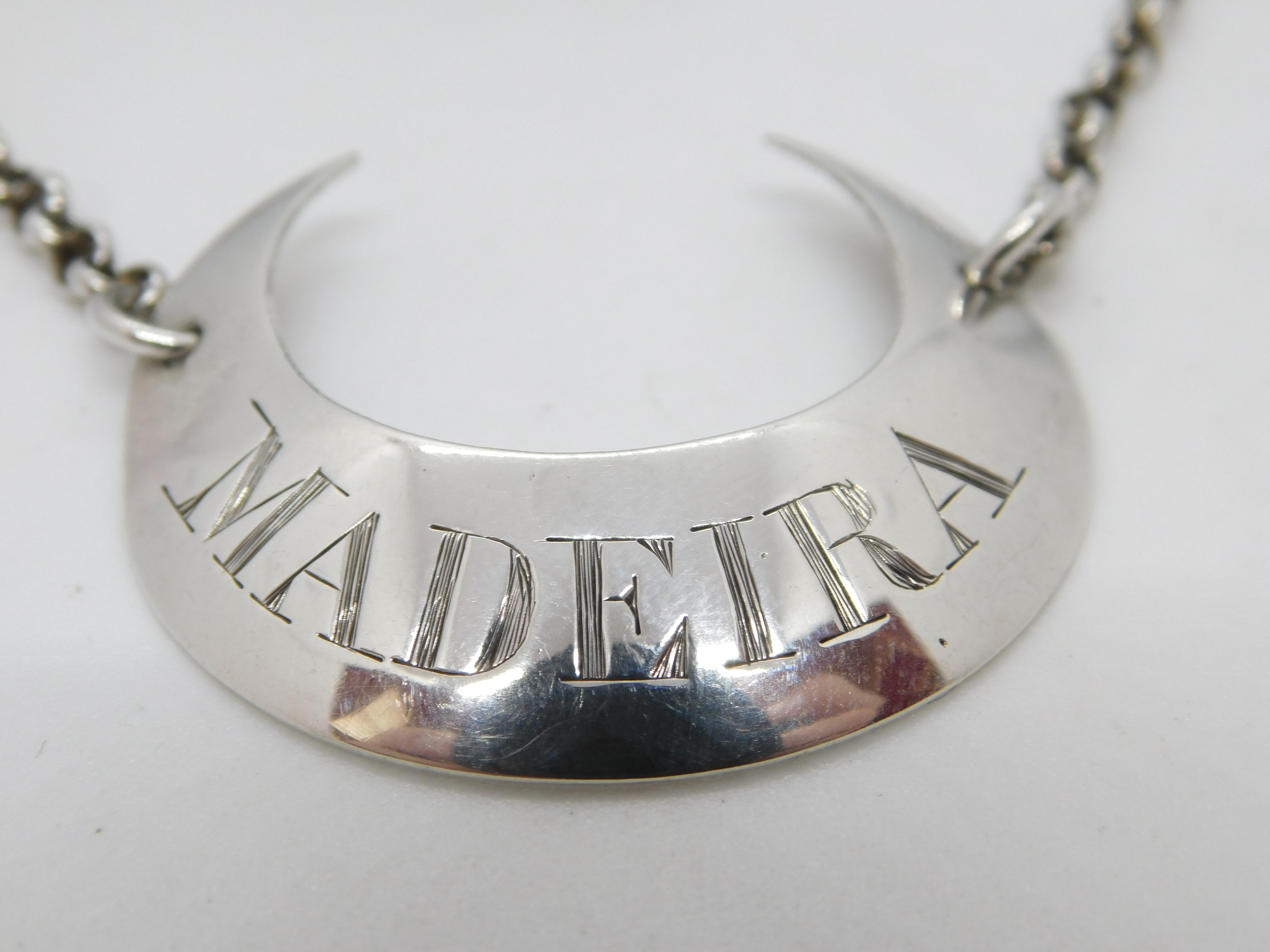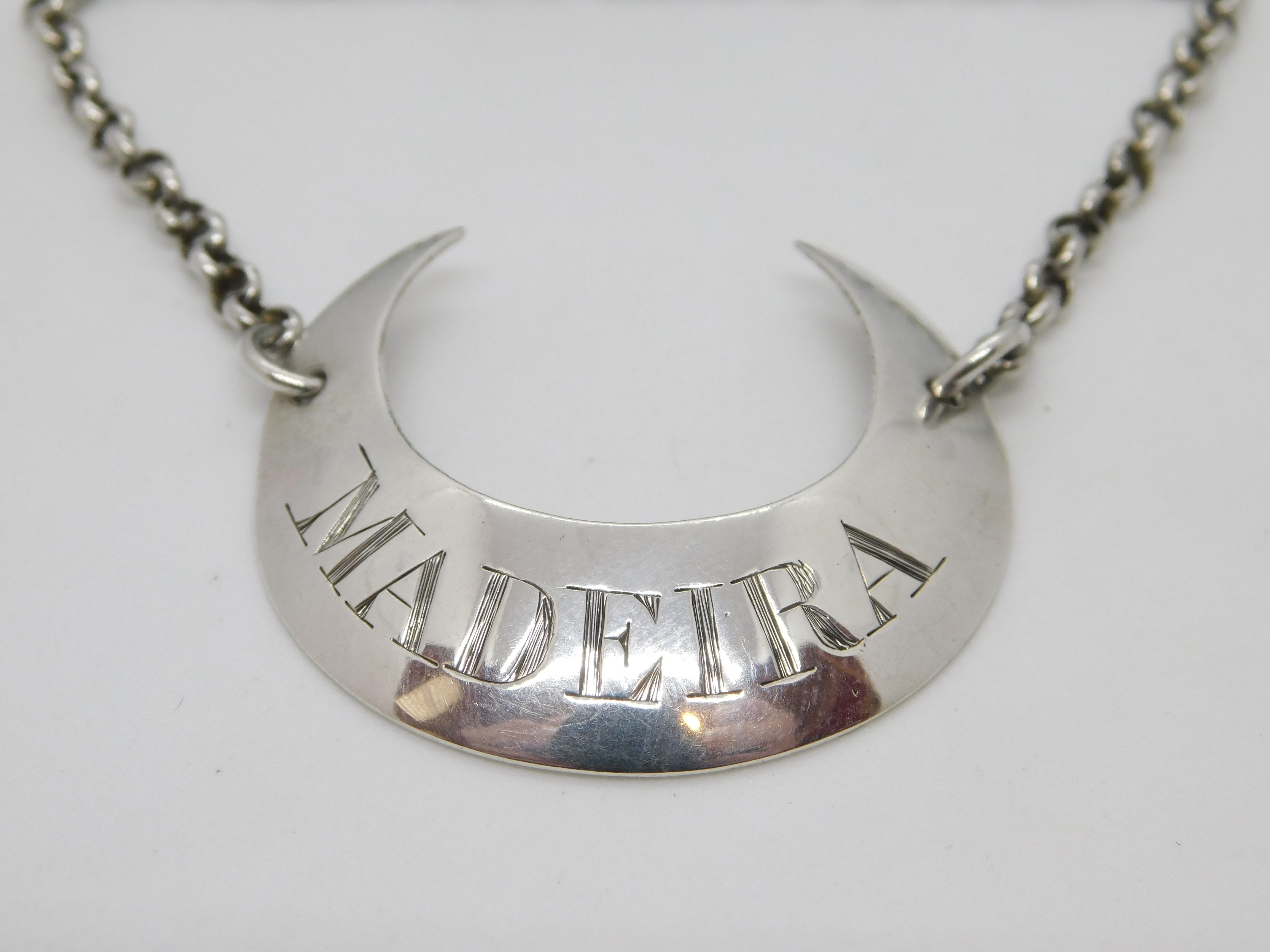 Details: A fantastic and wonderfully designed antique georgian sterling silver crescent shaped bright cut madeira decanter label with lovely detailing hallmarked to the reverse London c1770 by Hester Bateman. This is a wonderful item that would make a perfect gift or addition to any collection. The BOX pictured is for PRESENTATION ONLY and is NOT included in the listings but used to frame the pictures unless specifically stated otherwise.