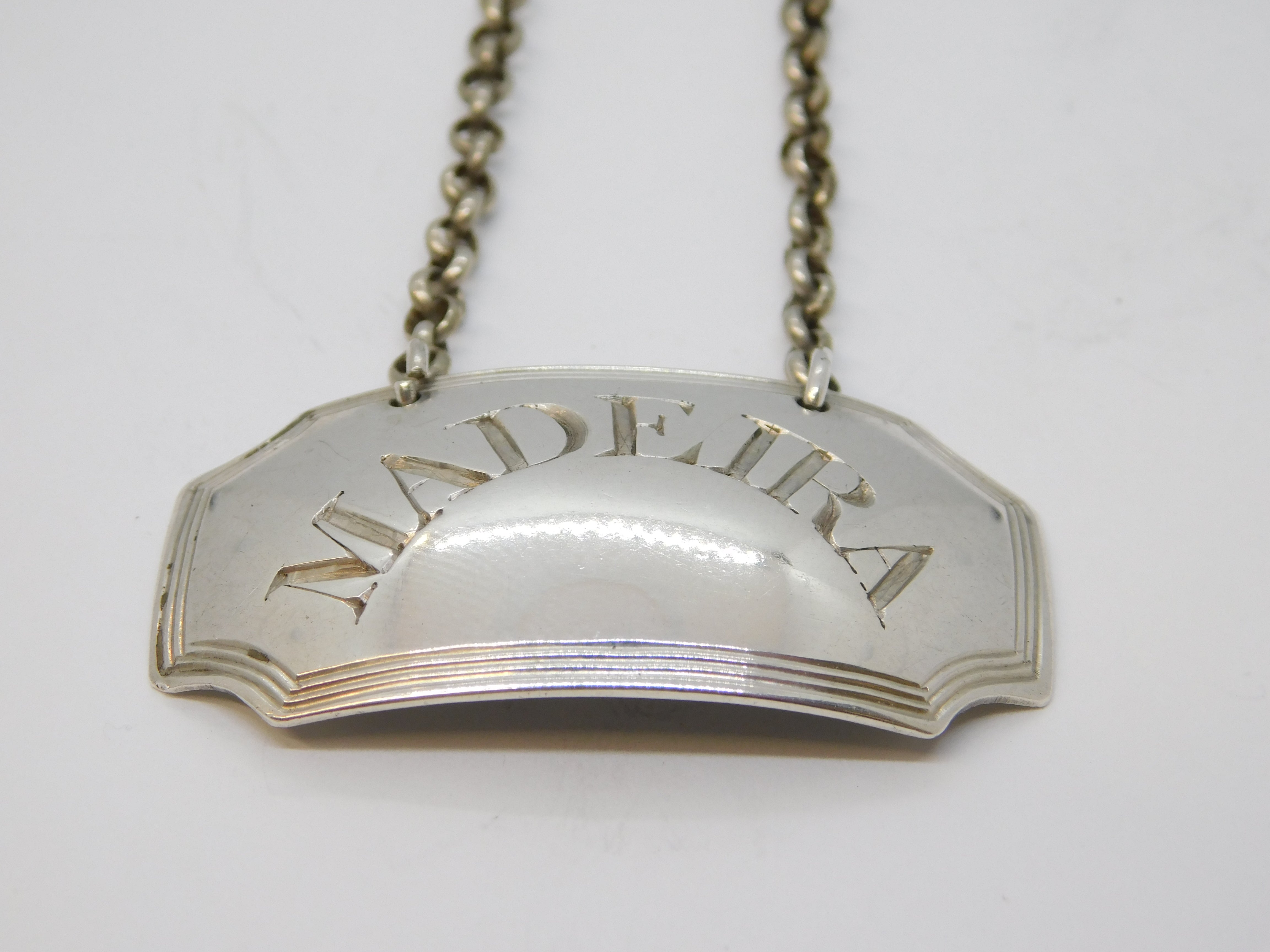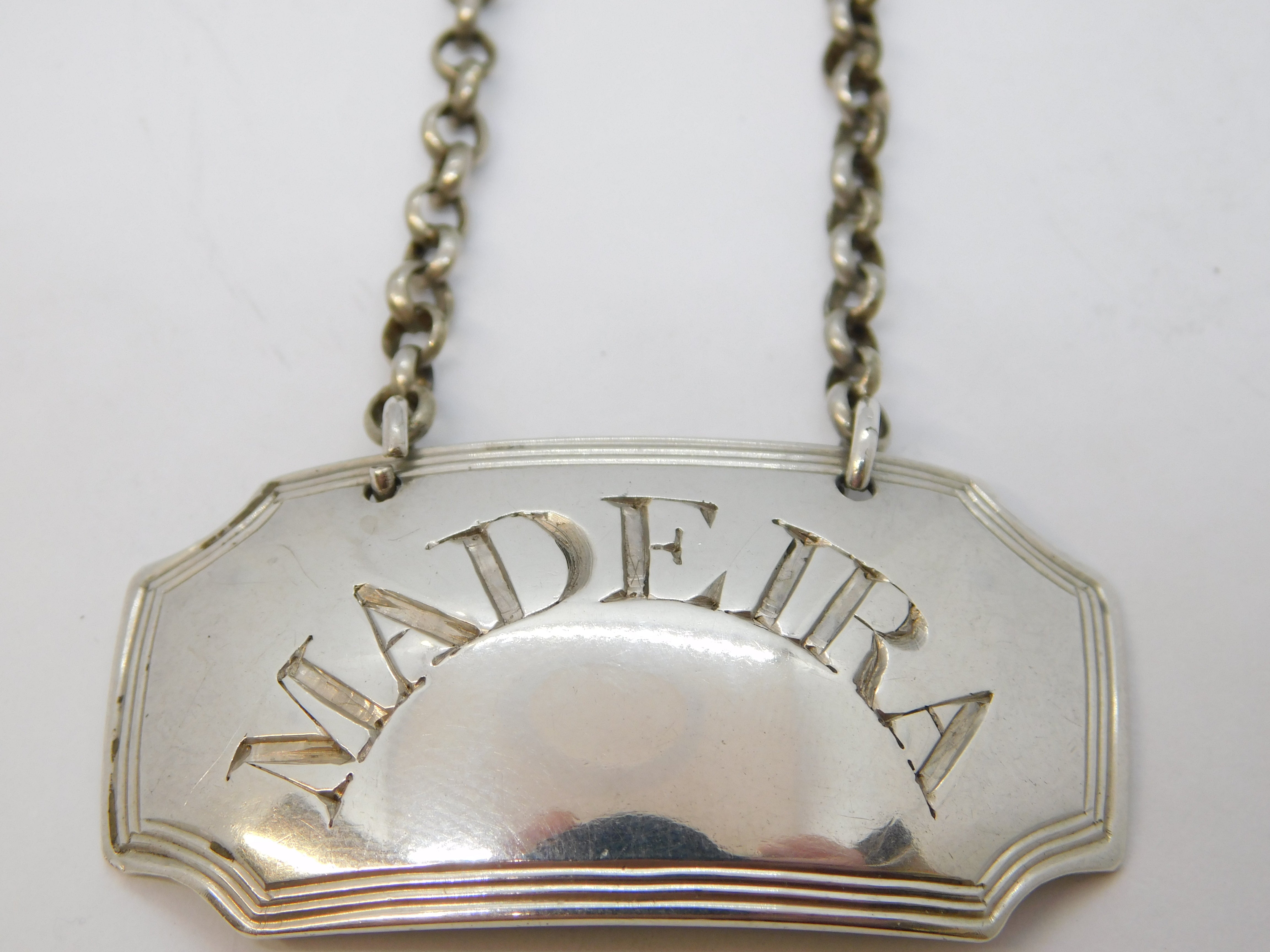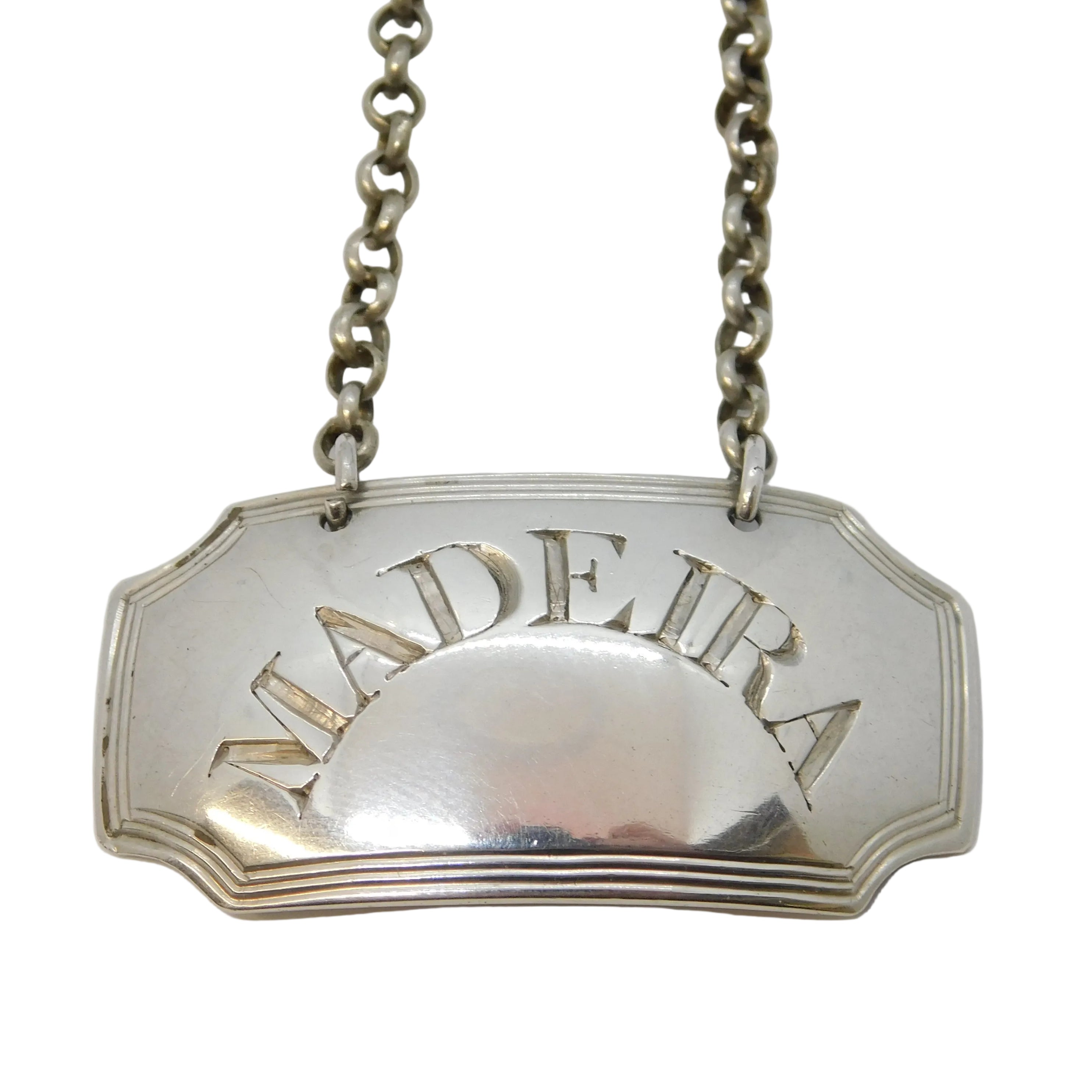 Details: A fantastic and wonderfully designed antique georgian sterling silver Madeira decanter label with lovely arched lettering hallmarked London 1808 by John Rich. This is a wonderful item that would make a perfect gift or addition to any collection. We are more than happy to provide XRF reports for items upon request.