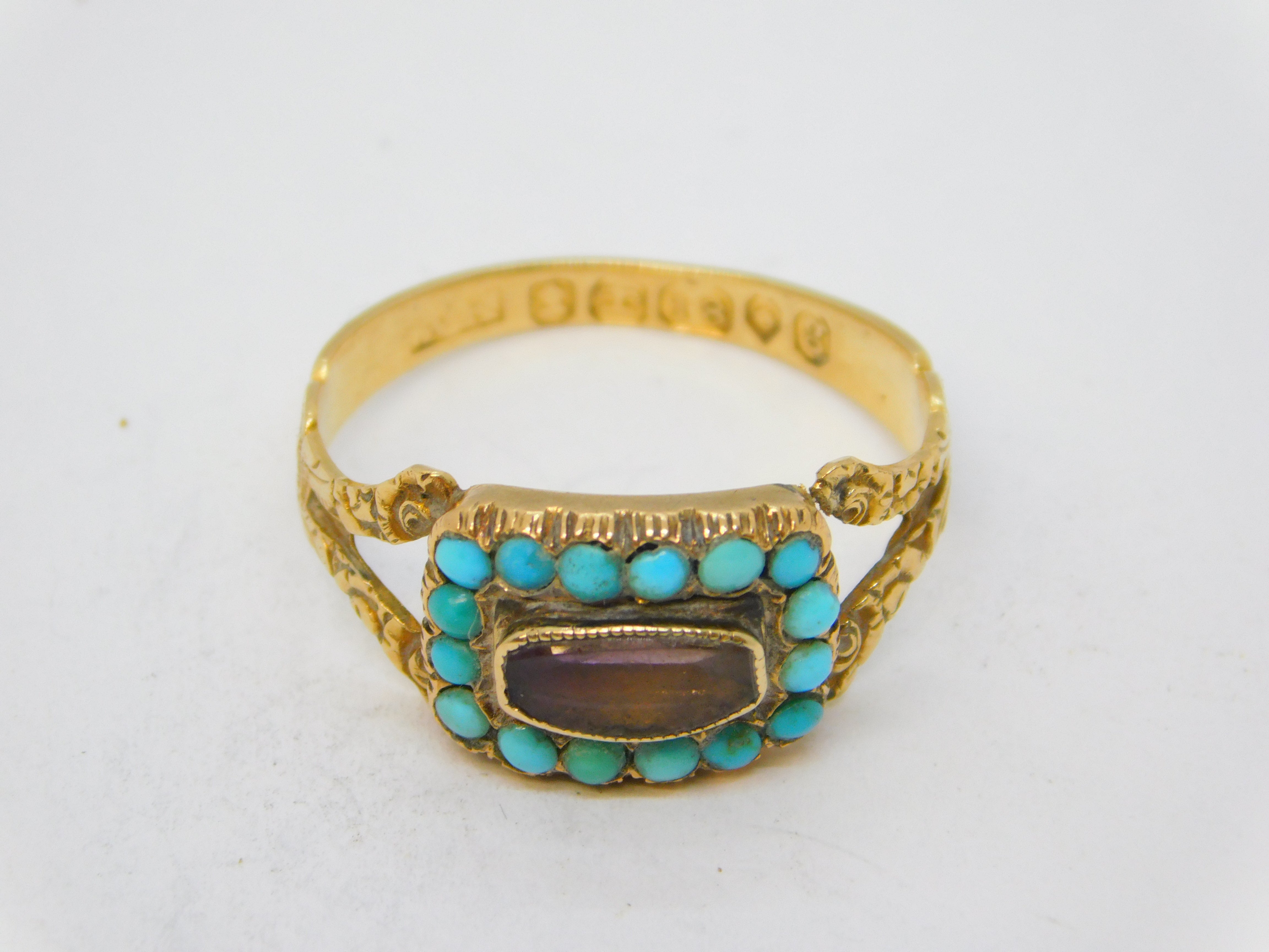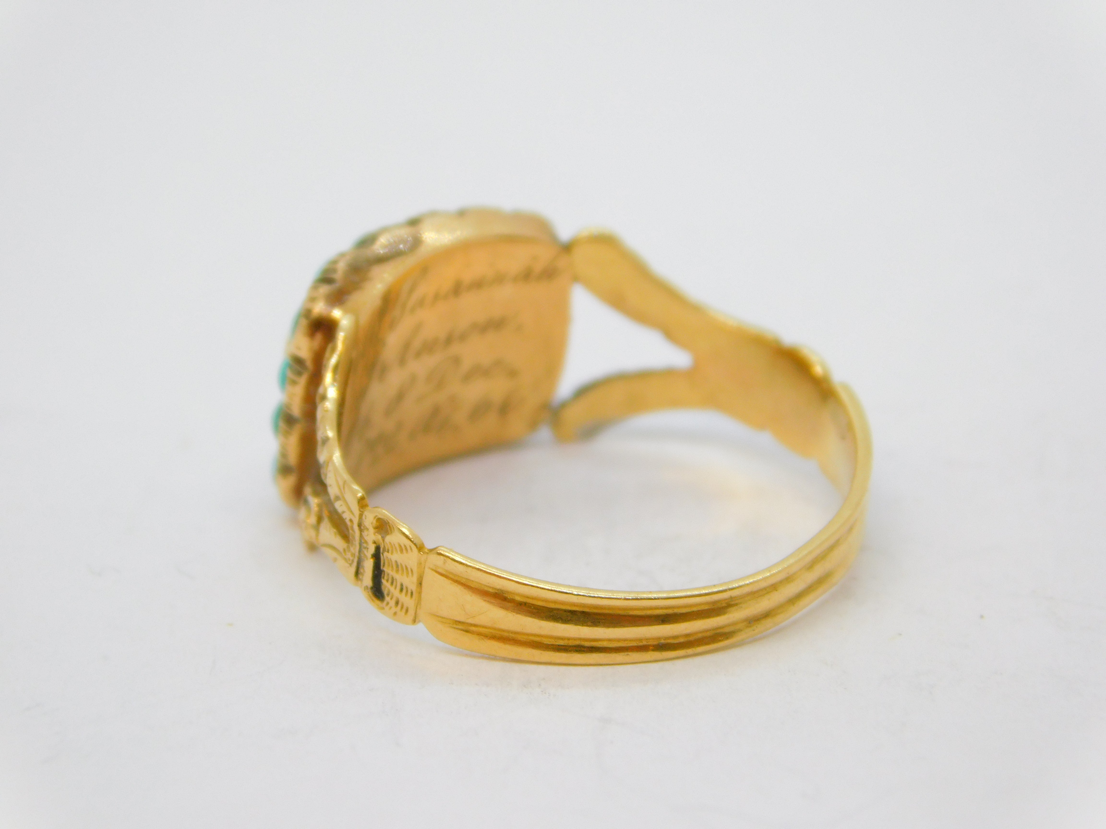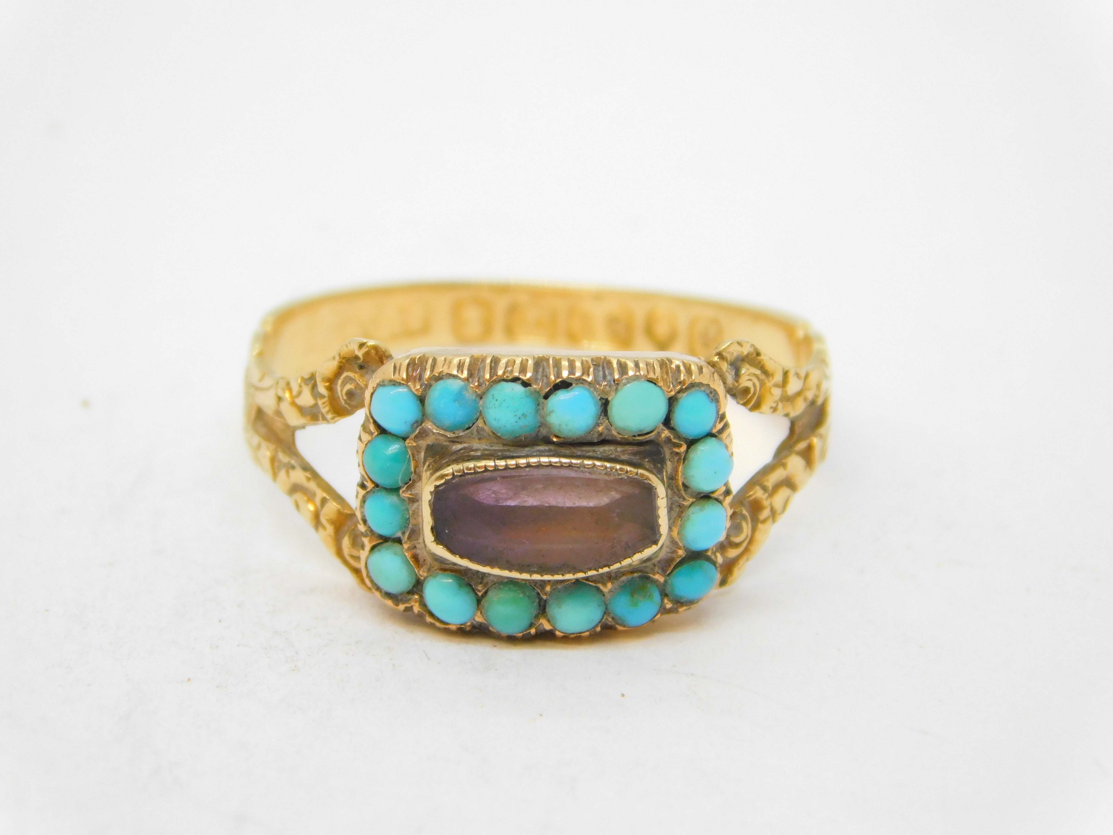 Details: A fantastic and wonderfully designed antique georgian 18ct yellow gold mourning ring with applied floral decorations, the front set with a faceted rock crystal surrounded by natural turquoise stones. Beautifully engraved to the reverse reading 'Mrs Susannah J'Anson, Ob. 8th Dec 1822, Aged 66'. Hallmarked with stunning crisp marks for London 1822 by William Knight II. This is a wonderful item that would make a perfect gift or addition to any collection. We are more than happy to provide XRF reports for items upon request.