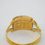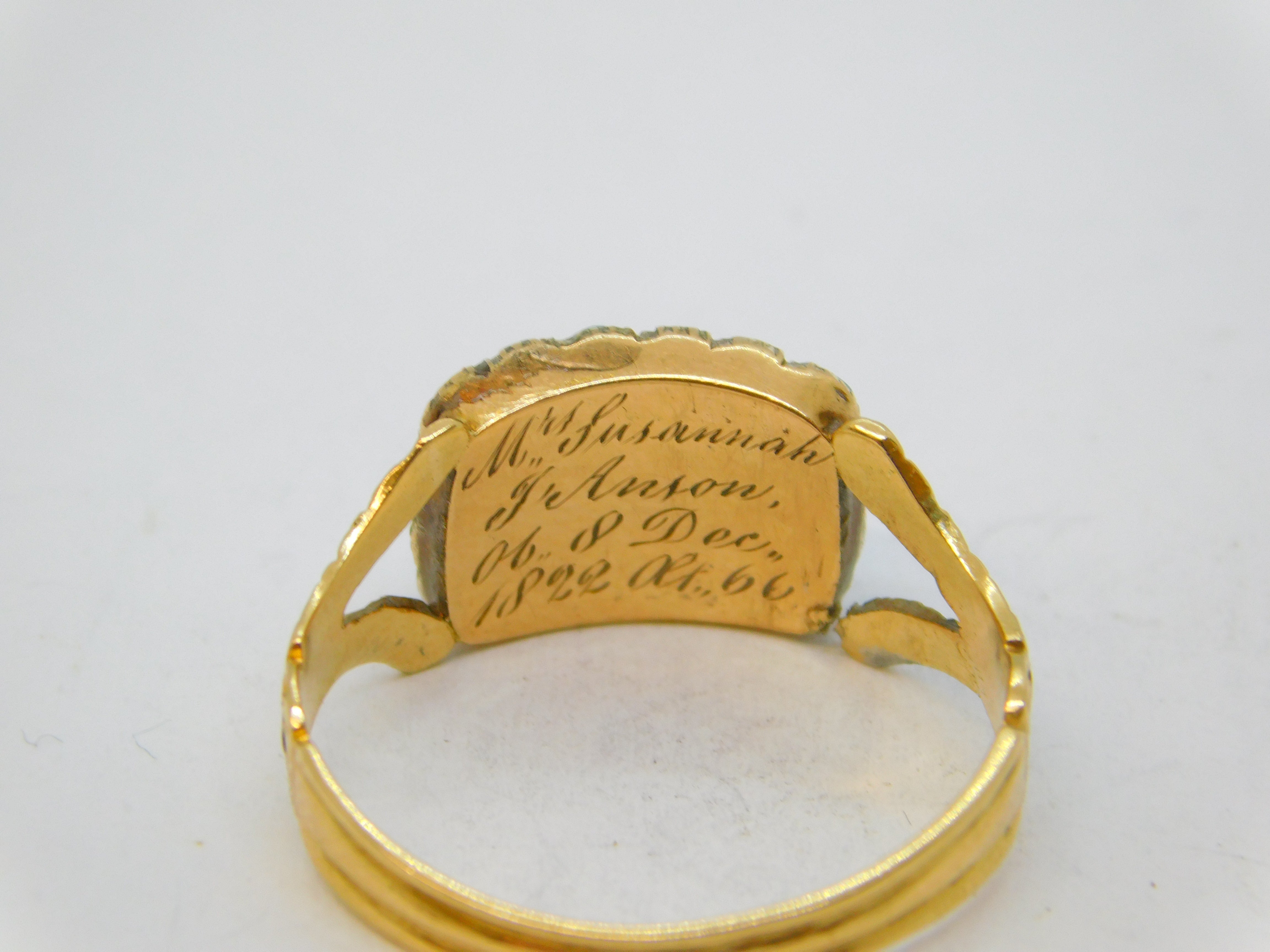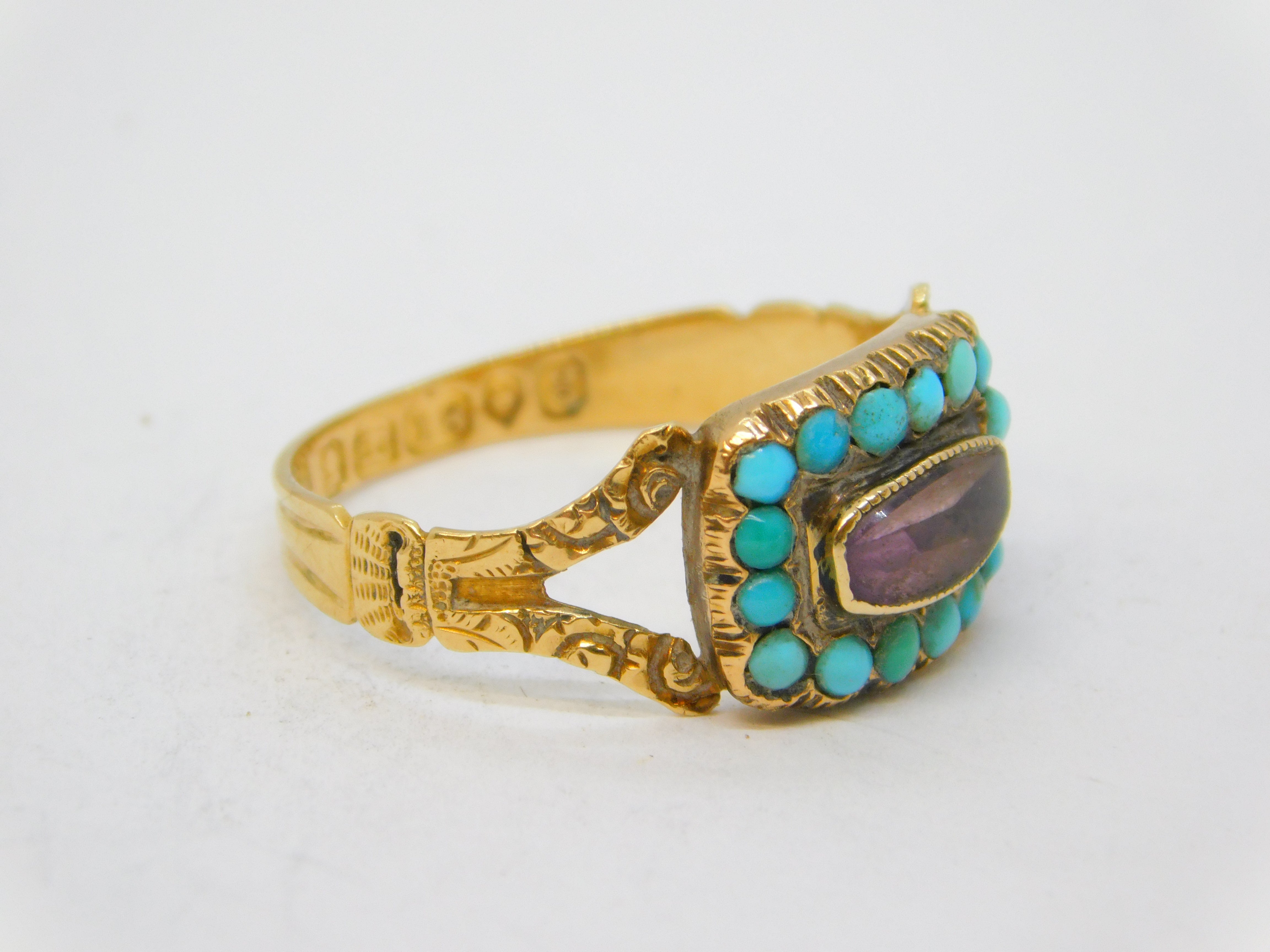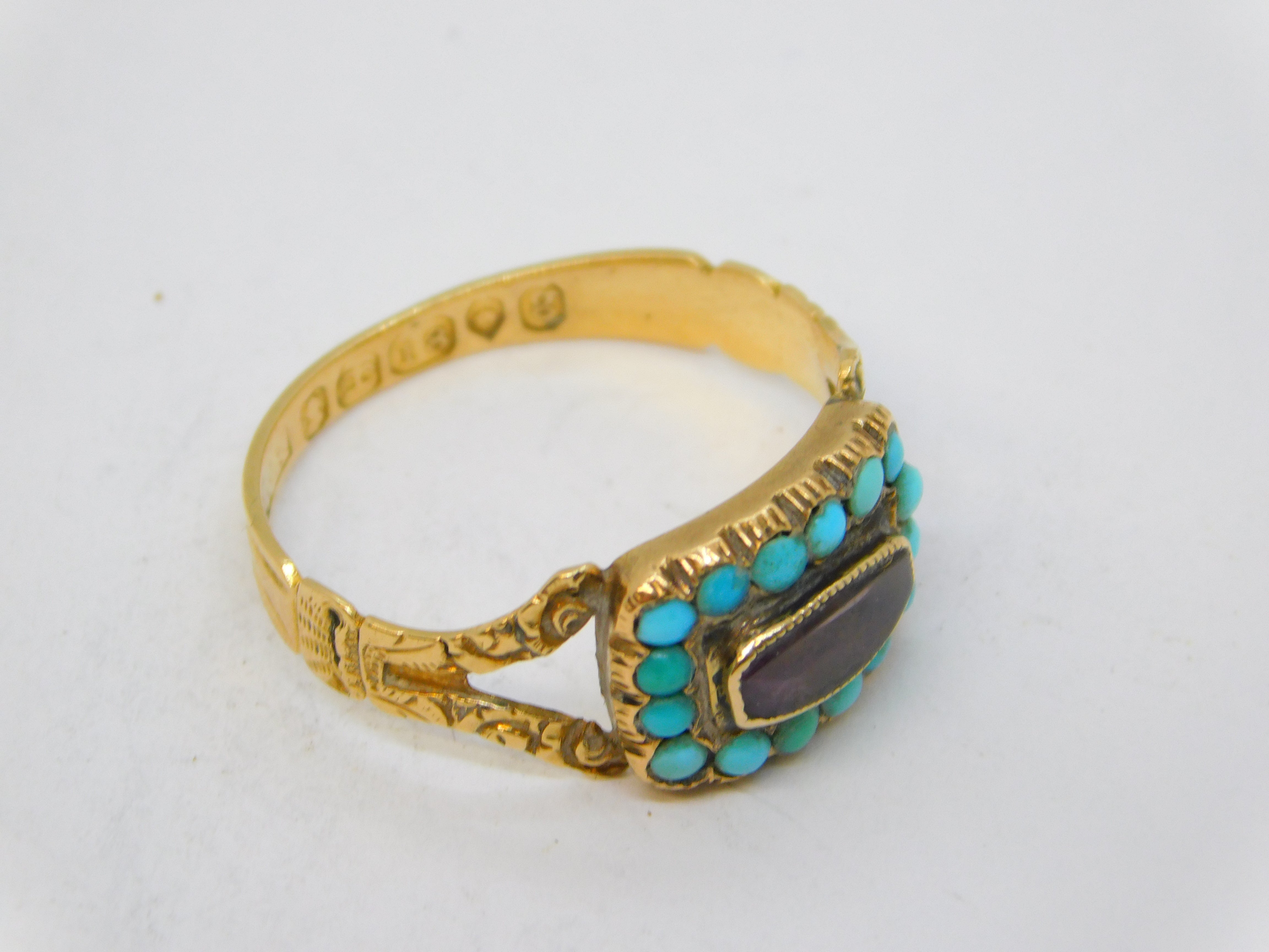 Details: A fantastic and wonderfully designed antique georgian 18ct yellow gold mourning ring with applied floral decorations, the front set with a faceted rock crystal surrounded by natural turquoise stones. Beautifully engraved to the reverse reading 'Mrs Susannah J'Anson, Ob. 8th Dec 1822, Aged 66'. Hallmarked with stunning crisp marks for London 1822 by William Knight II. This is a wonderful item that would make a perfect gift or addition to any collection. We are more than happy to provide XRF reports for items upon request.
