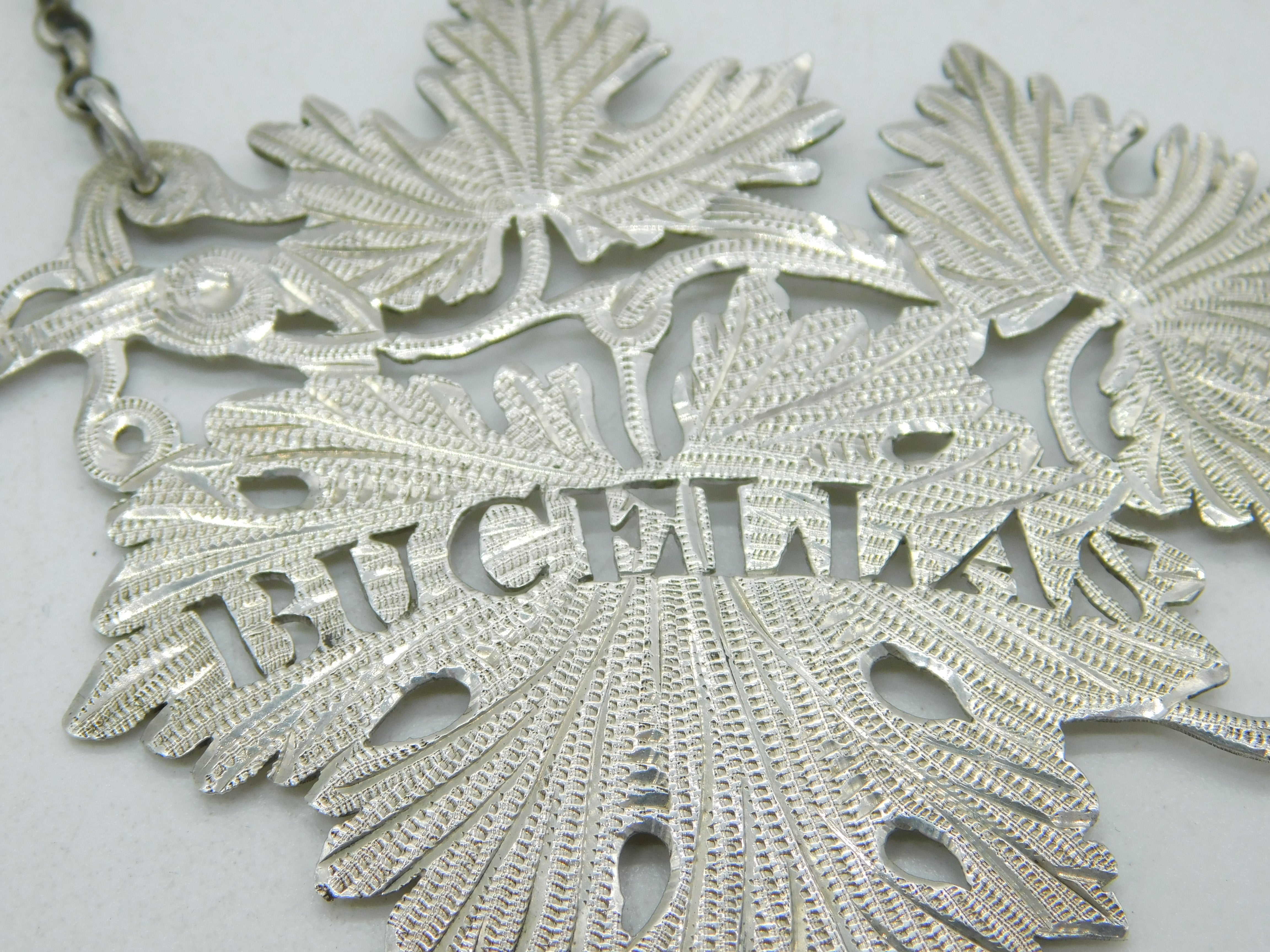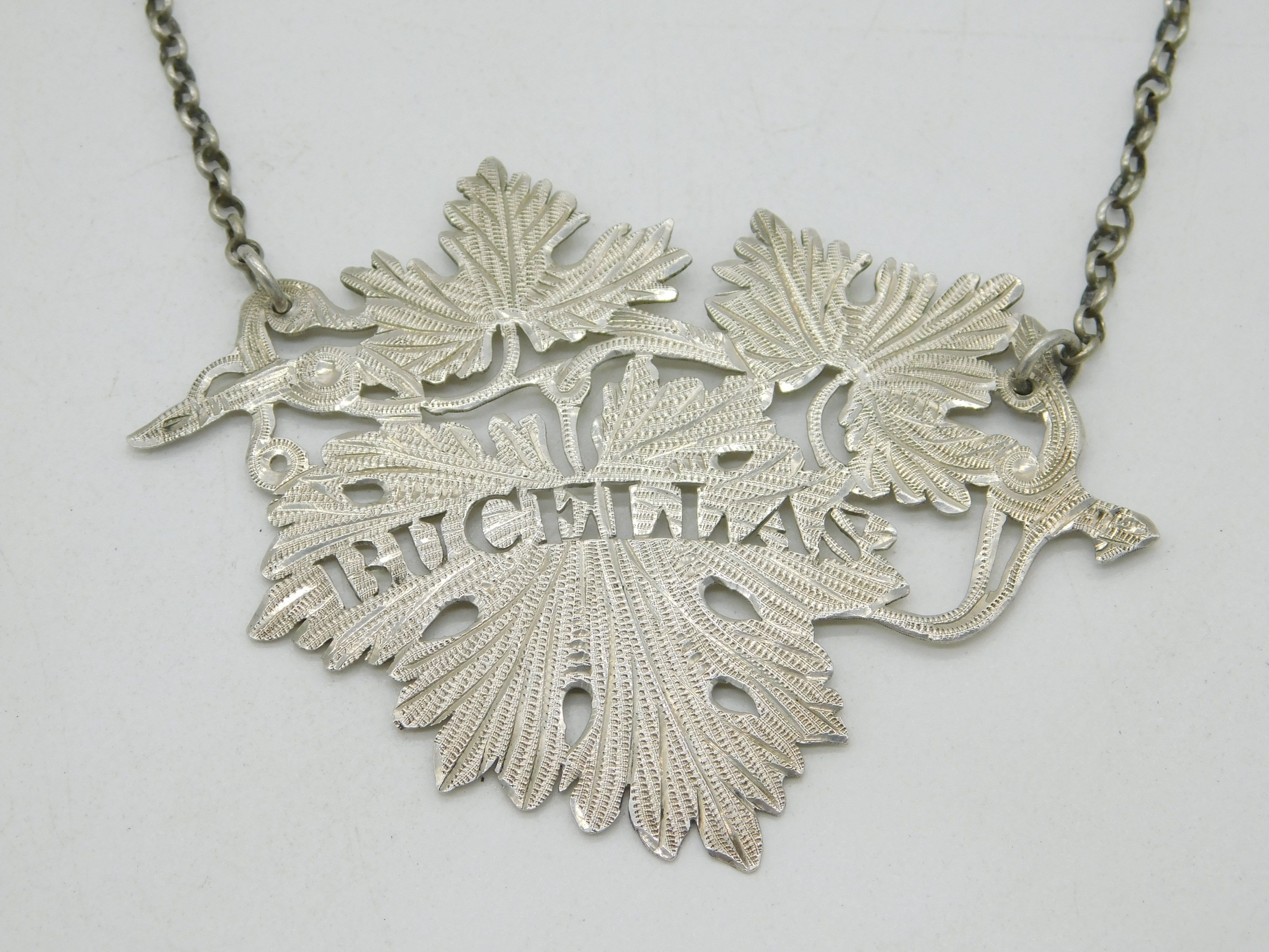 Details: A fantastic and wonderfully designed antique georgian large sterling silver Bucellas portuguese wine decanter label with charming leaf form, hallmarked to the reverse for Birmingham 1826 by Lawrence, Vane & Co. This is a wonderful item that would make a perfect gift or addition to any collection. We are more than happy to provide XRF reports for items upon request.