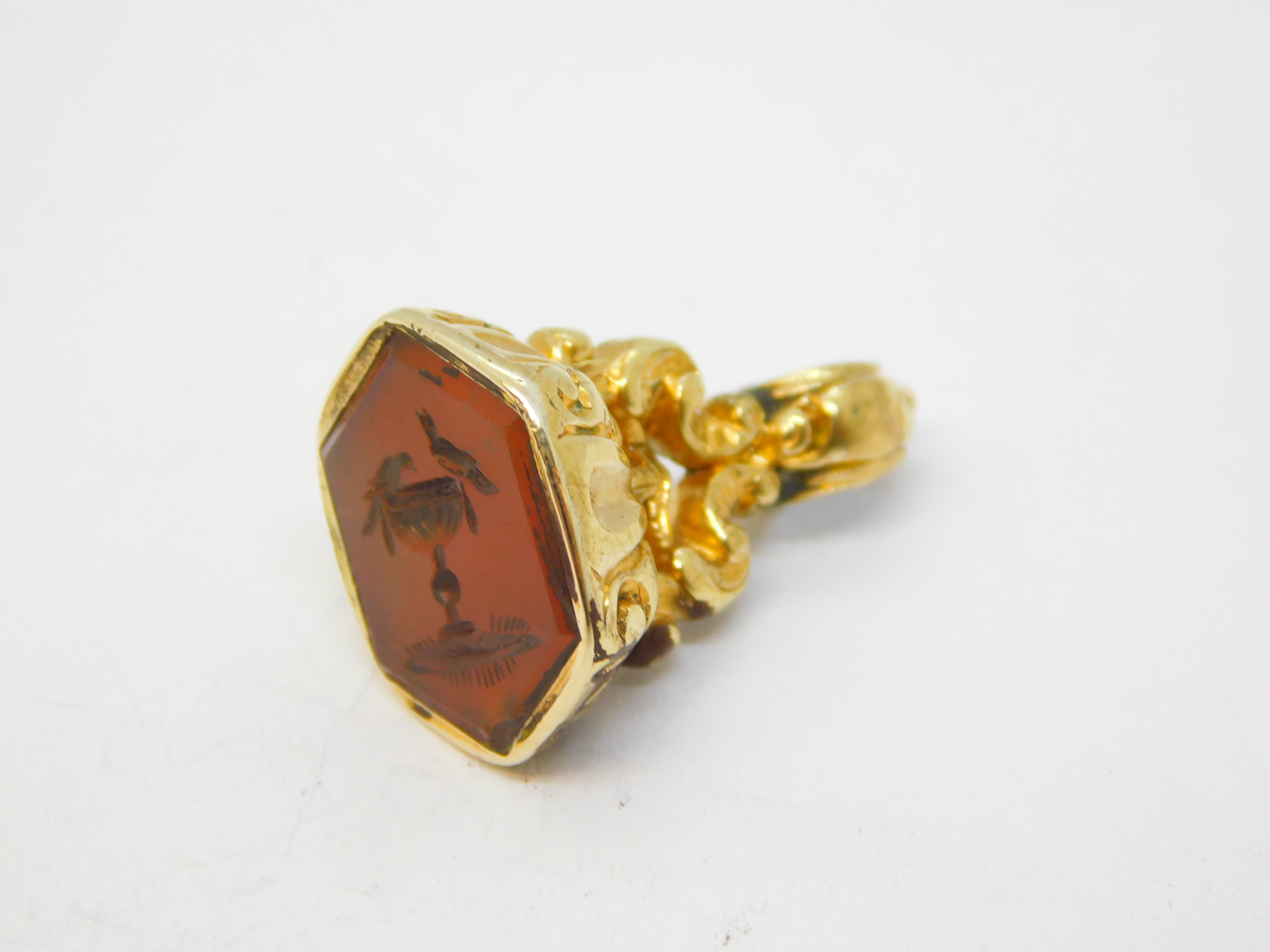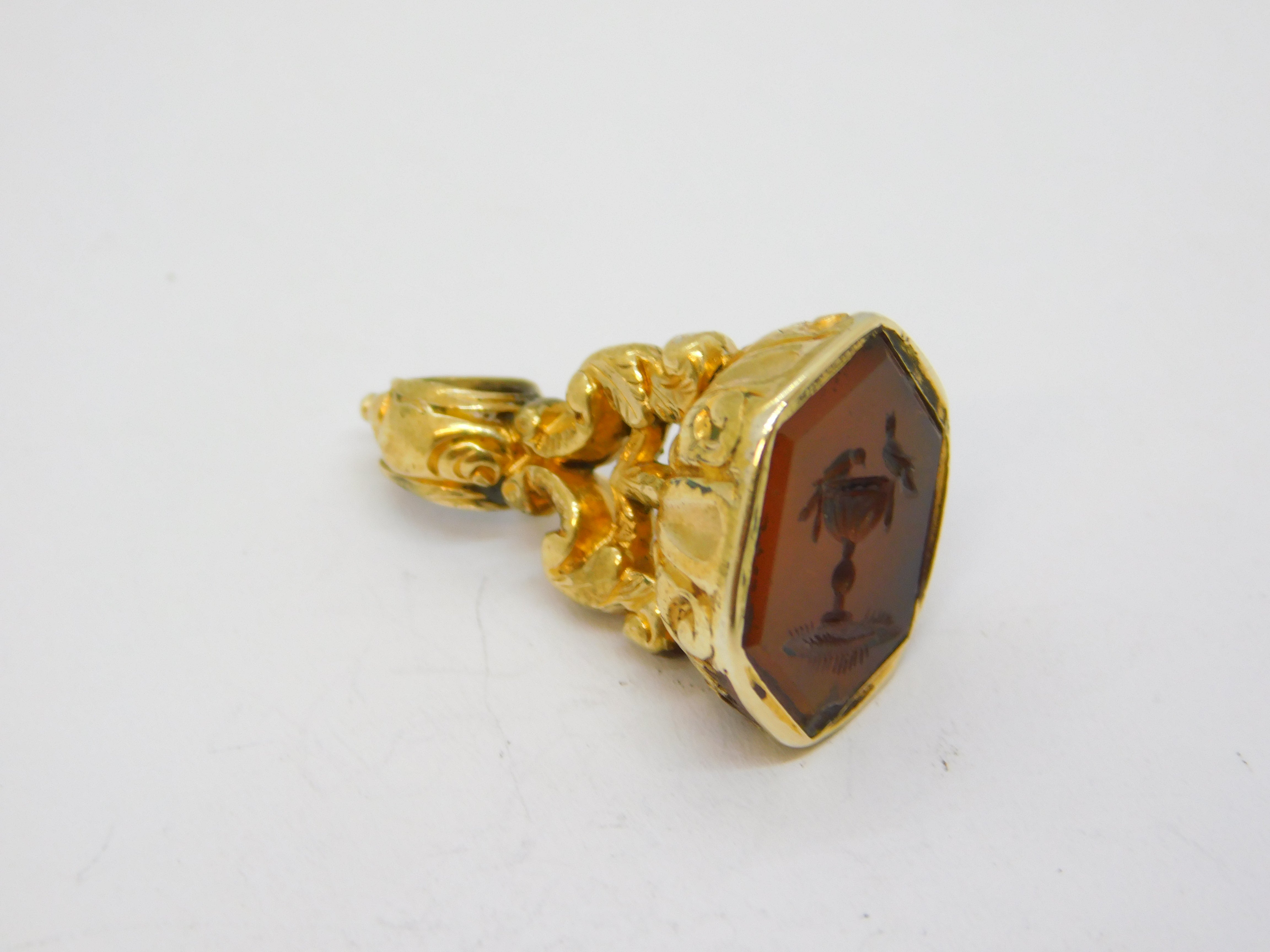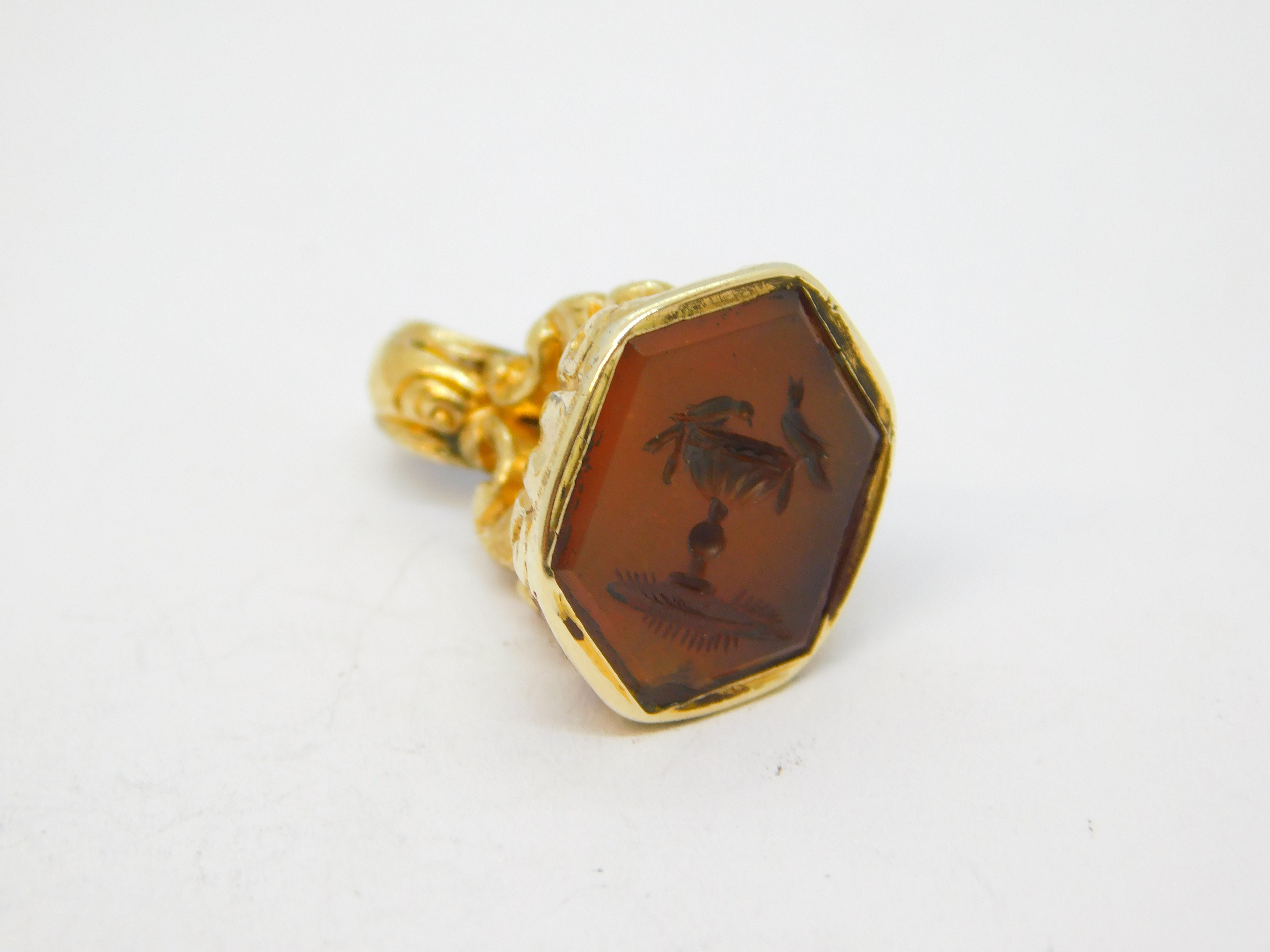 Details: A fantastic and wonderfully designed antique georgian 9ct yellow gold cased floral pattern fob seal set with carved carnelian agate intaglio depicting the Pliny Doves c1820, the gold has been XRF tested, the casing implies the gold is cased on base metal. This is a wonderful item that would make a perfect gift or addition to any collection. We are more than happy to provide XRF reports for items upon request.