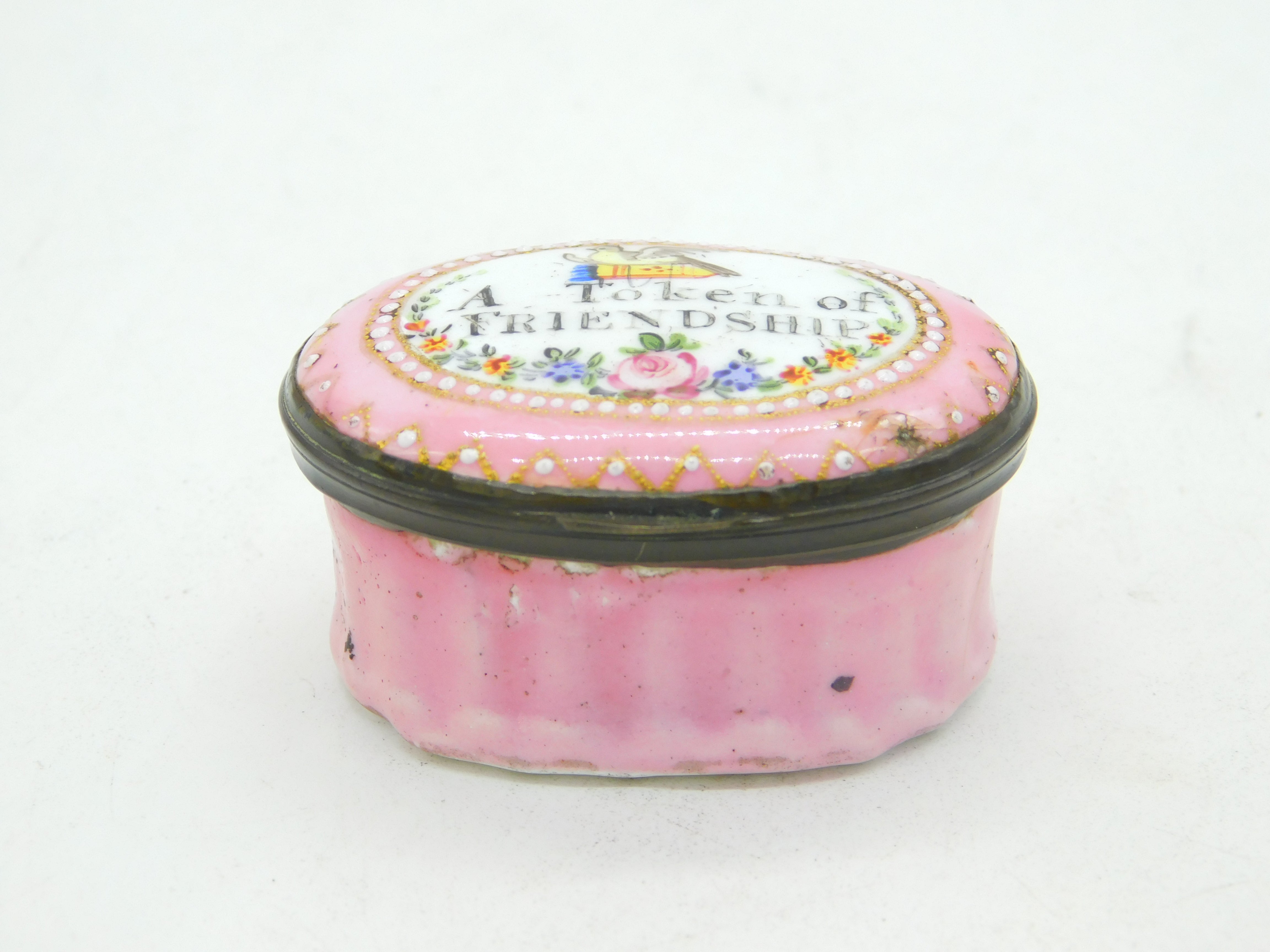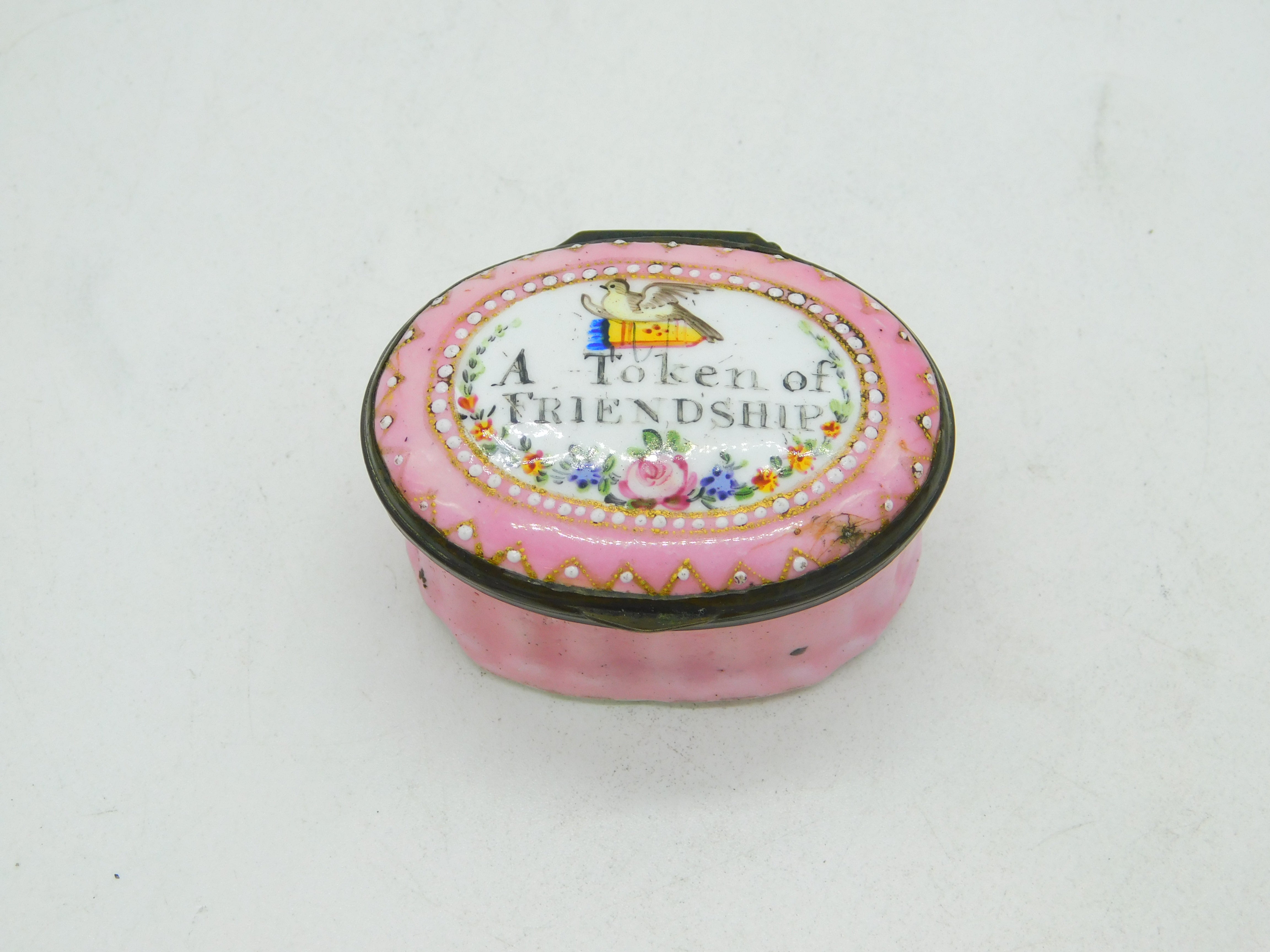Georgian Bilston Enamel 'A Token of Friendship' Patch Box Antique c1760s