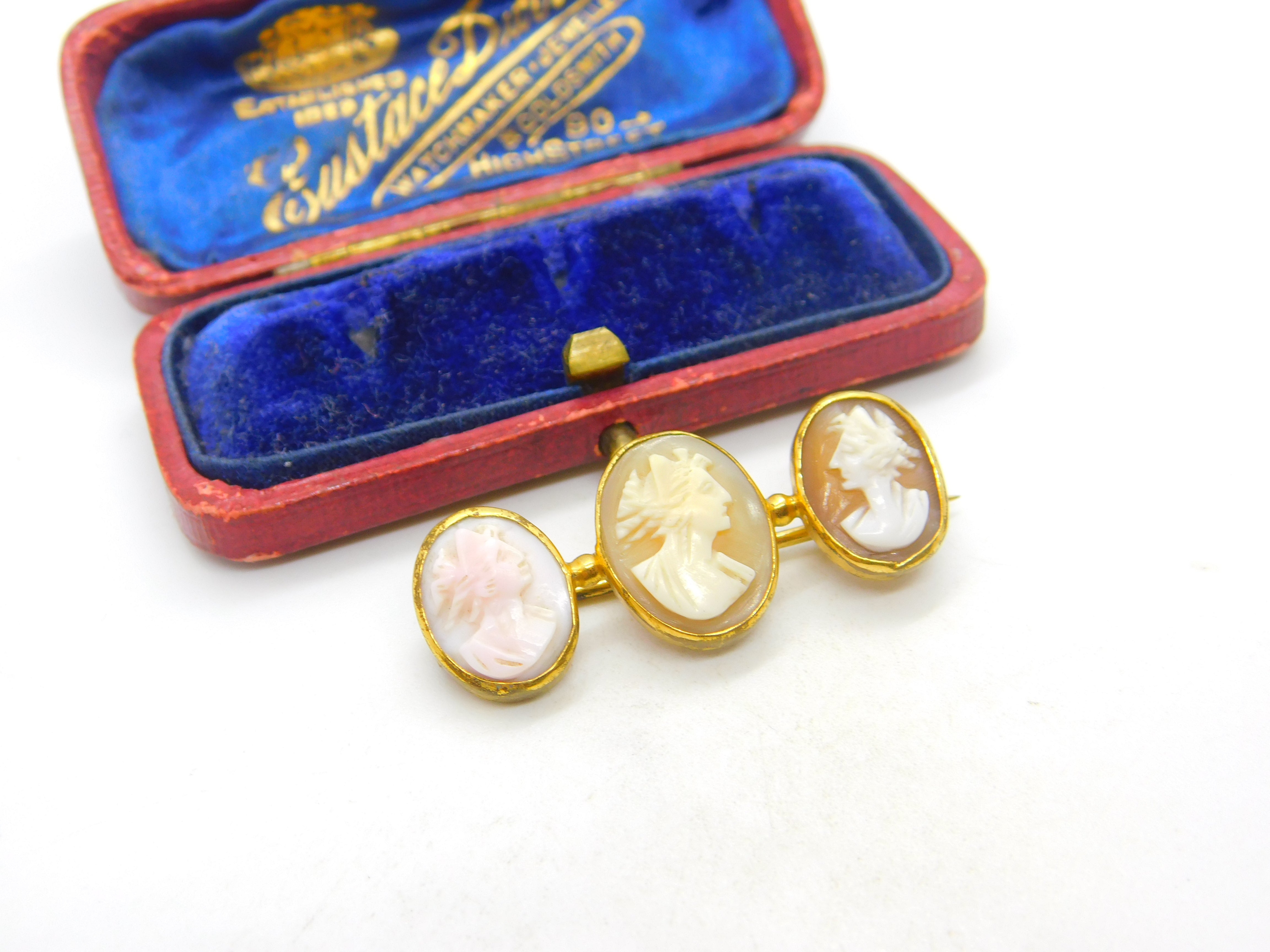 Details: A fantastic and wonderfully designed antique Georgian rolled gold carved shell cameo triple cameo brooch with lovely design c1800. This is a wonderful item that would make a perfect gift or addition to any collection. The BOX pictured is for PRESENTATION ONLY and is NOT included in the listings but used to frame the pictures unless specifically stated otherwise.