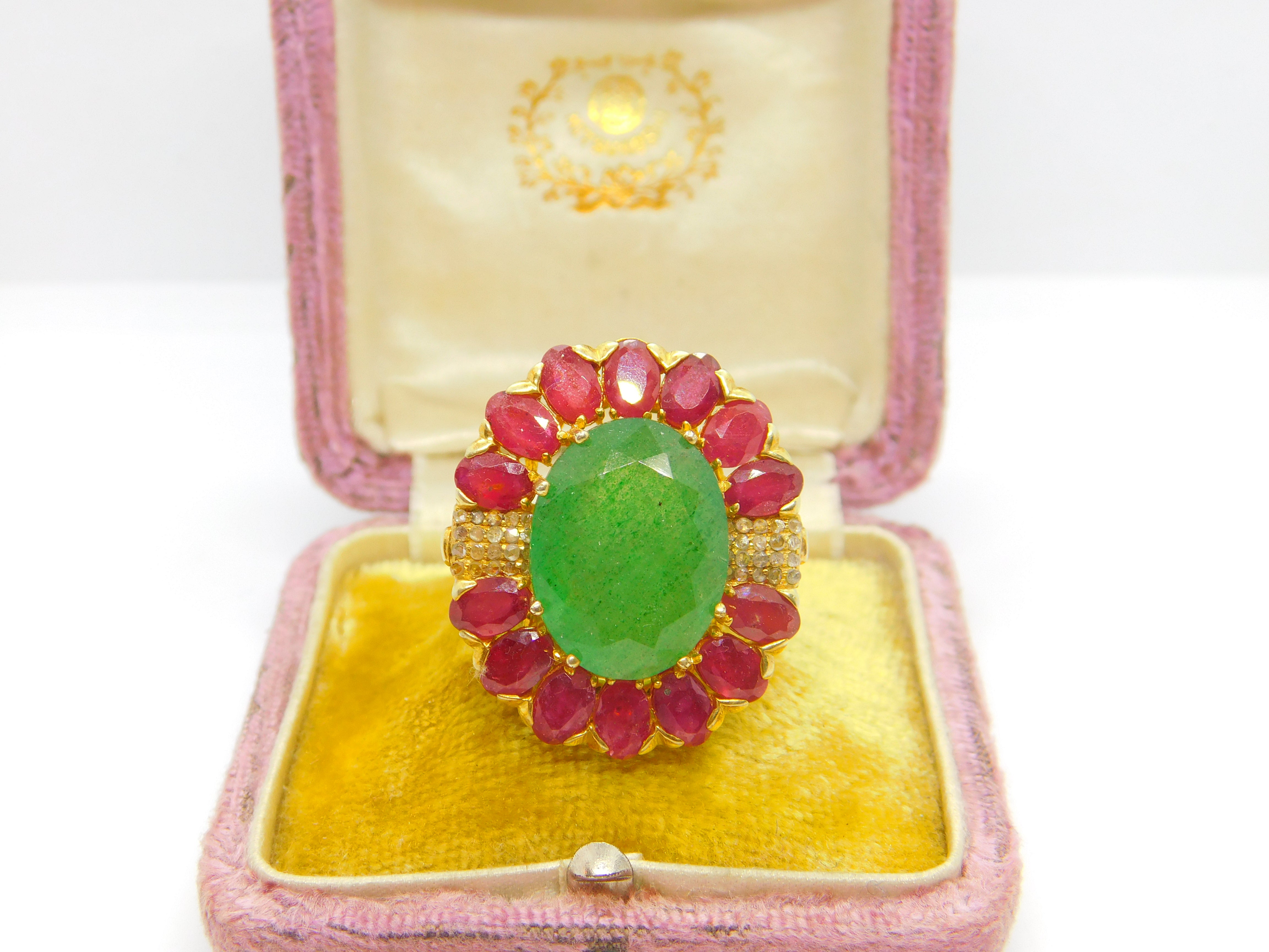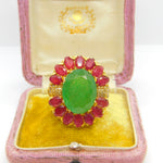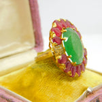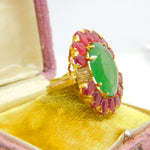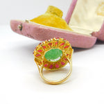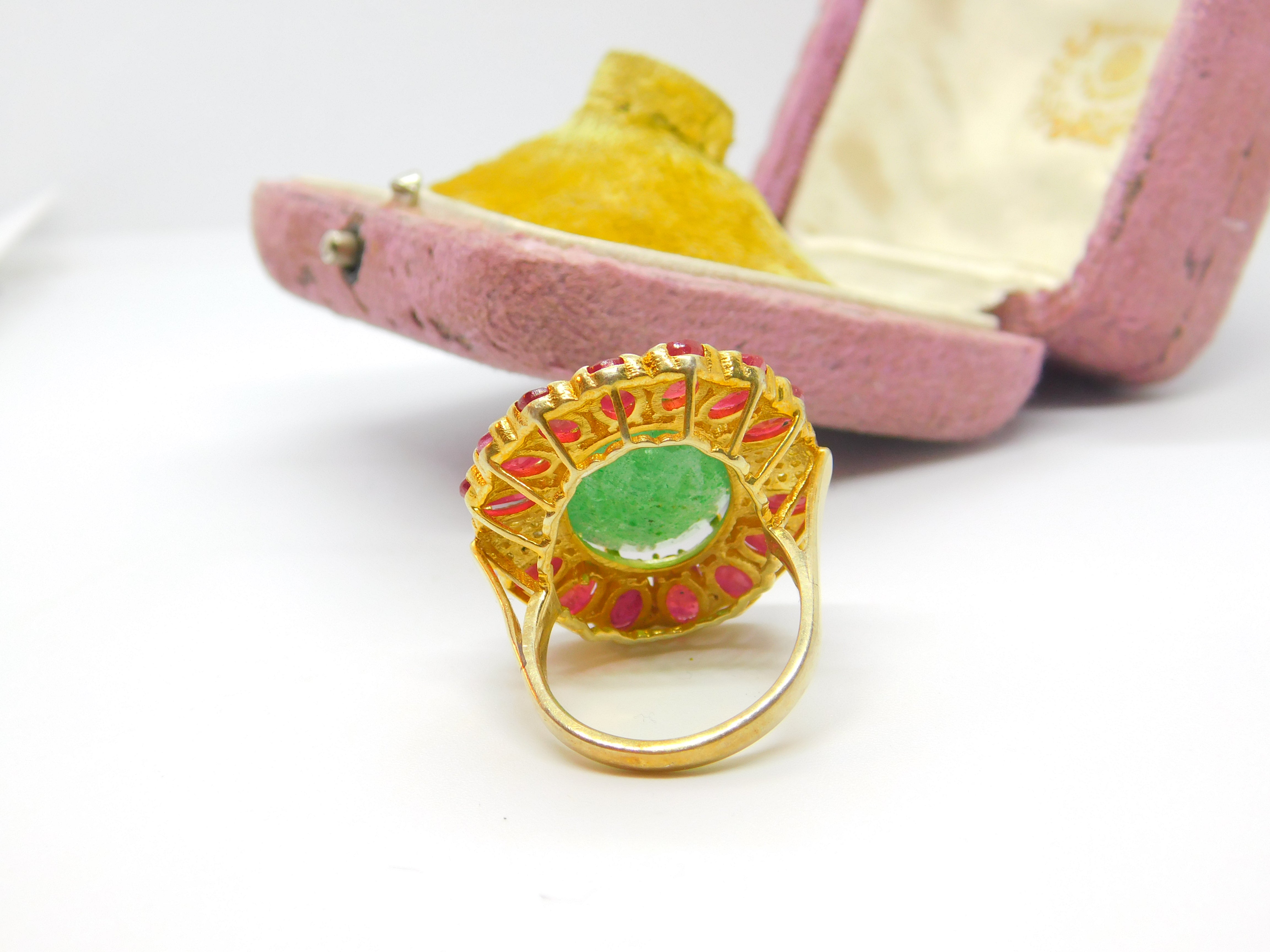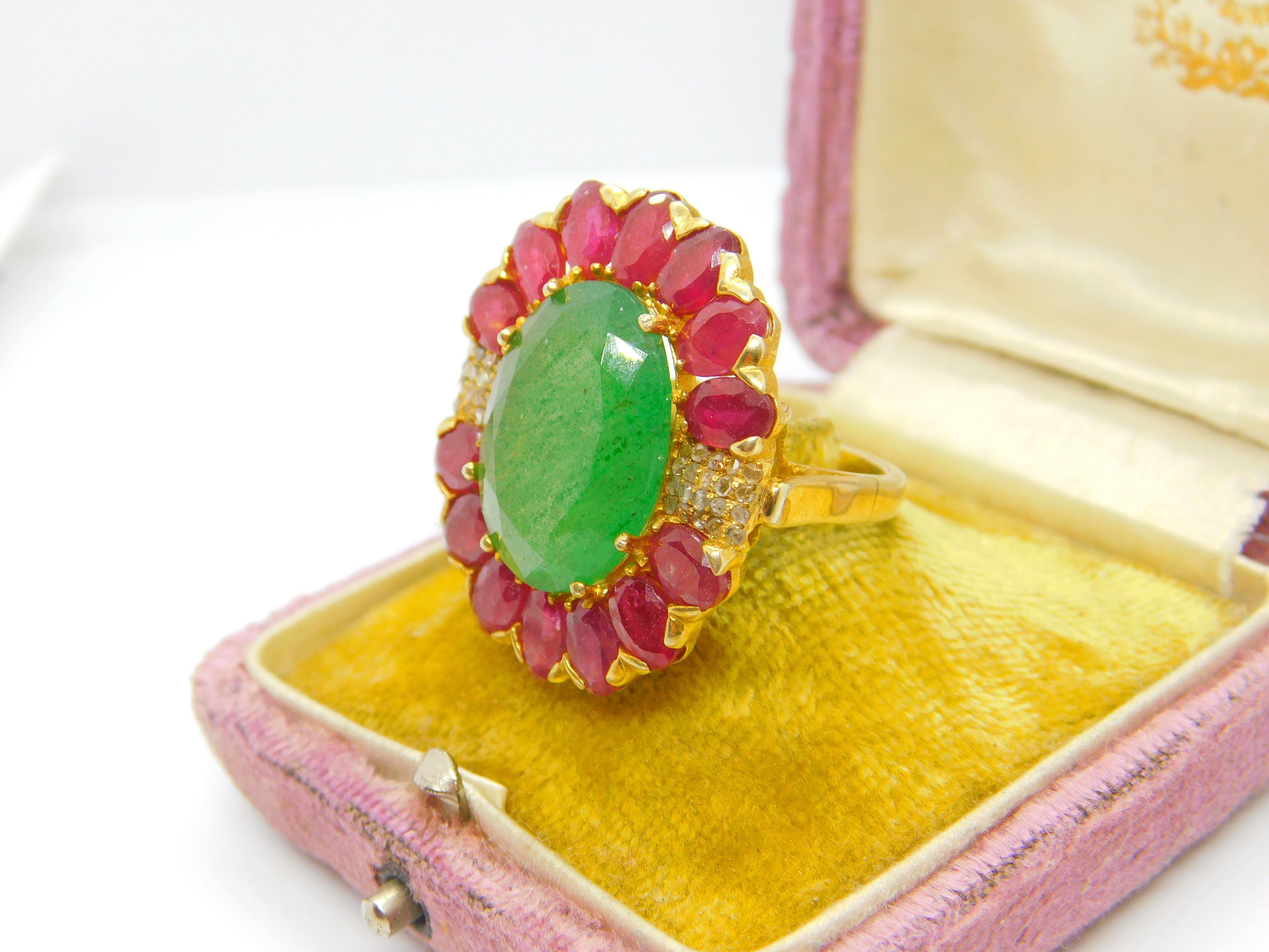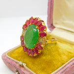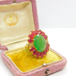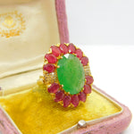 Large 9ct Gold, Jadeite, Ruby & Diamond Floral Statement Ring Vintage c1980