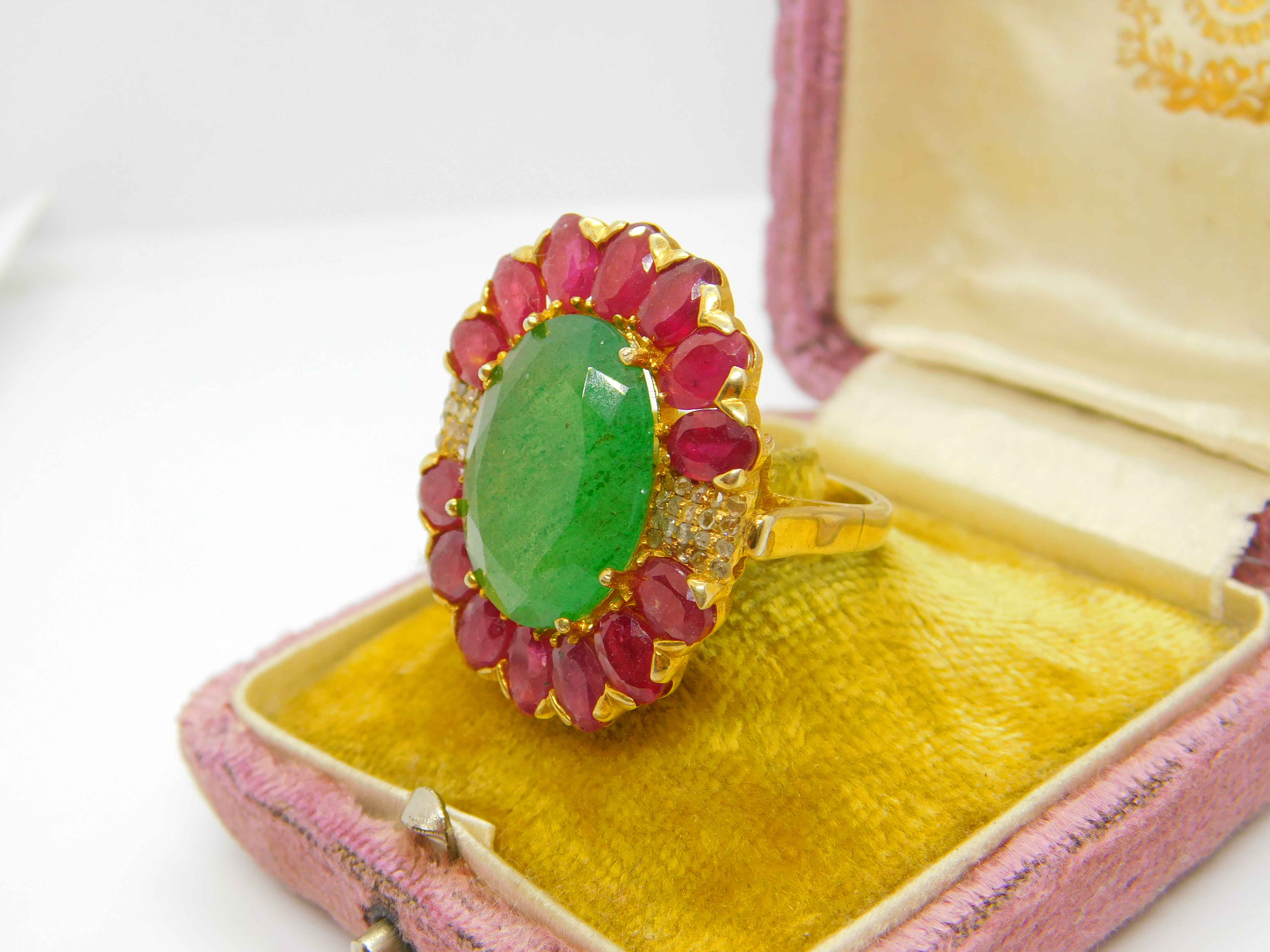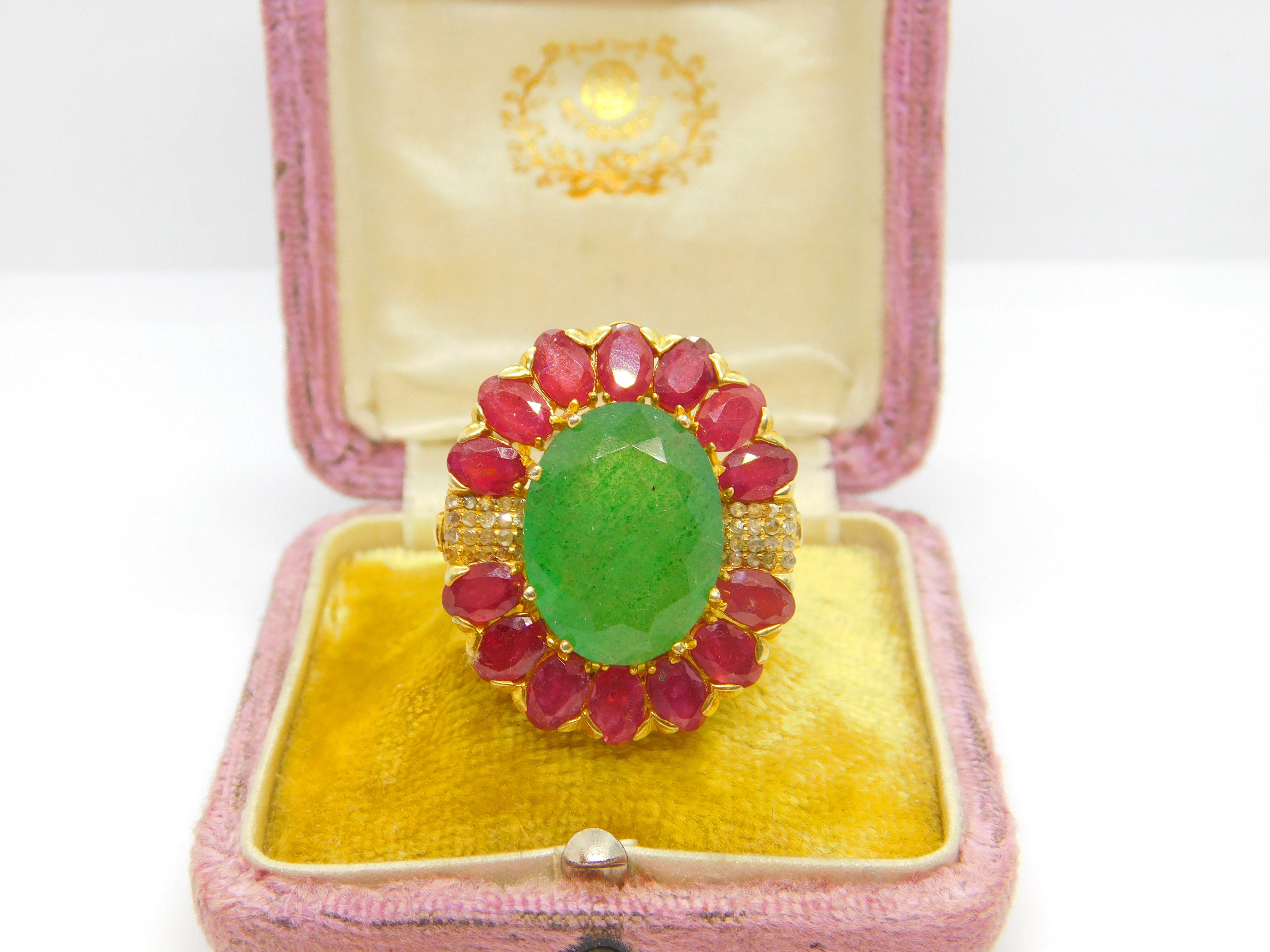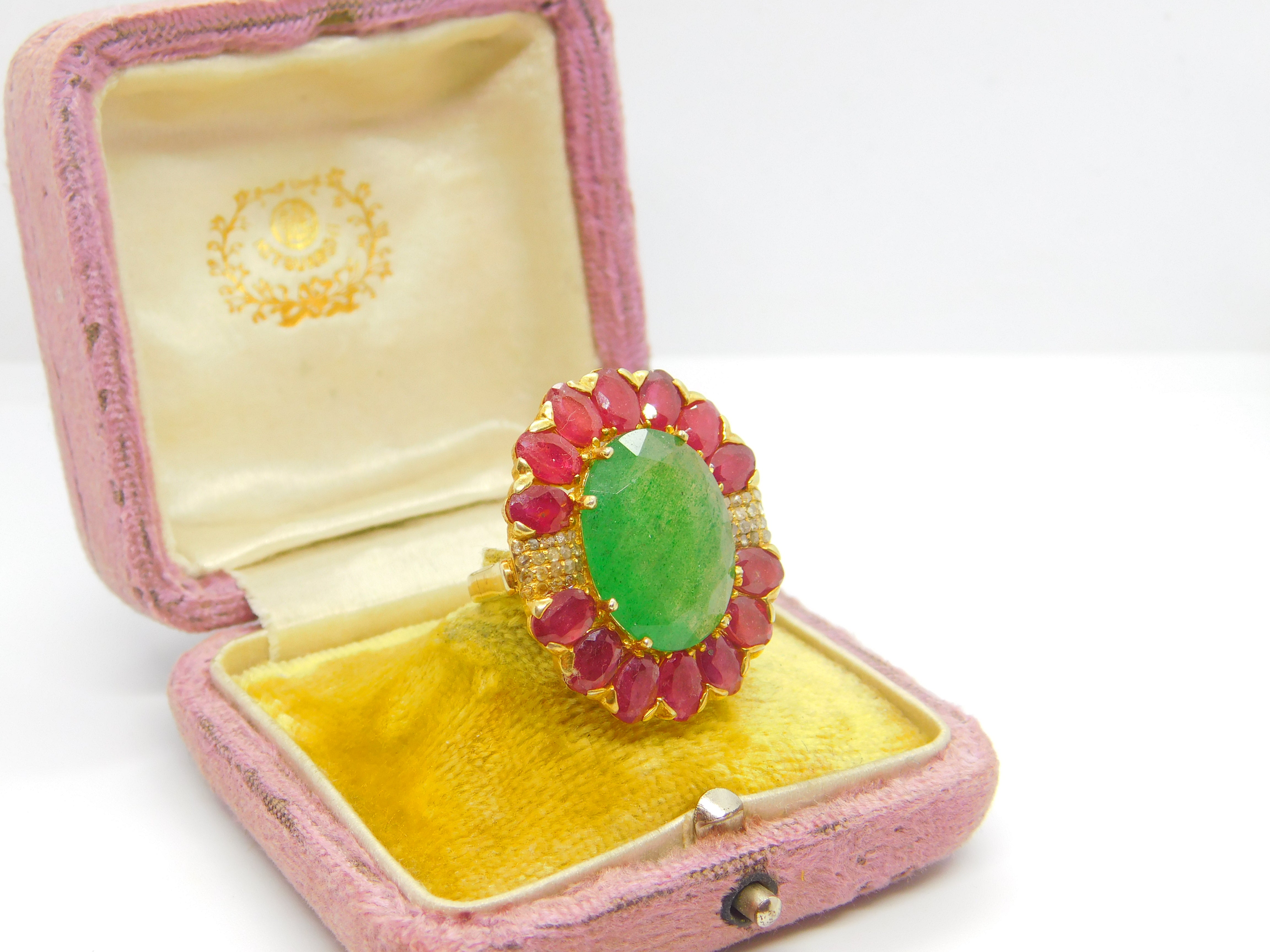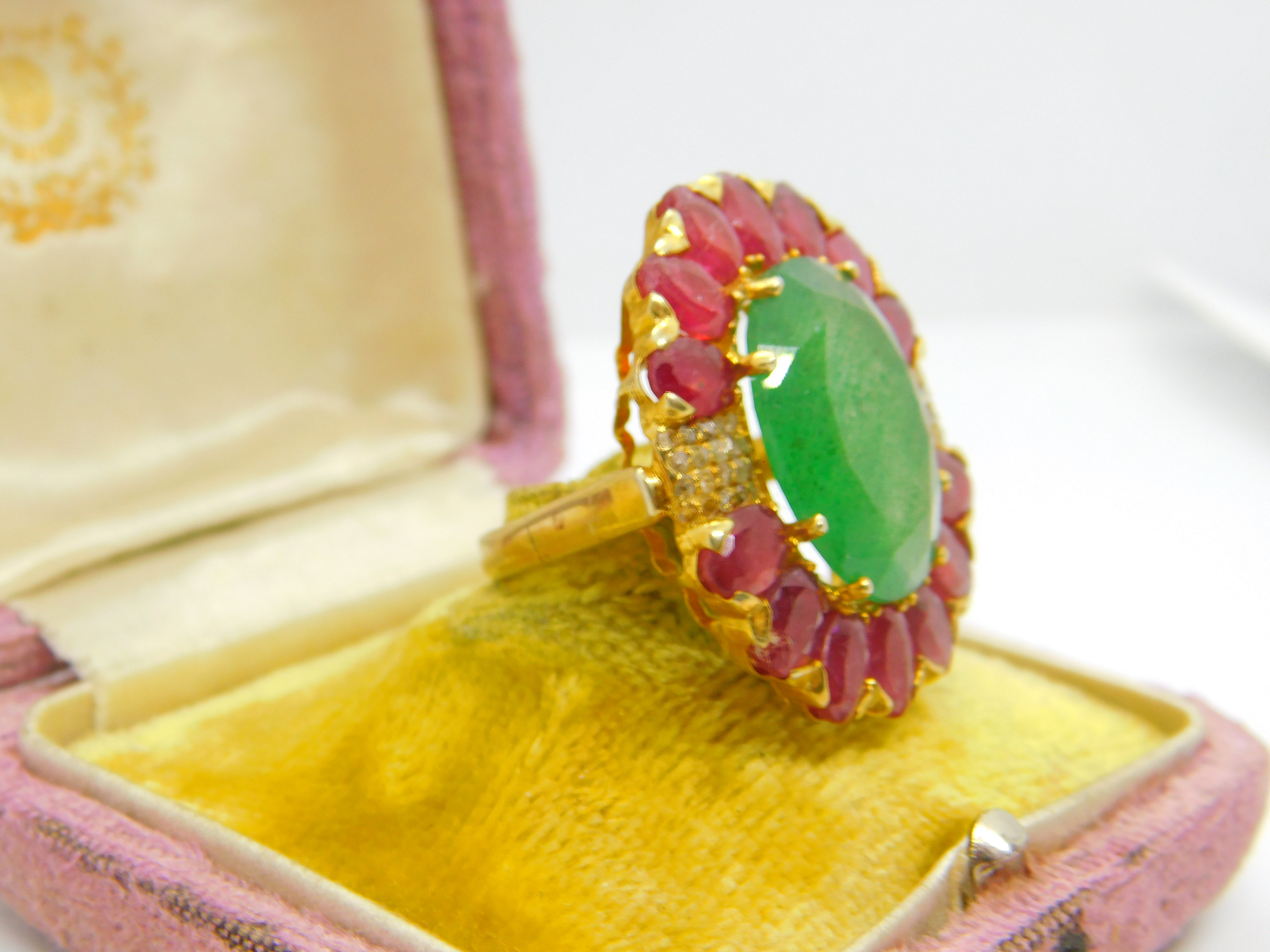 Large 9ct Gold, Jadeite, Ruby & Diamond Floral Statement Ring Vintage c1980