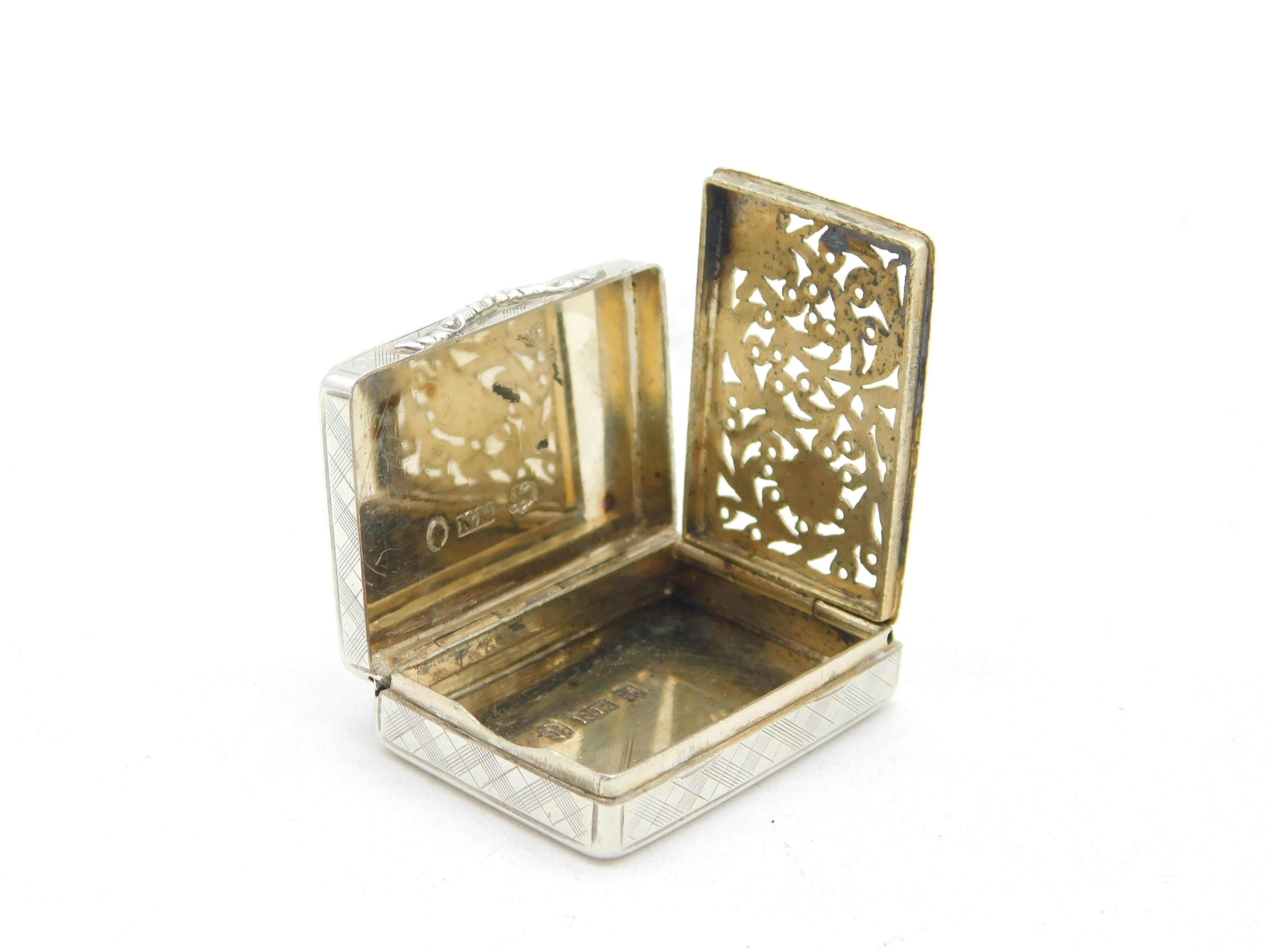 Details: A fantastic and wonderfully designed antique early-Victorian sterling silver crossed pattern vinaigrette, gilded to the interior with ornate floral vinaigrette, hallmarked for Birmingham 1838 by important maker Nathaniel Mills. This is a wonderful item that would make a perfect gift or addition to any collection. We are more than happy to provide XRF reports for items upon request.