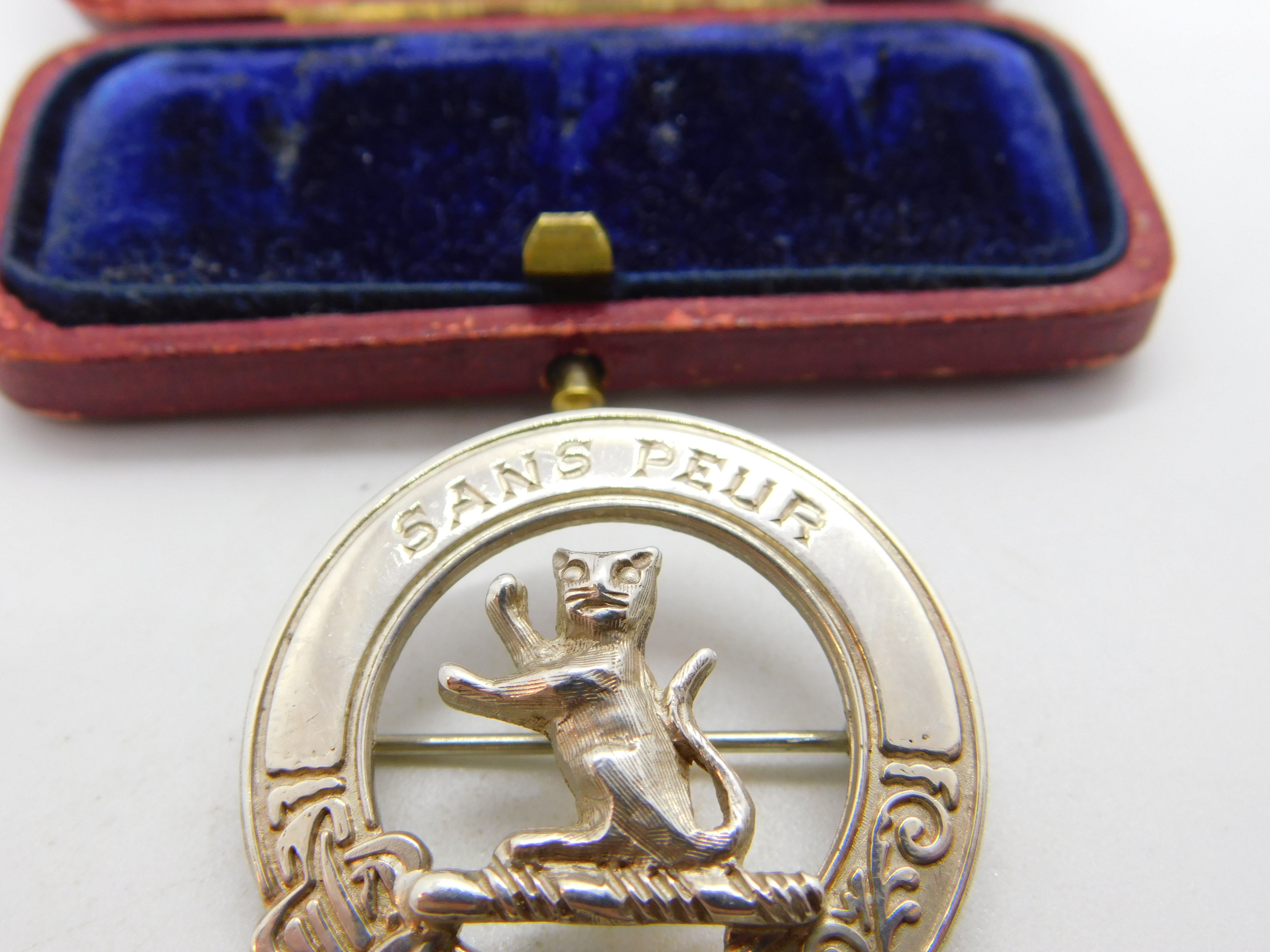 Details: A fantastic and wonderfully designed vintage Scottish sterling silver clan brooch with dancing tiger and Sans Peur or Without Fear written to the top hallmarked Edinburgh 1985. This is a wonderful item that would make a perfect gift or addition to any collection. The BOX pictured is for PRESENTATION ONLY and is NOT included in the listings but used to frame the pictures unless specifically stated otherwise.