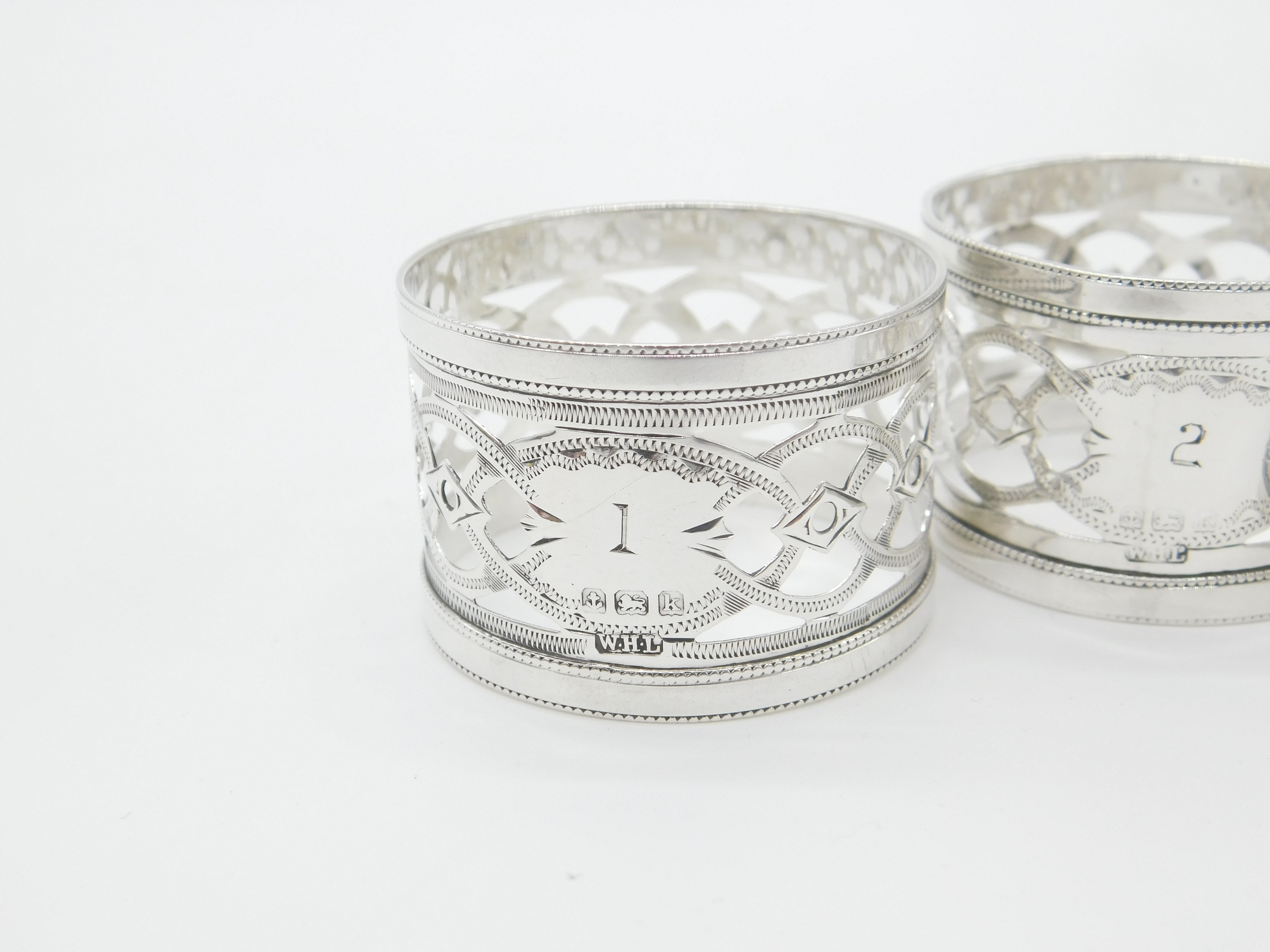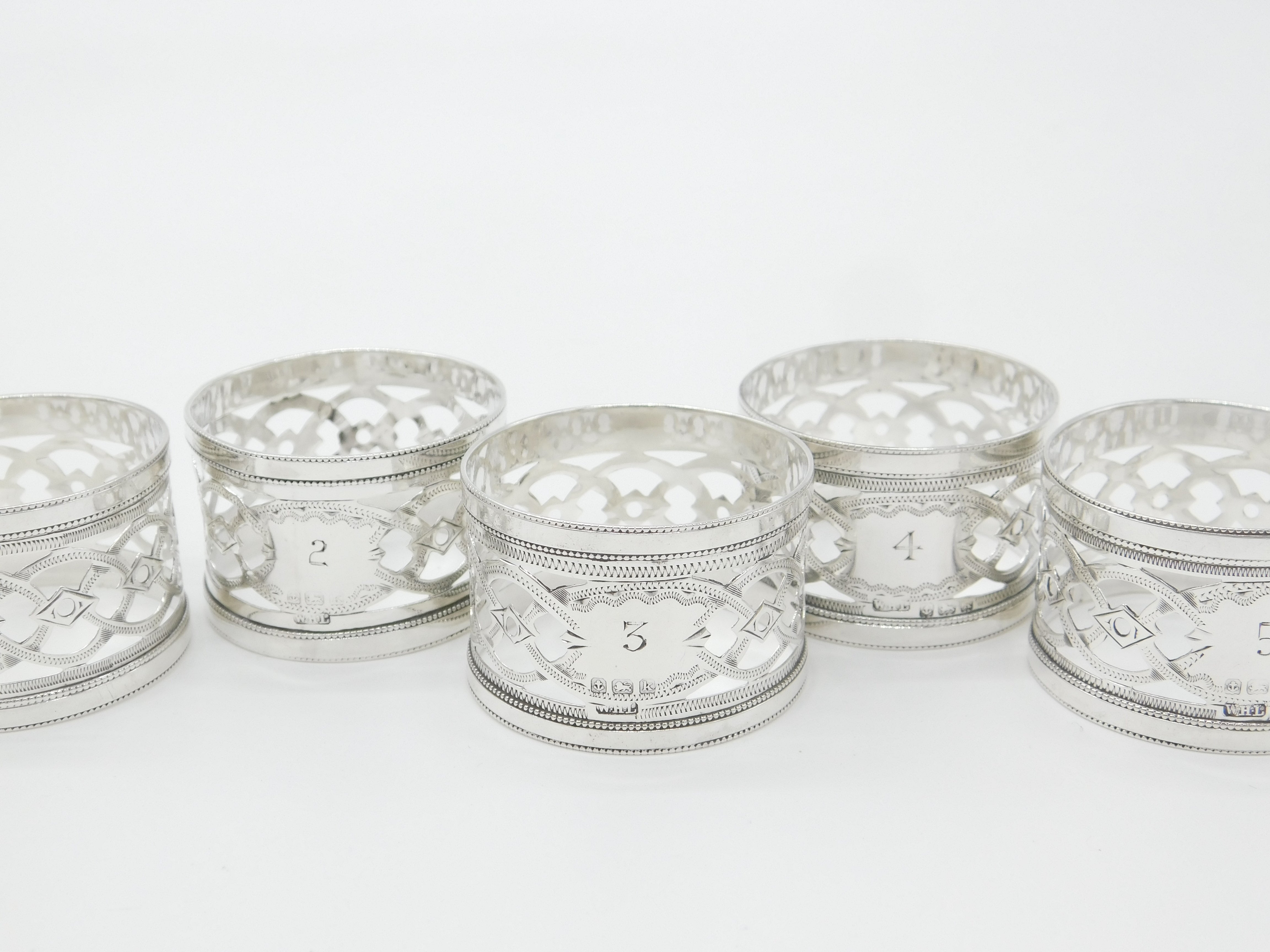Details: A fantastic and wonderfully designed set of five antique Edwardian sterling silver pierced napkin rings numbered 1,2,3,4,5, hallmarked Birmingham 1909 by William Henry Leather. This is a wonderful item that would make a perfect gift or addition to any collection. The BOX pictured is for PRESENTATION ONLY and is NOT included in the listings but used to frame the pictures unless specifically stated otherwise.