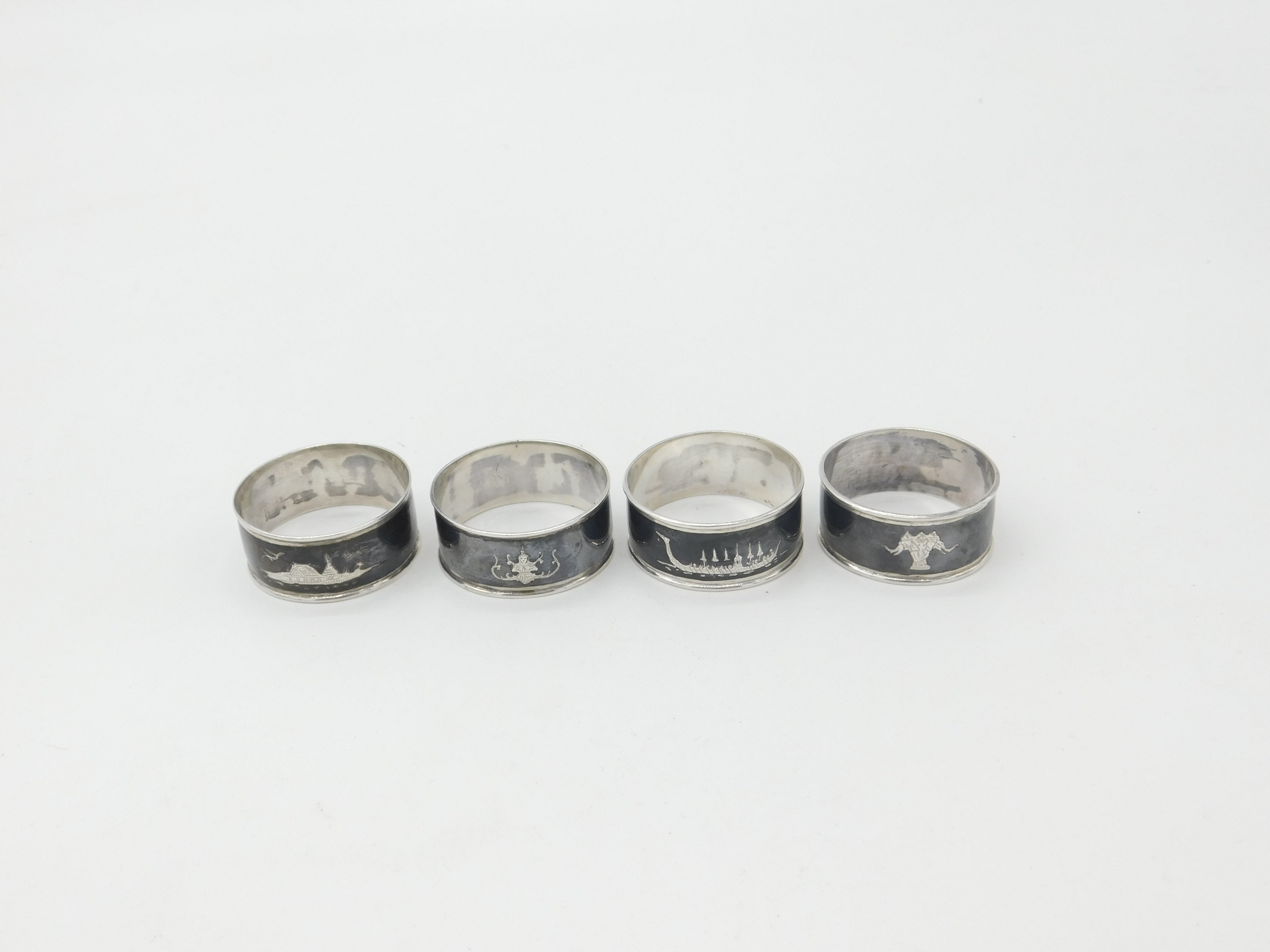 Set of Four Siam Sterling Silver Niello Enamel Napkin Ring Antique c1920