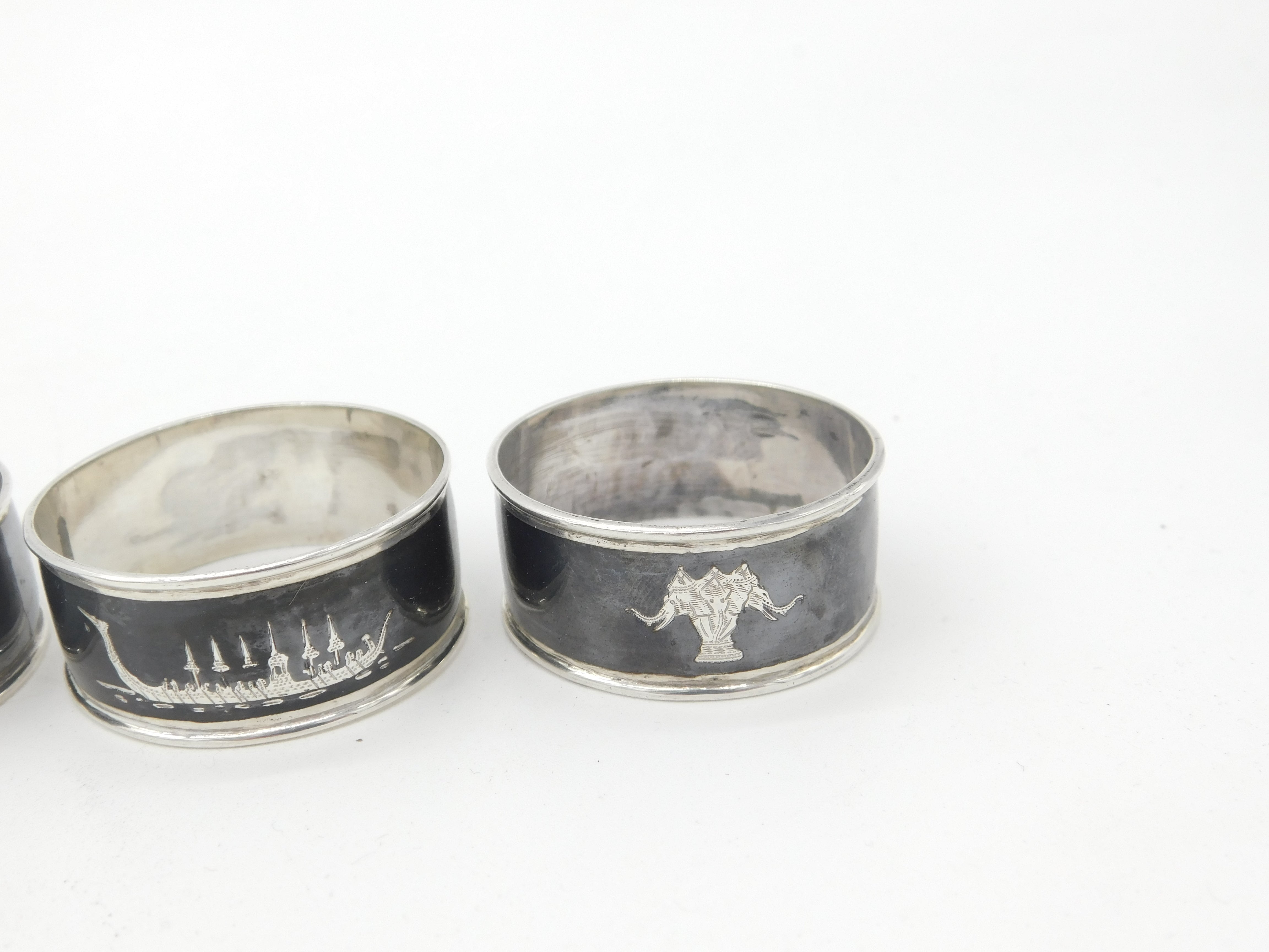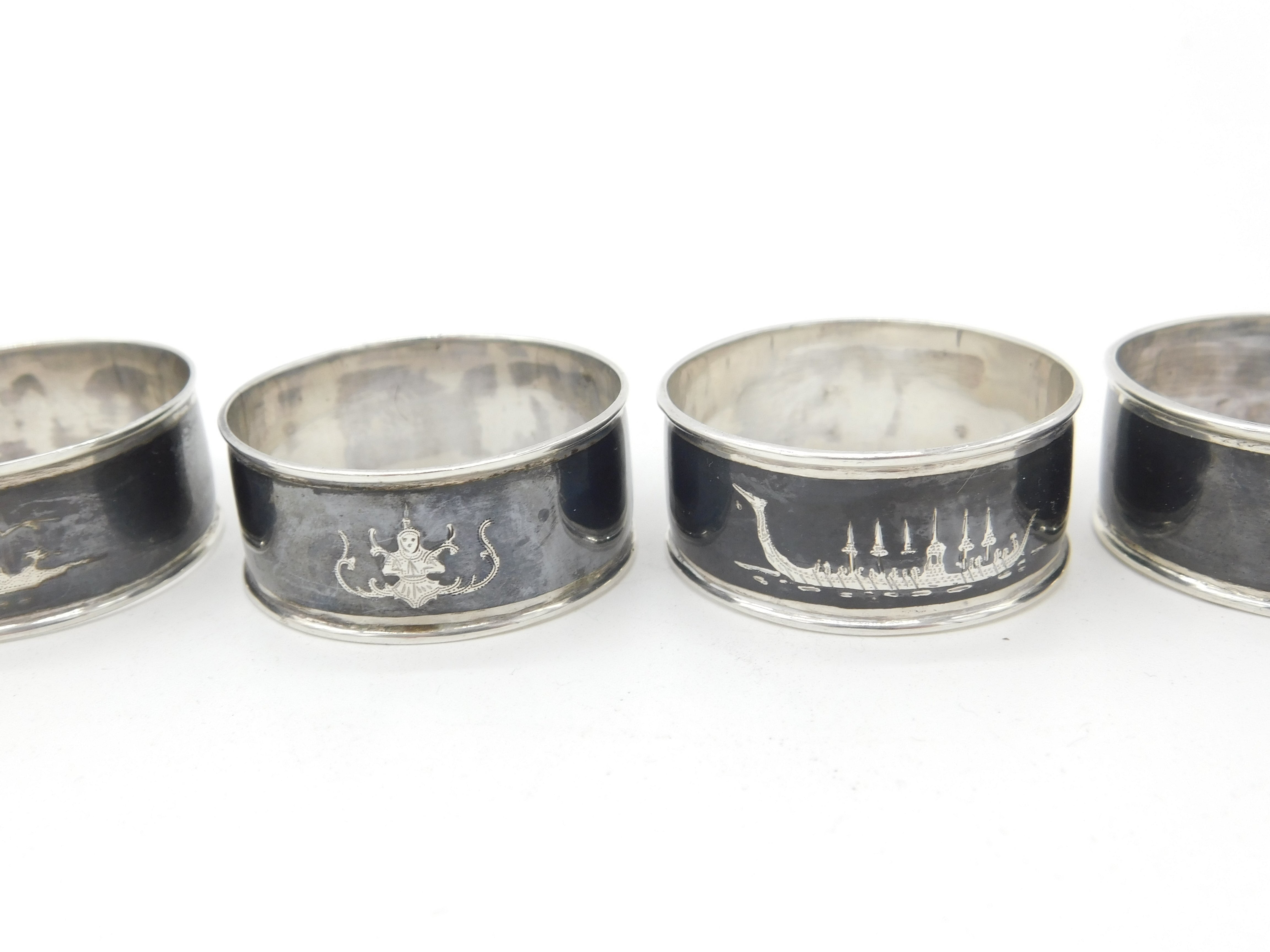 Details: A fantastic and wonderfully designed set of four antique art deco Siam sterling silver and niello enamel napkin rings each with a different cultural scene depicted c1920 hallmarked to the interior. This is a wonderful item that would make a perfect gift or addition to any collection. The BOX pictured is for PRESENTATION ONLY and is NOT included in the listings but used to frame the pictures unless specifically stated otherwise.