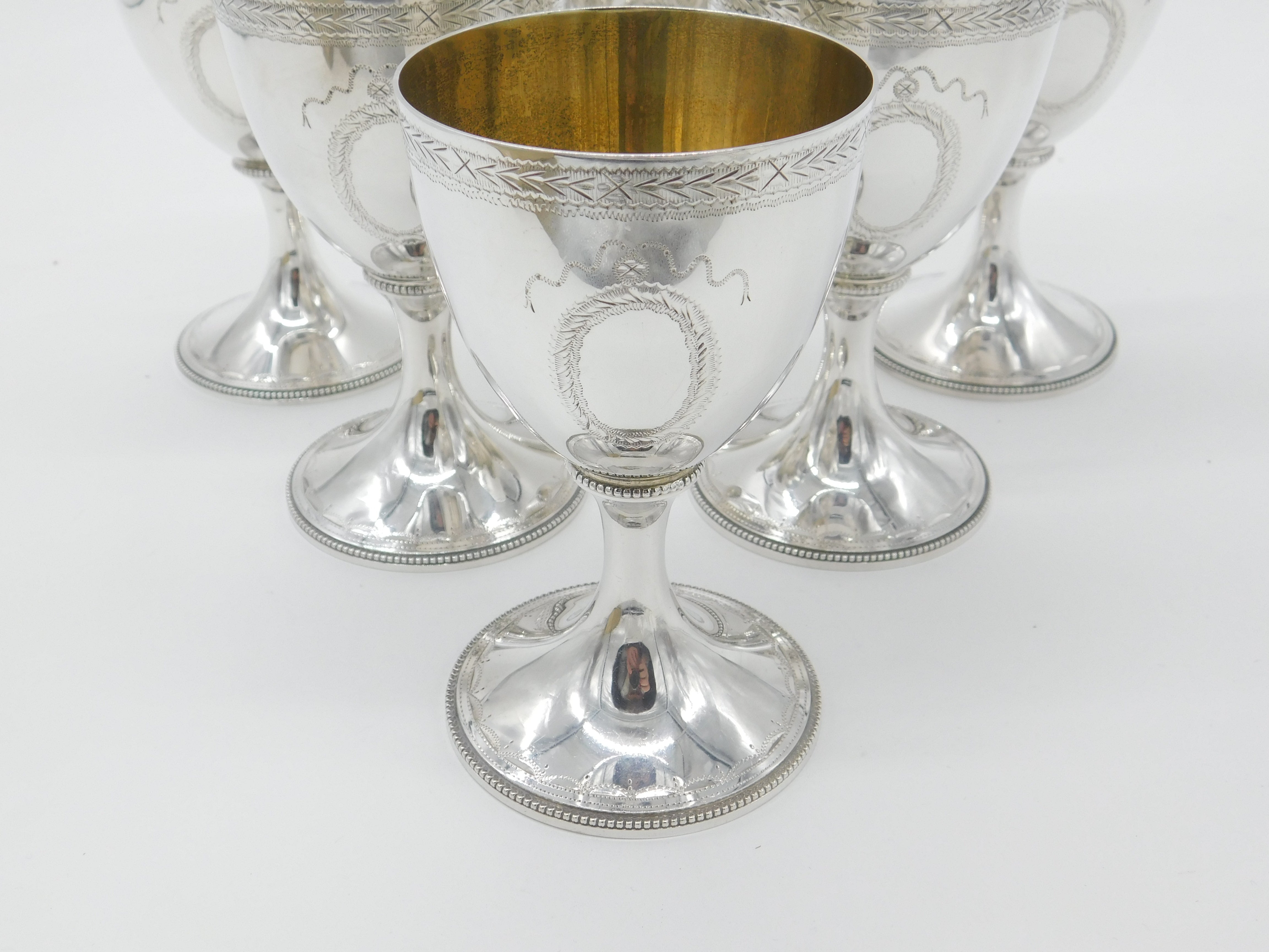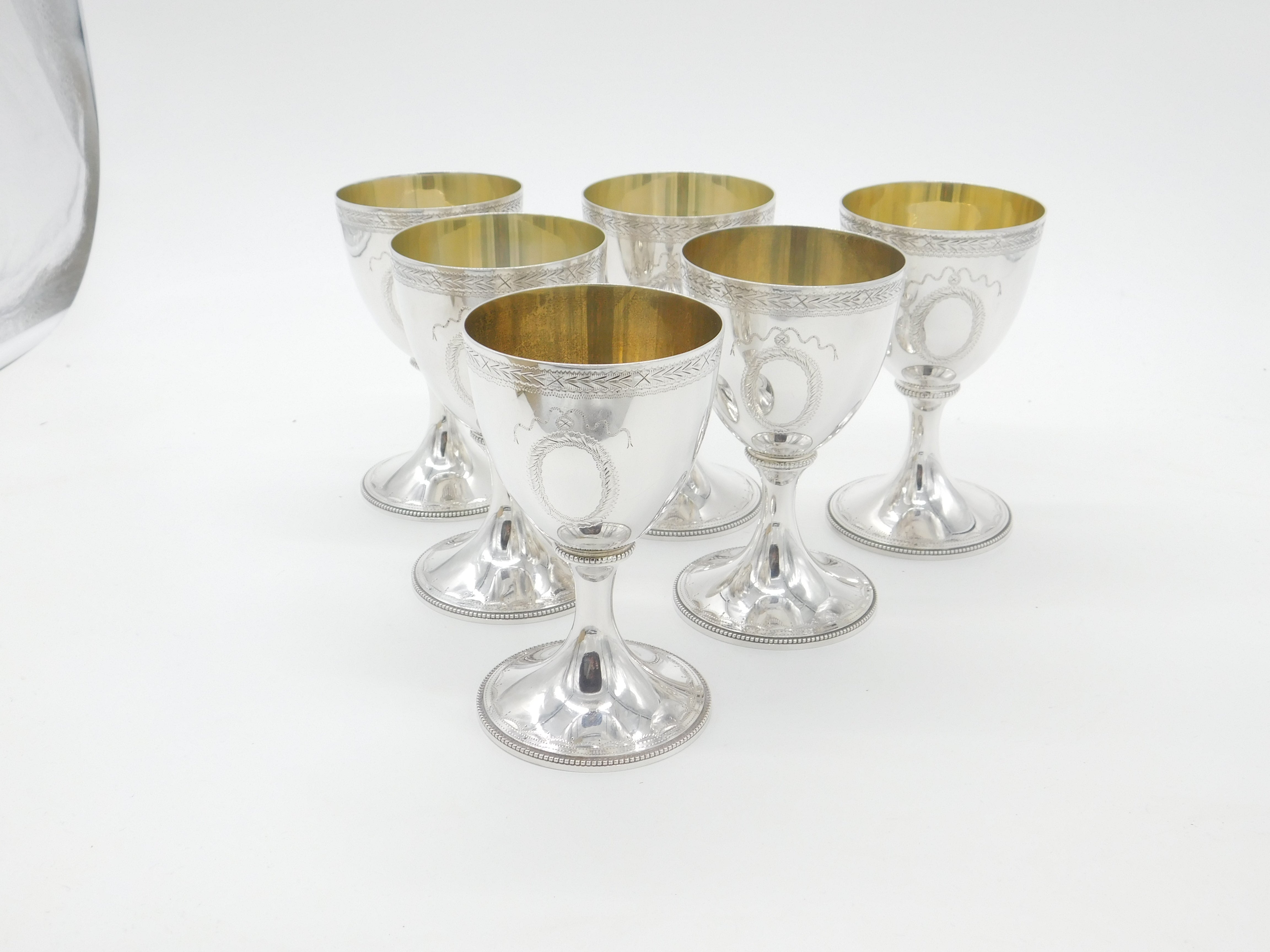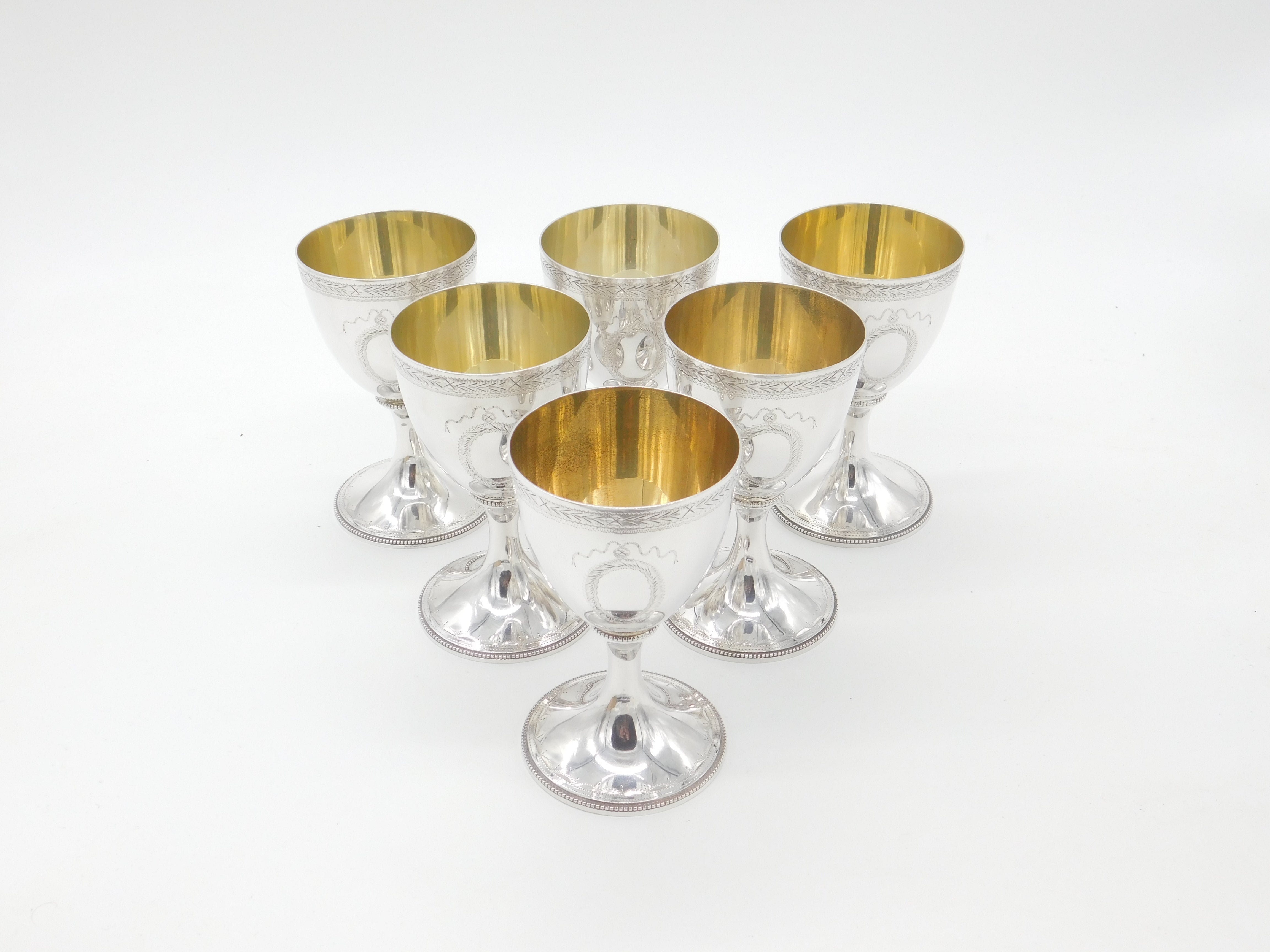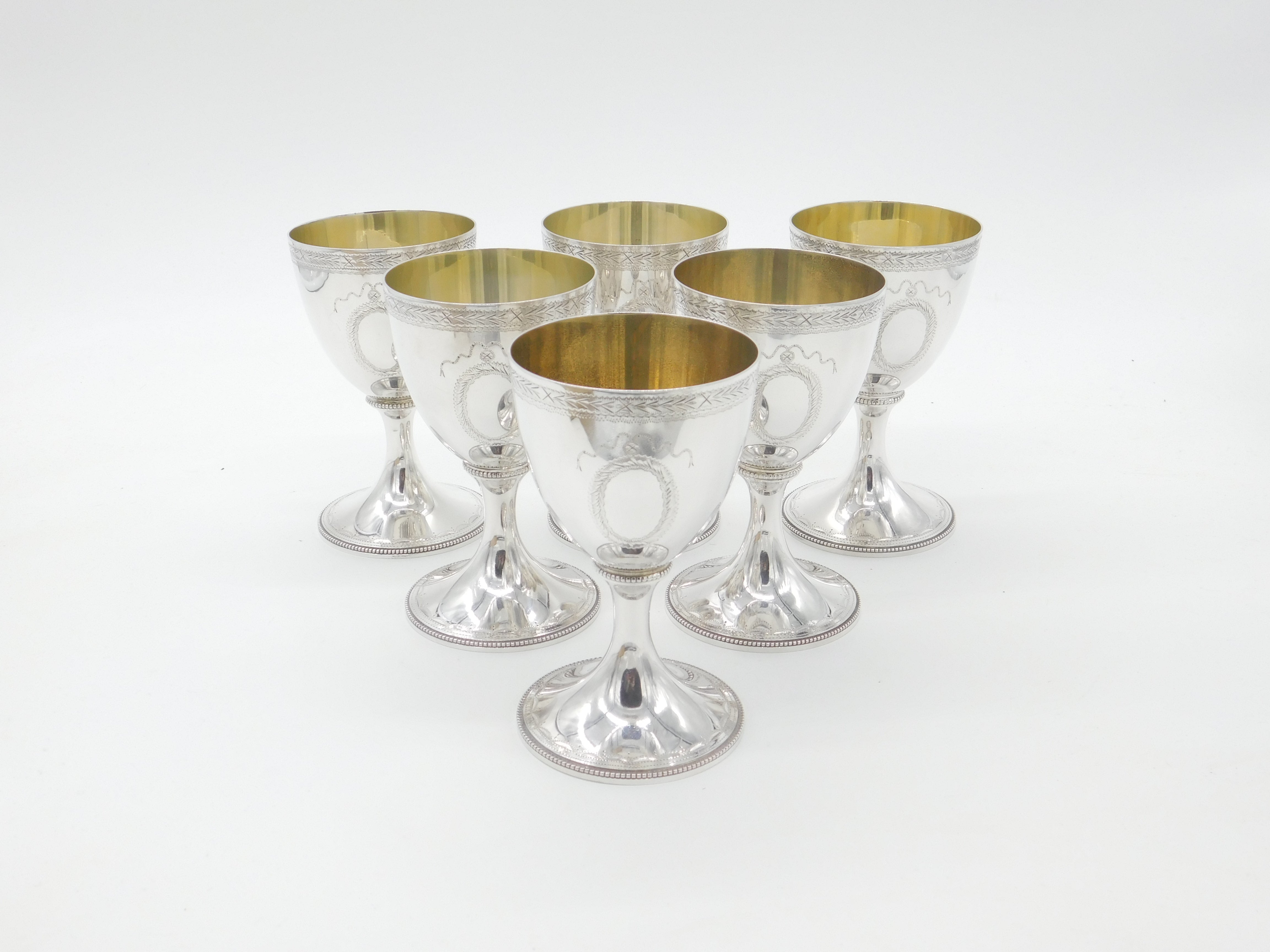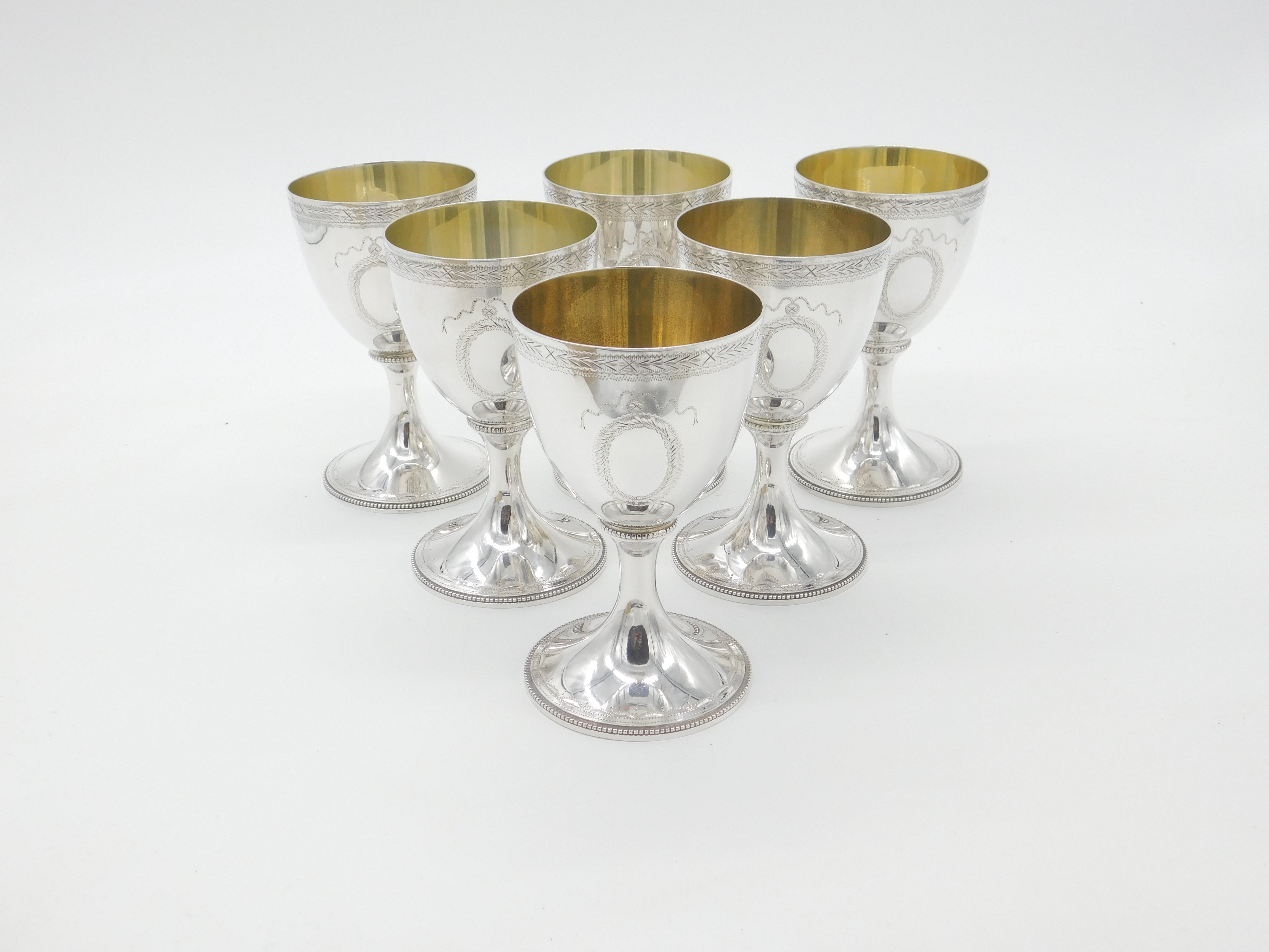 Details: A fantastic and wonderfully designed vintage set of six sterling silver wine goblets or chalices with stunning gilded interior and lovely floral cartouche each hallmarked to the base London 1968 by CJ Vander. These would make a stunning addition to any dining table. Great heavy guage and unusual to have a complete set. This is a wonderful item that would make a perfect gift or addition to any collection. The BOX pictured is for PRESENTATION ONLY and is NOT included in the listings but used to frame the pictures unless specifically stated otherwise.