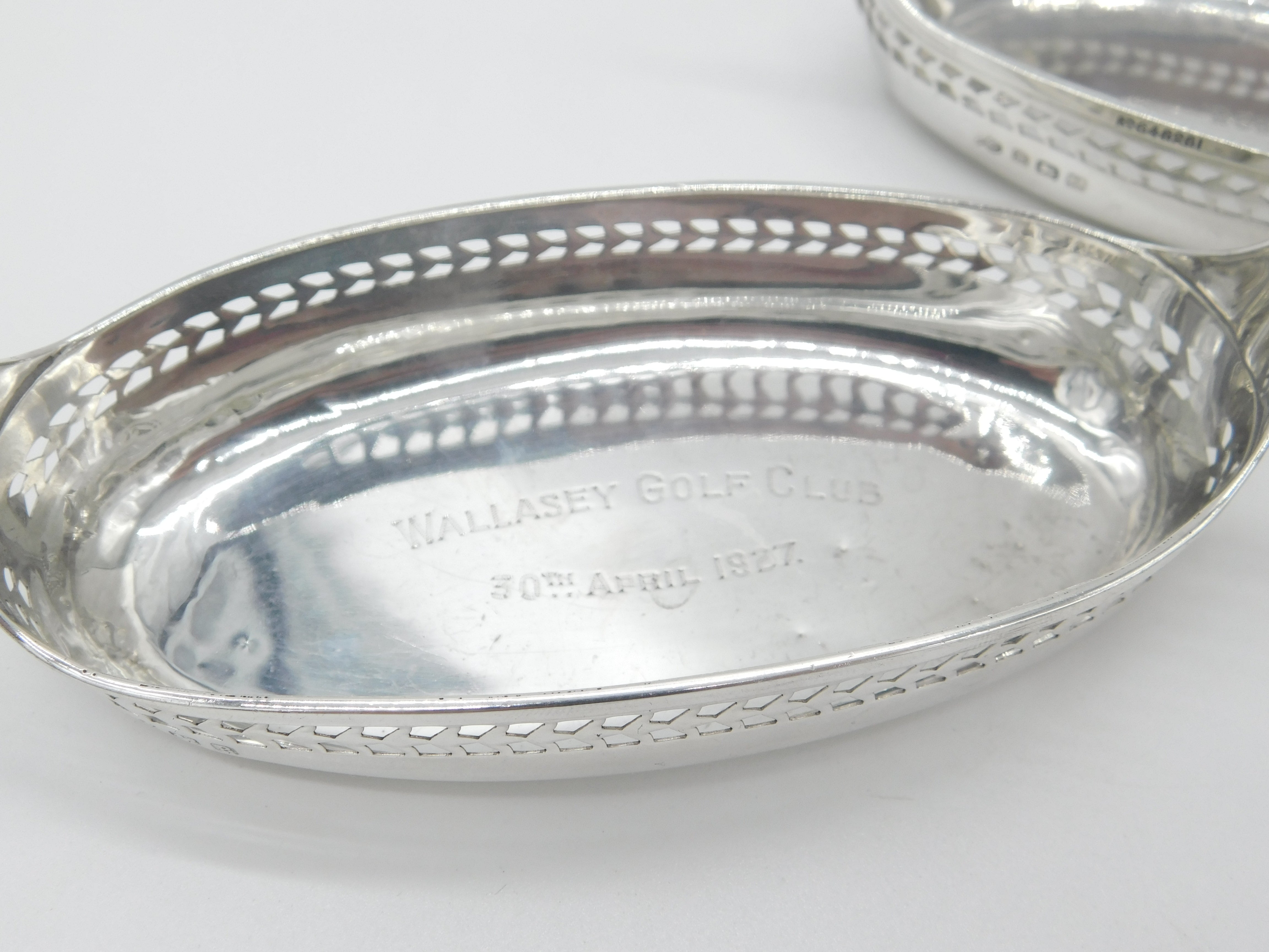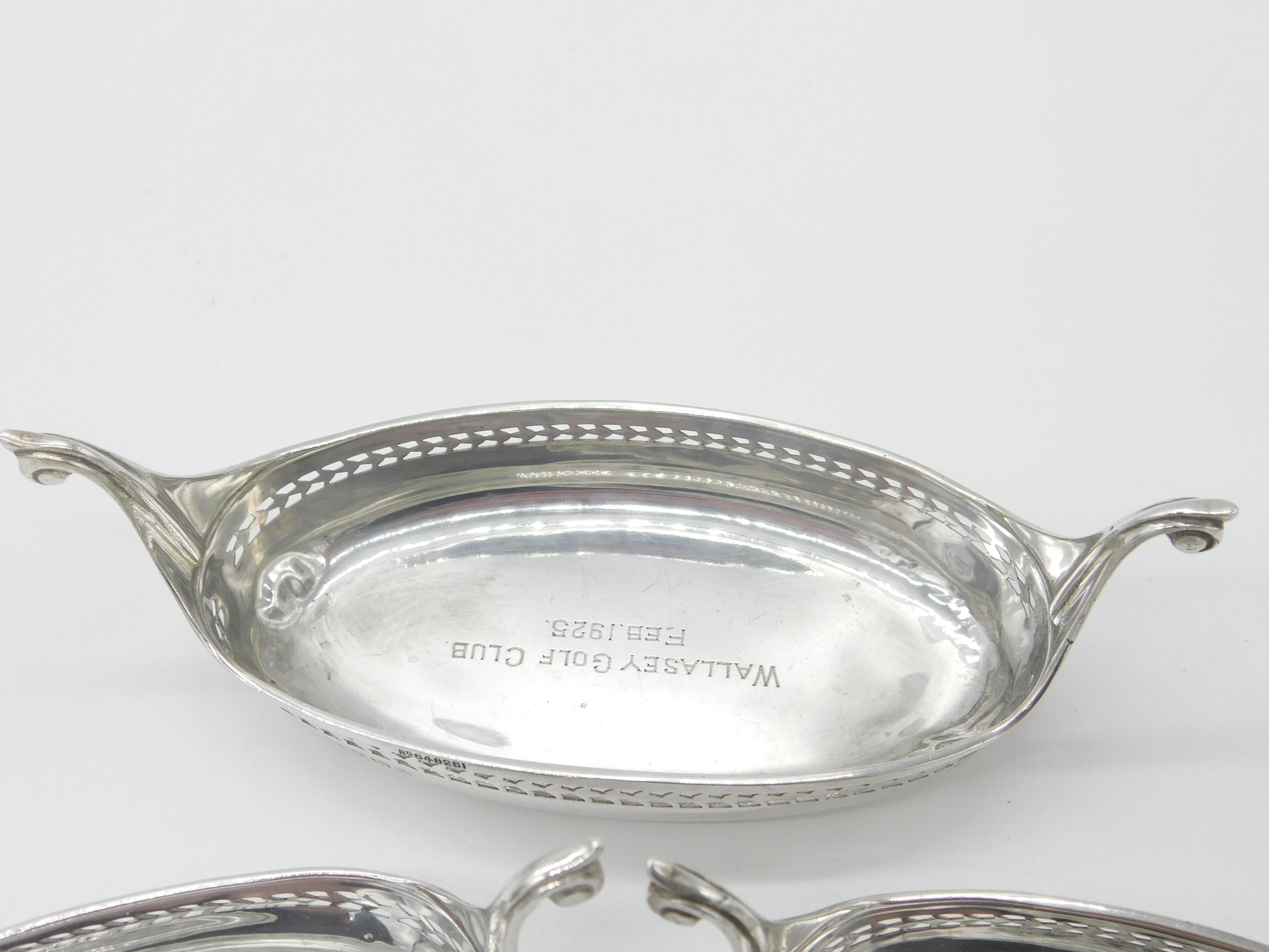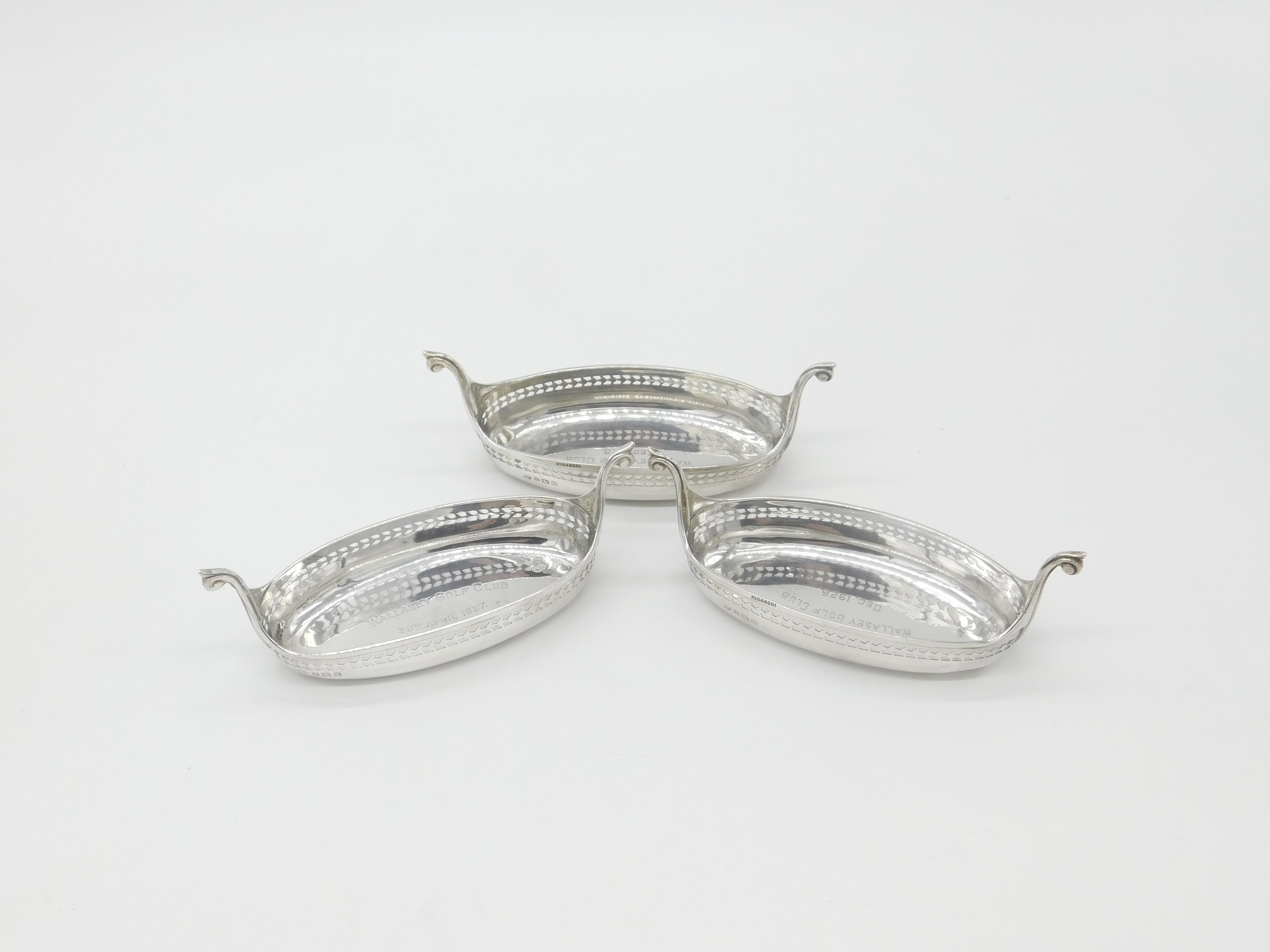 Details: A fantastic and wonderfully designed set of three antique sterling silver sweet treat dishes in the form of viking longboats with fun detailing hallmarked Birmingham each with different dates 1929 & 1922 all by Elkington & Co. The dishes are all engraved Wallasey Golf Club to the bottom please note and were almost certainly given as trophies. This is a wonderful item that would make a perfect gift or addition to any collection. The BOX pictured is for PRESENTATION ONLY and is NOT included in the listings but used to frame the pictures unless specifically stated otherwise.