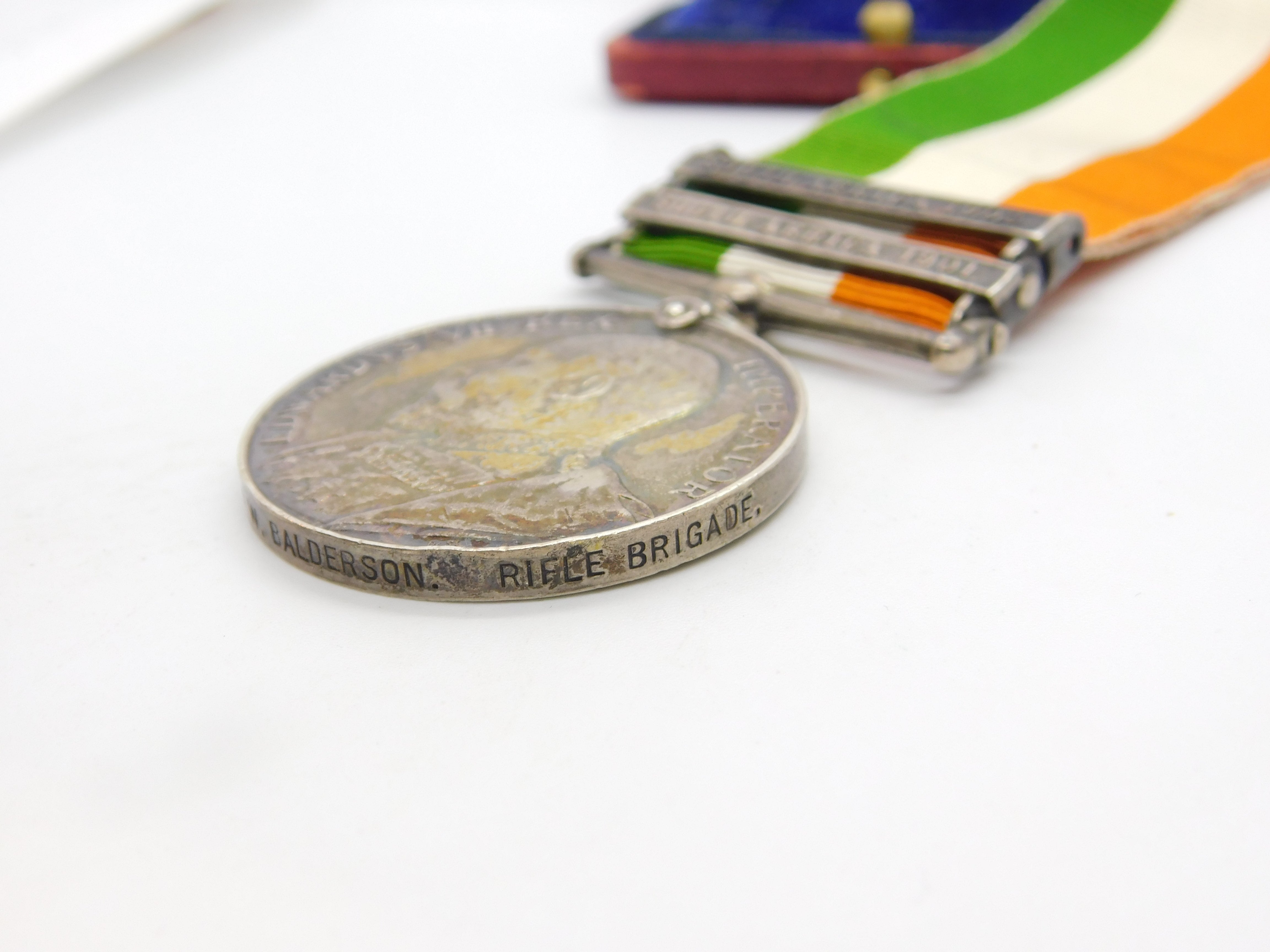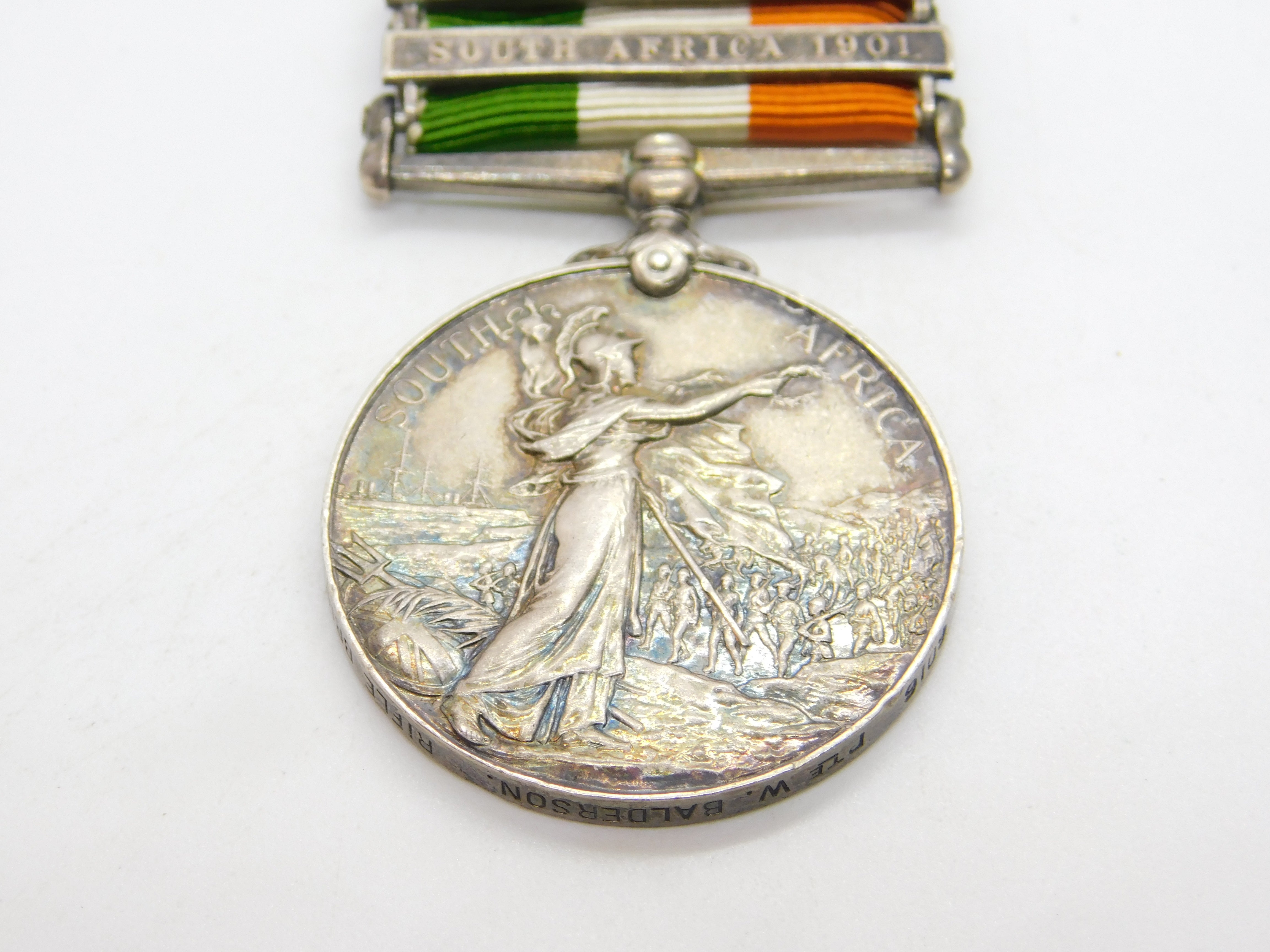 Details: A fantastic and wonderfully designed antique sterling silver original 1901-1902 Boer War Kings South Africa Service Medal issues to Pte. W. Balderson of the Rifle Brigade, 9109. Nice colour to the ribbon, a charming example. This is a wonderful item that would make a perfect gift or addition to any collection. The BOX pictured is for PRESENTATION ONLY and is NOT included in the listings but used to frame the pictures unless specifically stated otherwise.