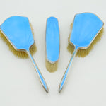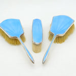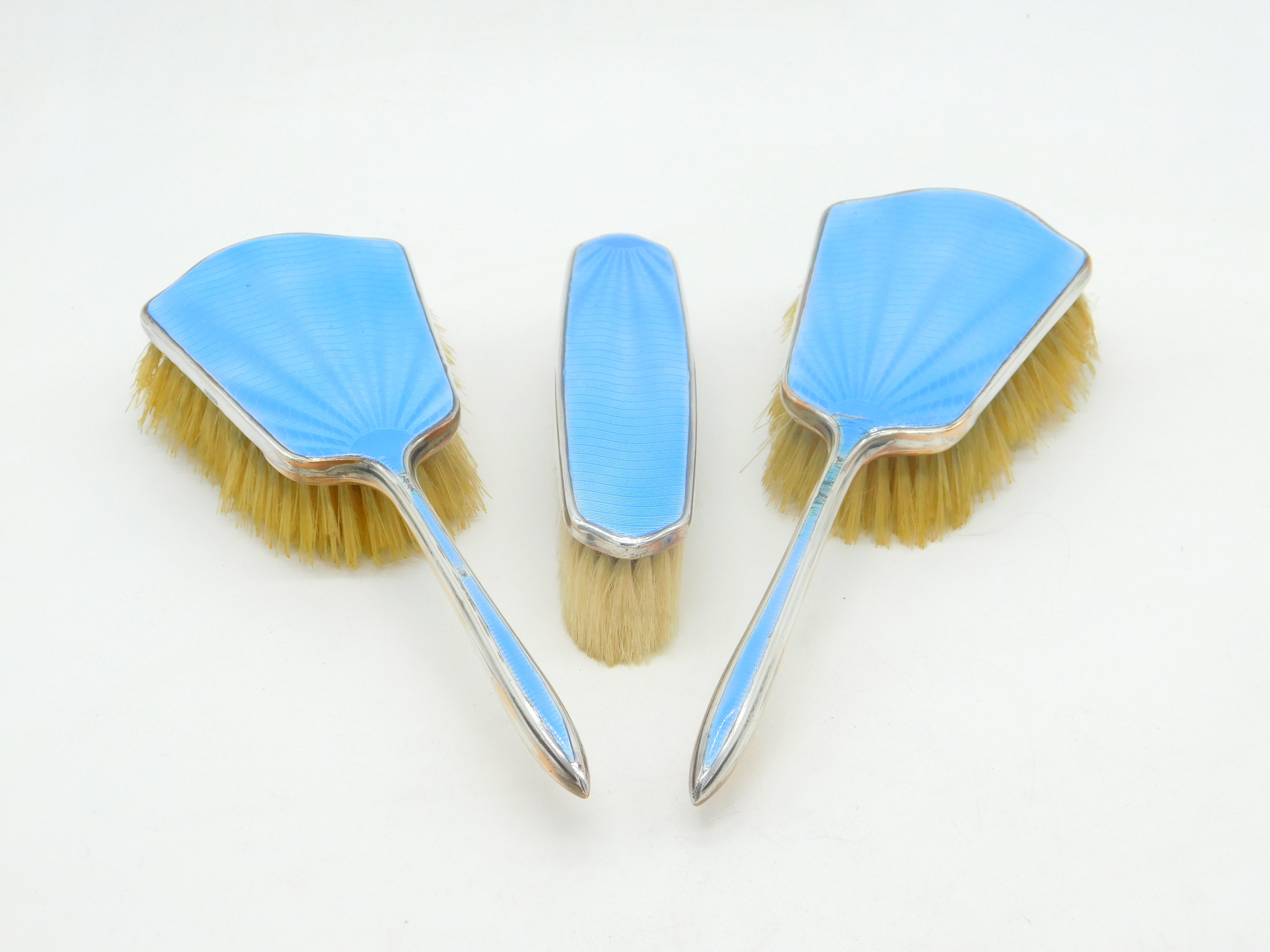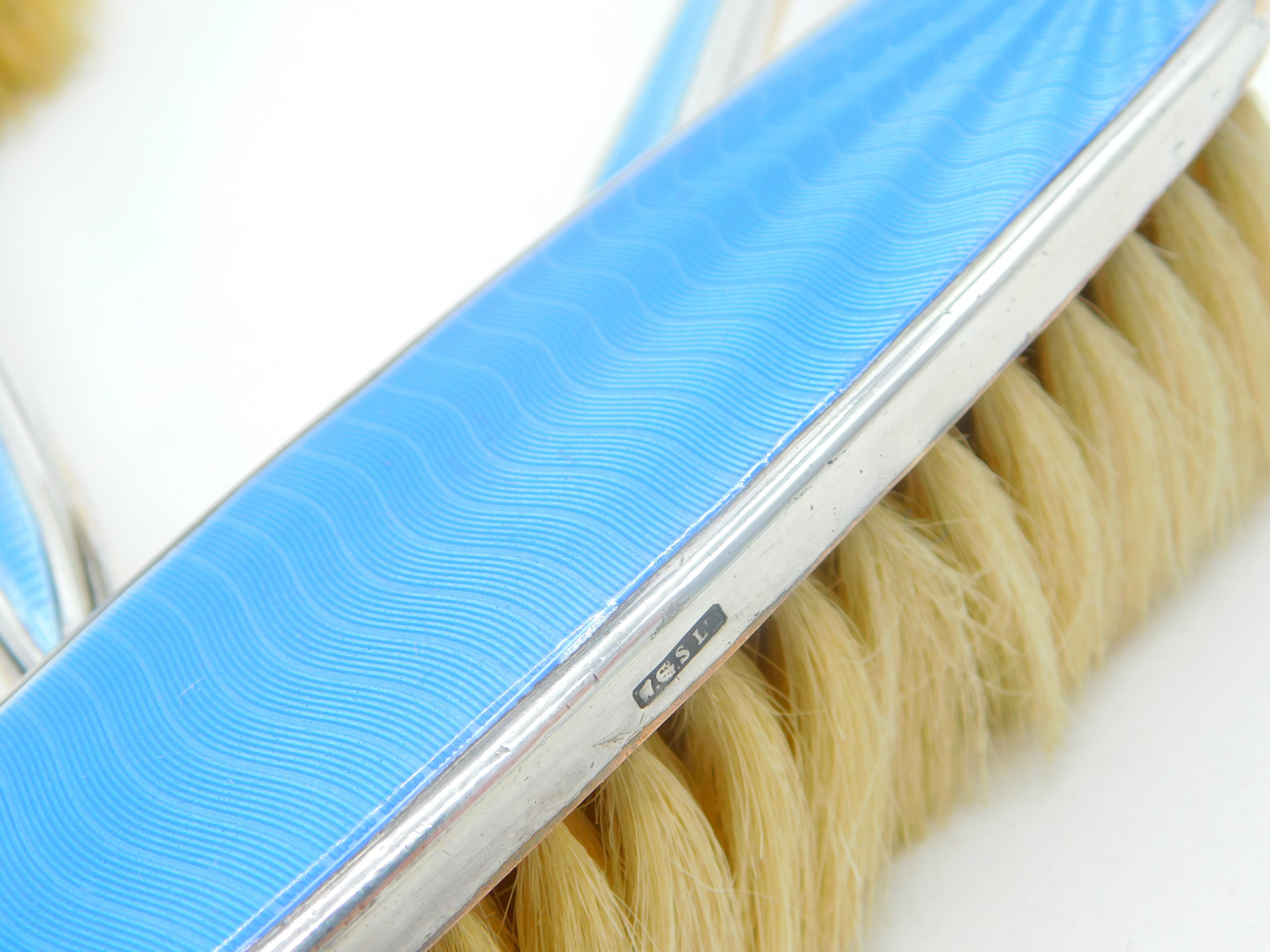 Details: A fantastic and wonderfully designed antique art deco silver plated blue guilloche enamel three piece vanity set to include three brushes each with makers marks for W G Sothers Ltd Birmingham c1930. This is a wonderful item that would make a perfect gift or addition to any collection. The BOX pictured is for PRESENTATION ONLY and is NOT included in the listings but used to frame the pictures unless specifically stated otherwise.