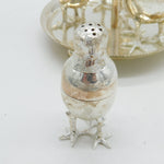 Details: A fantastic and wonderfully designed antique art deco novelty silver plated egg cup breakfast set including two egg cups with chicken feet alongside two little chick form salt & pepper shakers hallmarked to the base c1930. This is a wonderful item that would make a perfect gift or addition to any collection. The BOX pictured is for PRESENTATION ONLY and is NOT included in the listings but used to frame the pictures unless specifically stated otherwise.