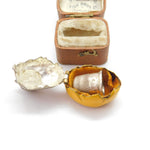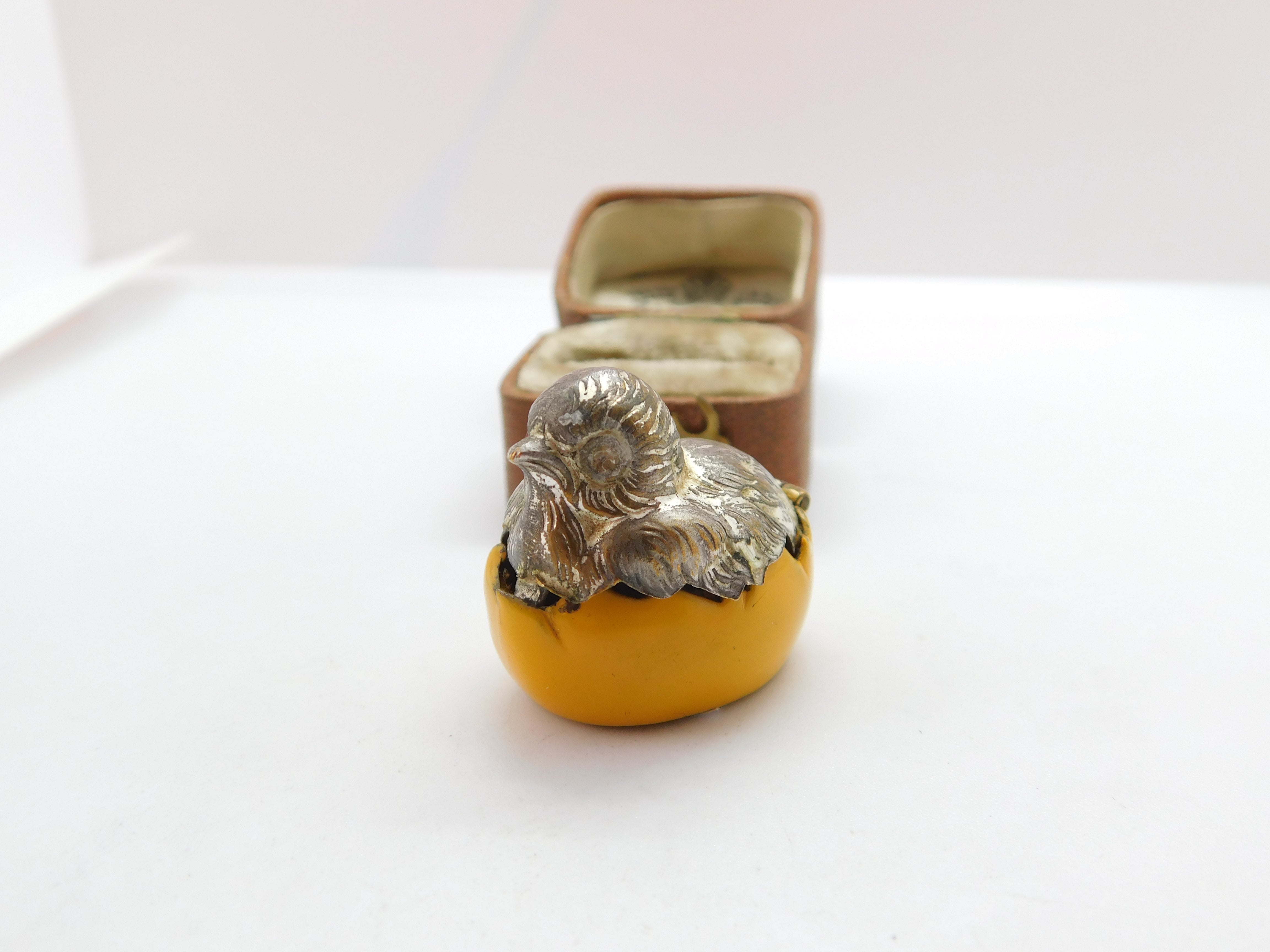 Details: A fantastic and wonderfully designed antique Edwardian silver plated and yellow enamel sewing thimble case depicting a chick in egg with superb detailing including a silver thimble to the interior c1910. The plating has worn from the chick but is otherwise lovely, missing one glass eye. This is a wonderful item that would make a perfect gift or addition to any collection. The BOX pictured is for PRESENTATION ONLY and is NOT included in the listings but used to frame the pictures unless specifically stated otherwise.