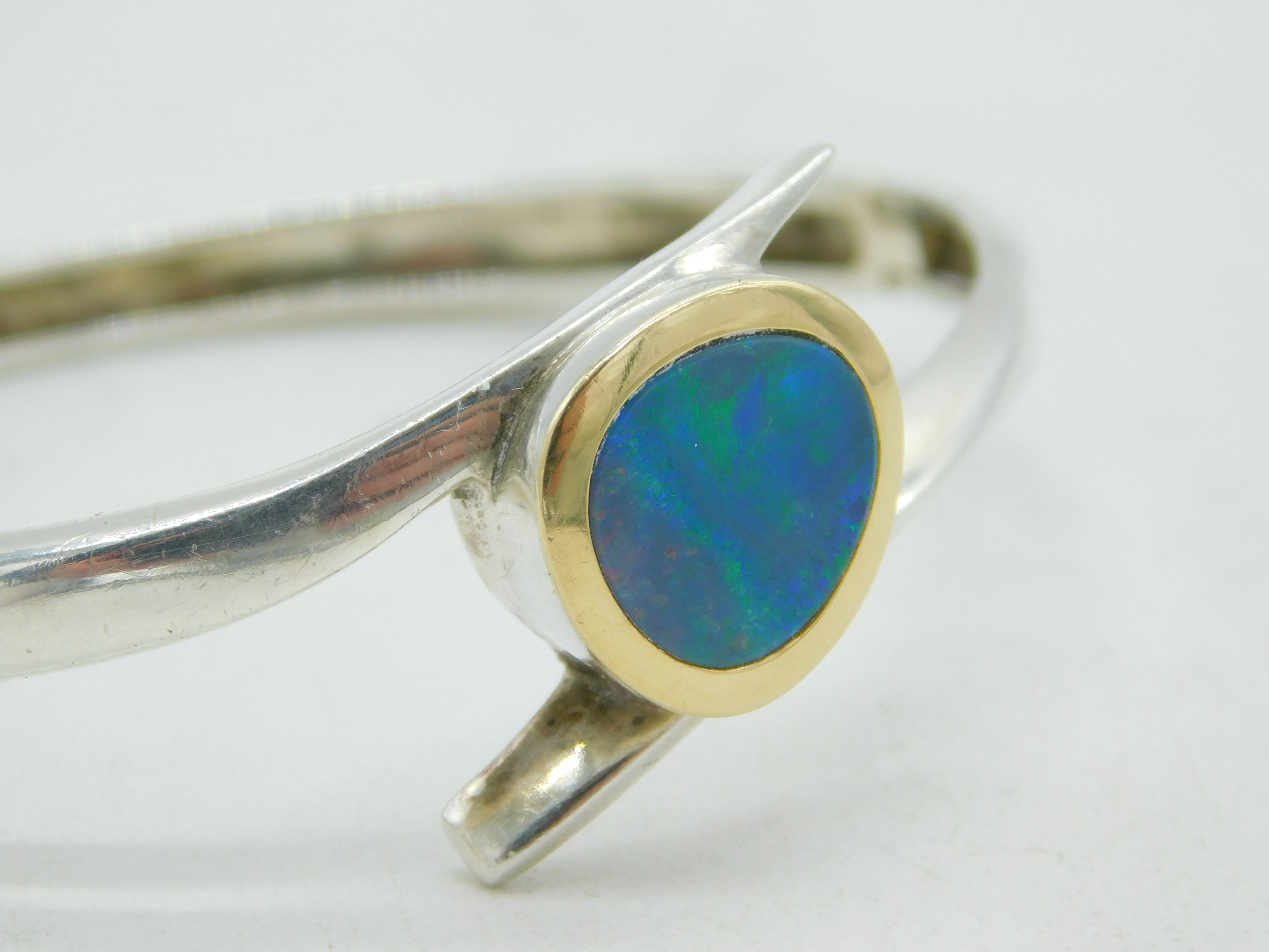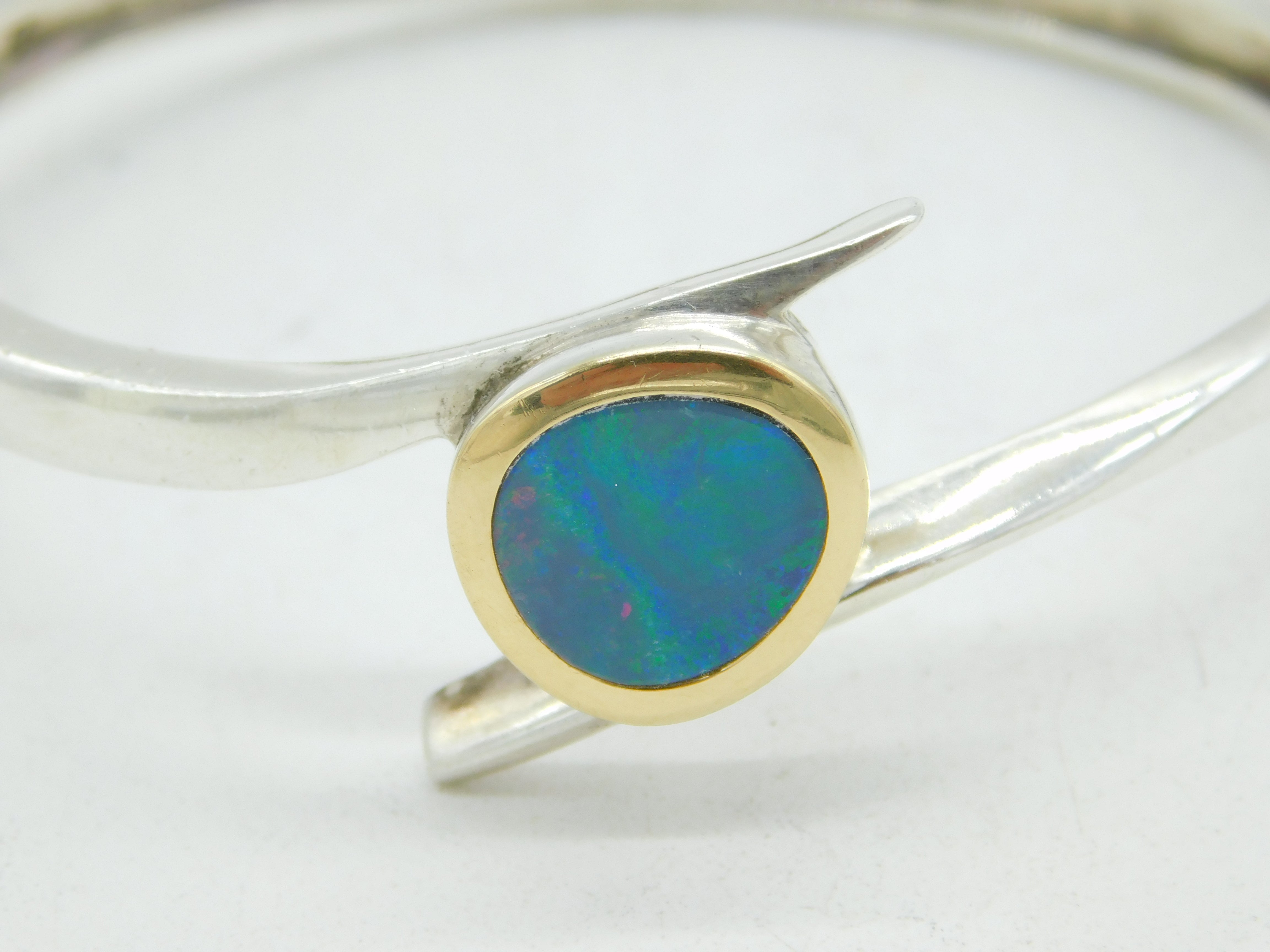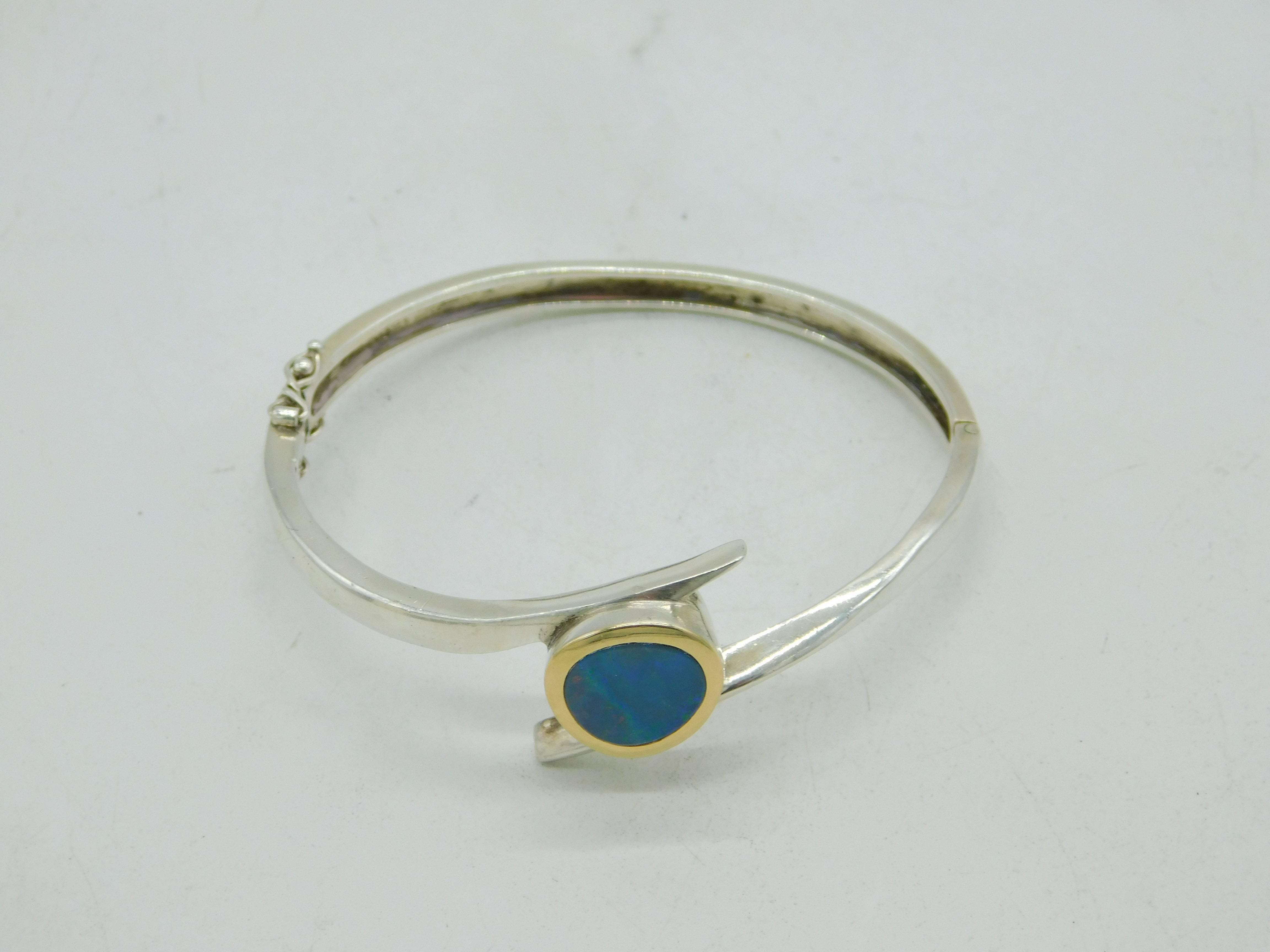 Sterling Silver, 18ct Gold & Doublet Opal Studio Bangle Bracelet Vintage