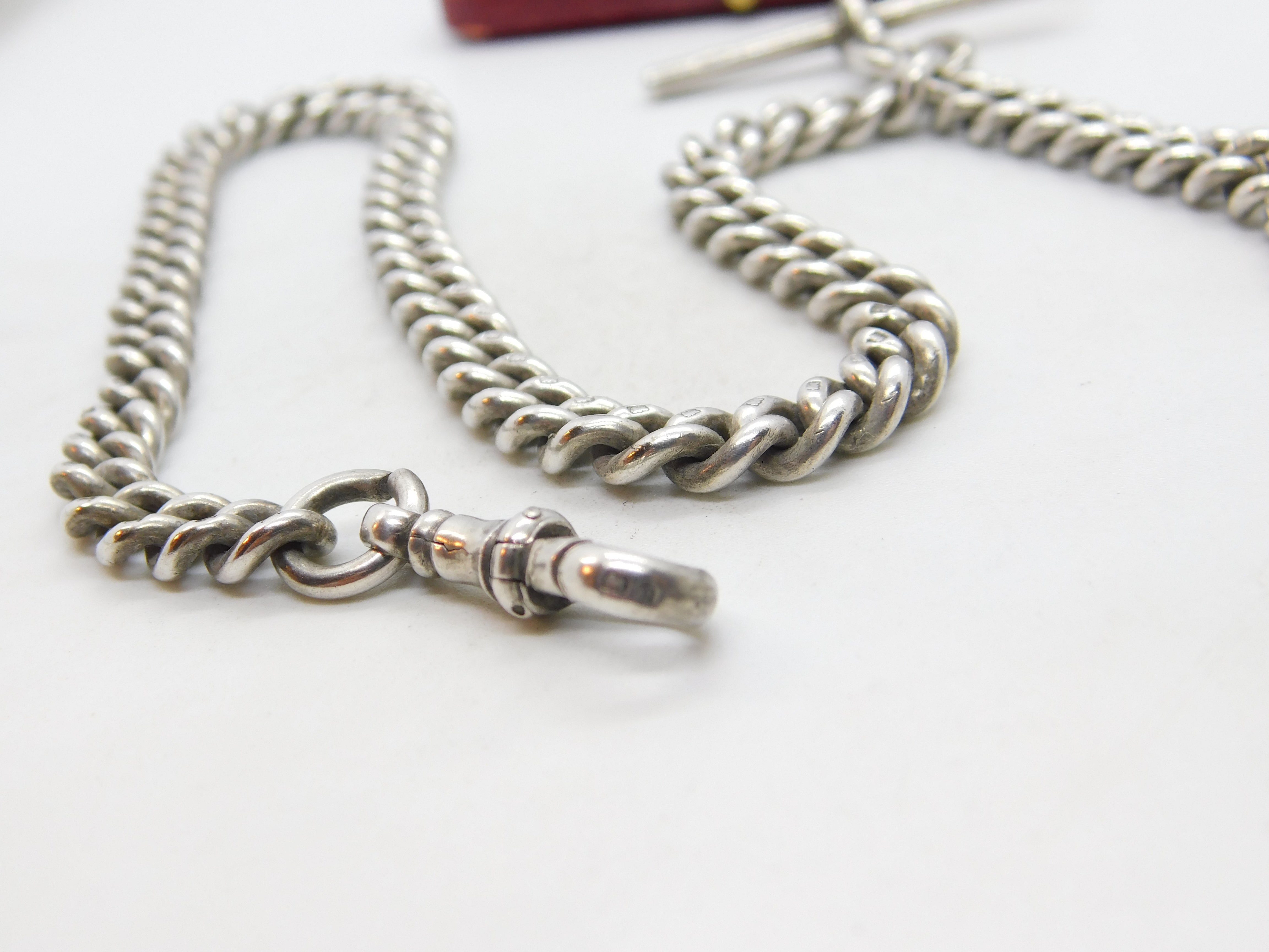 Details: A fantastic and wonderfully designed antique sterling silver curb link watch chain with fob and t-bar hallmarked to every link of the watch chain and to the dog clip Birmingham 1911. This is a wonderful item that would make a perfect gift or addition to any collection. The BOX pictured is for PRESENTATION ONLY and is NOT included in the listings but used to frame the pictures unless specifically stated otherwise.