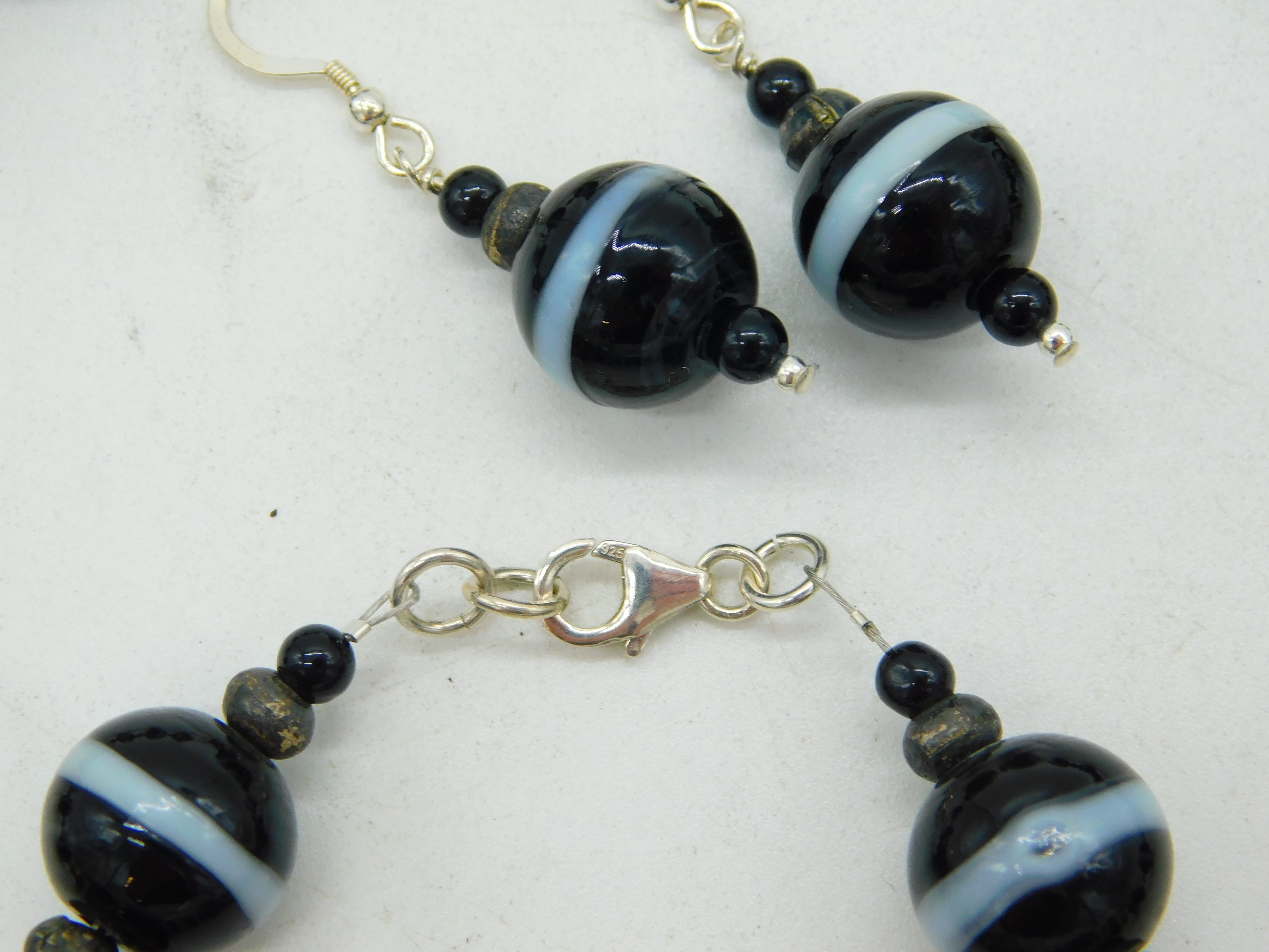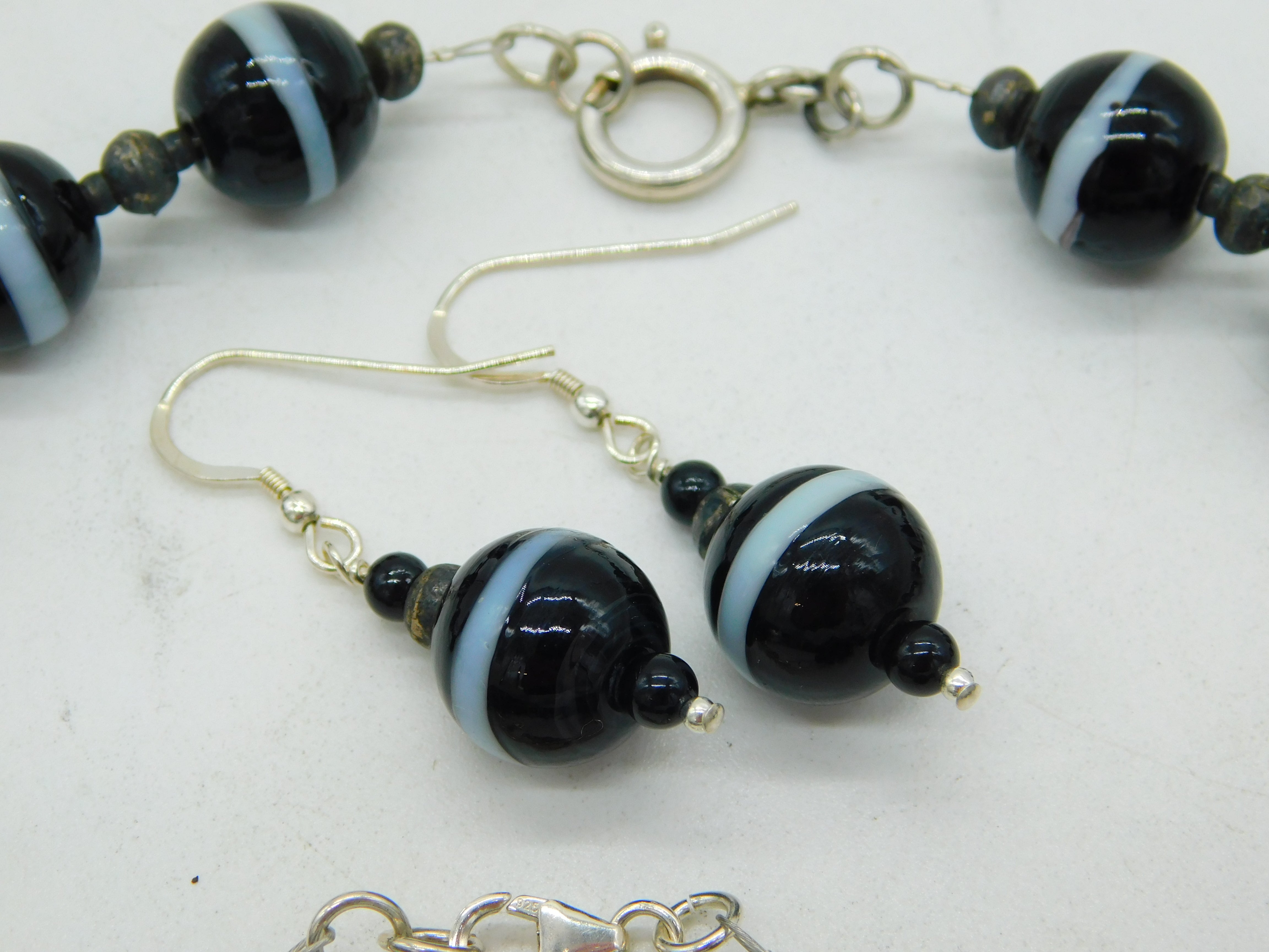 Details: A fantastic and wonderfully designed vintage sterling silver & banded agate three-piece jewellery set to include a necklace, bracelet and pair of earrings c1970. This is a wonderful item that would make a perfect gift or addition to any collection.