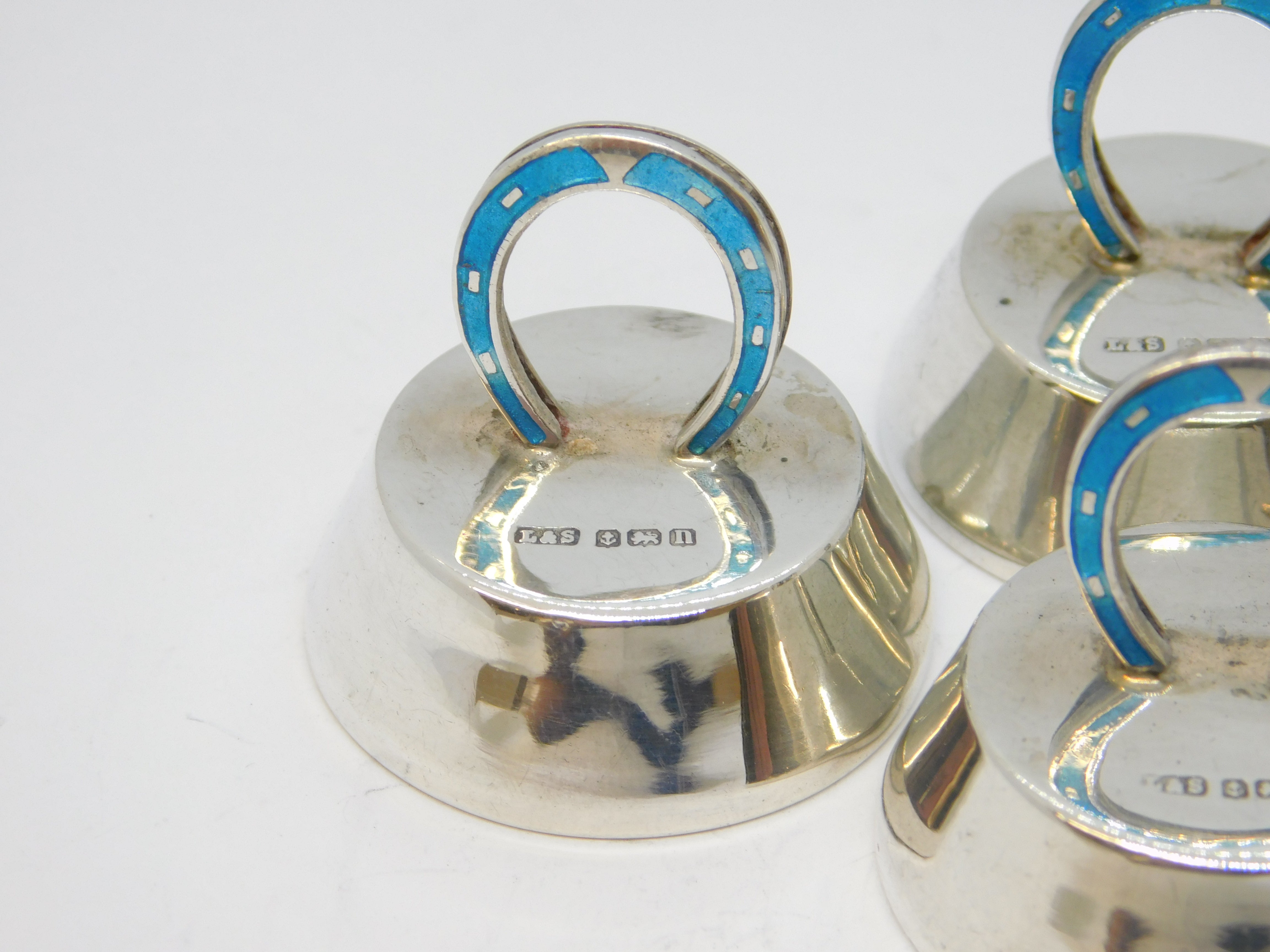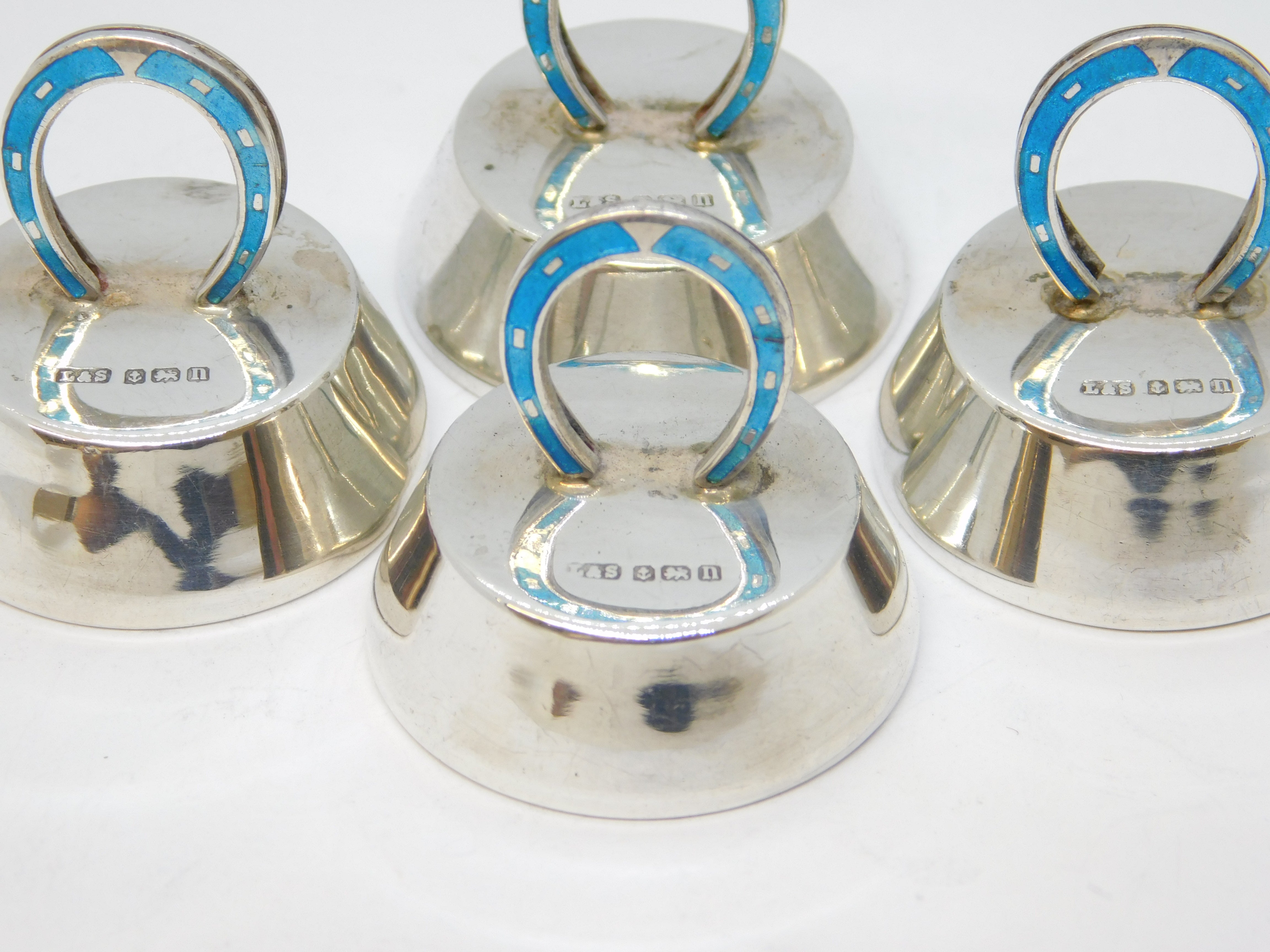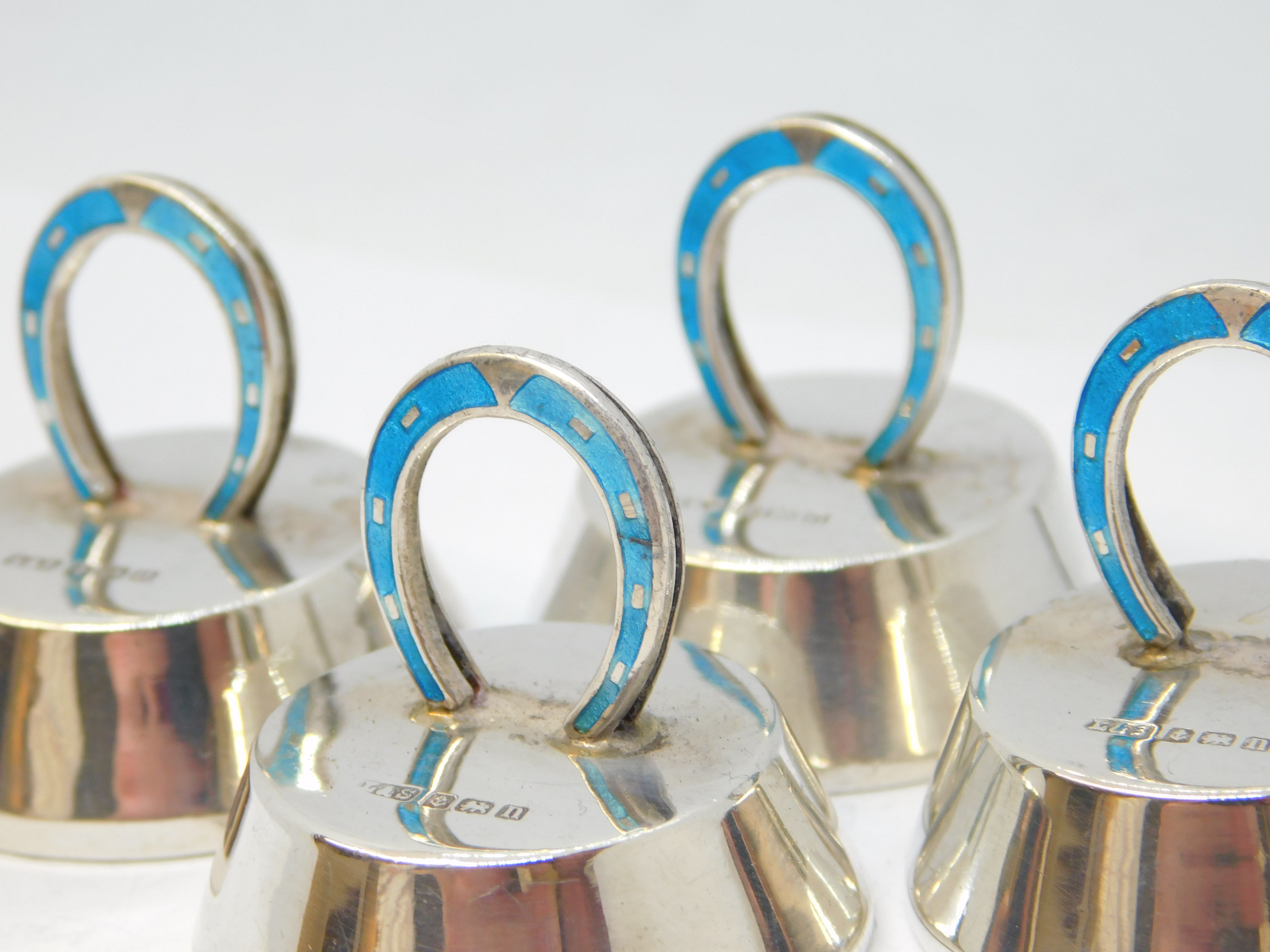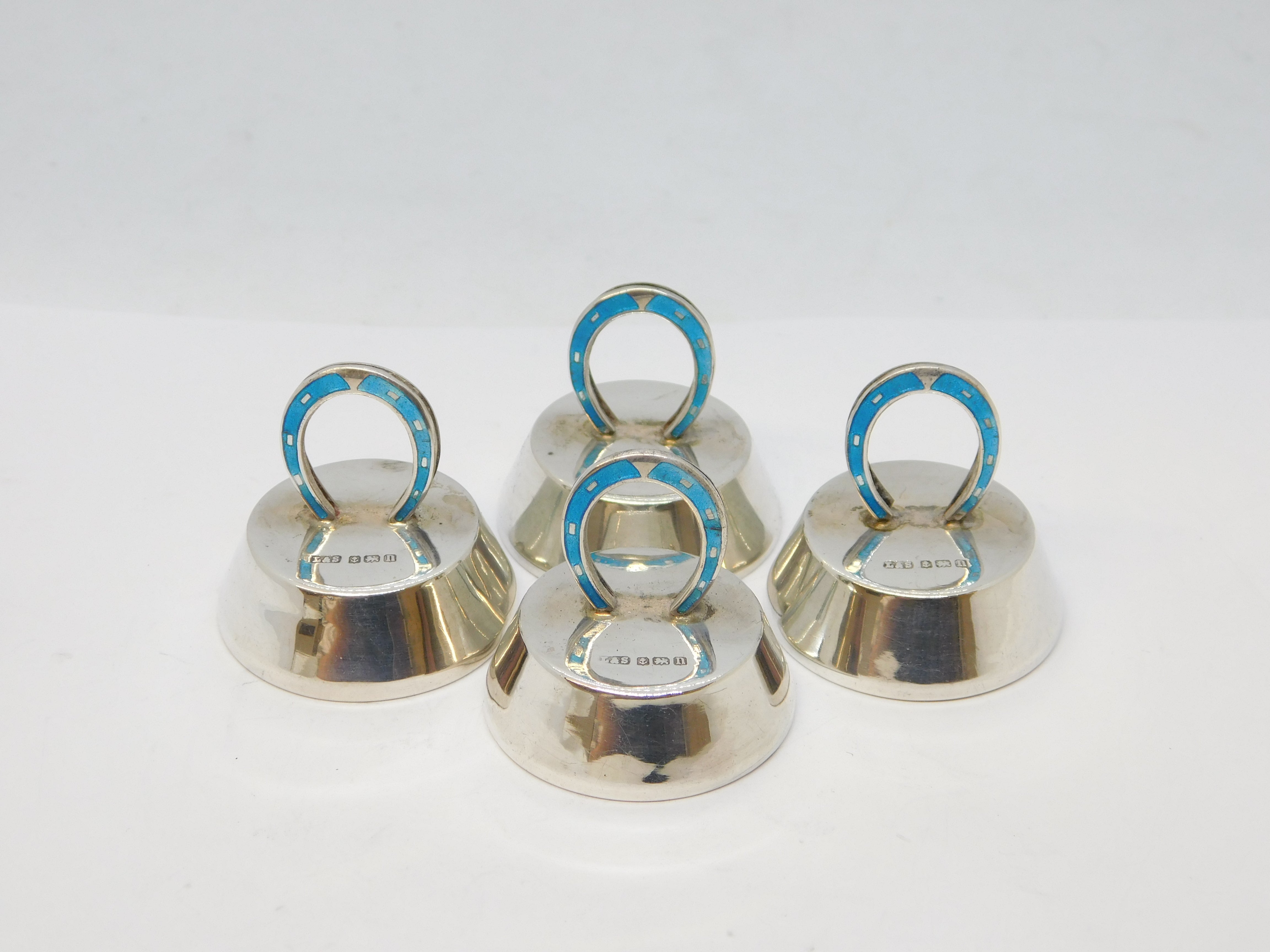 Details: A fantastic and wonderfully designed antique art deco sterling silver & blue enamel set of four horseshoe novelty menu holders or place settings with wonderful design hallmarked for Birmingham 1912 by Levi & Salaman. Weighted to the base. This is a wonderful item that would make a perfect gift or addition to any collection. We are more than happy to provide XRF reports for items upon request.