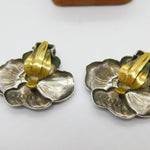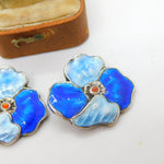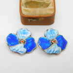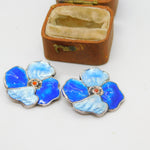 Sterling Silver Blue Guilloche Enamel Floral Clip-On Earrings Antique c1930 Deco