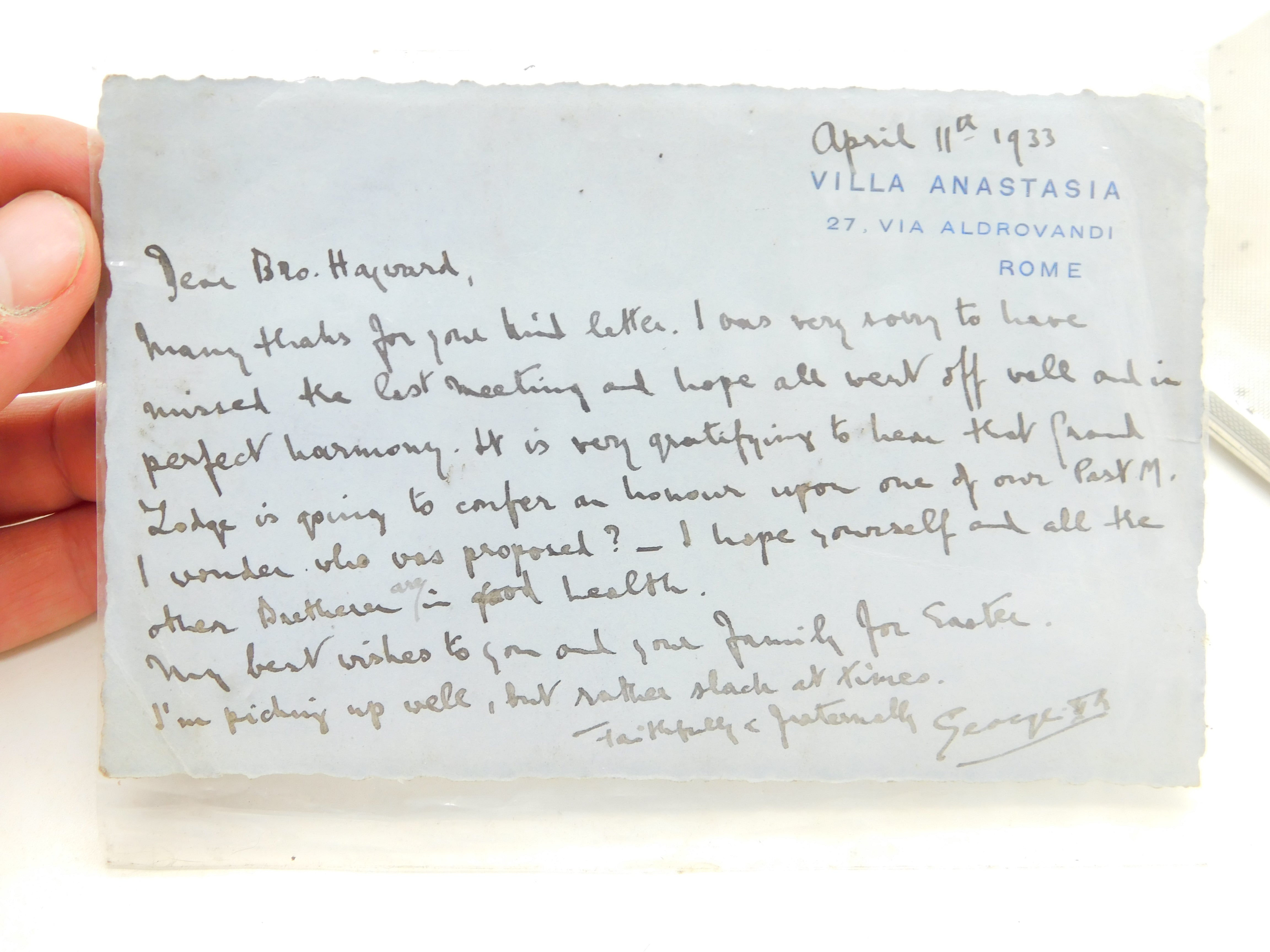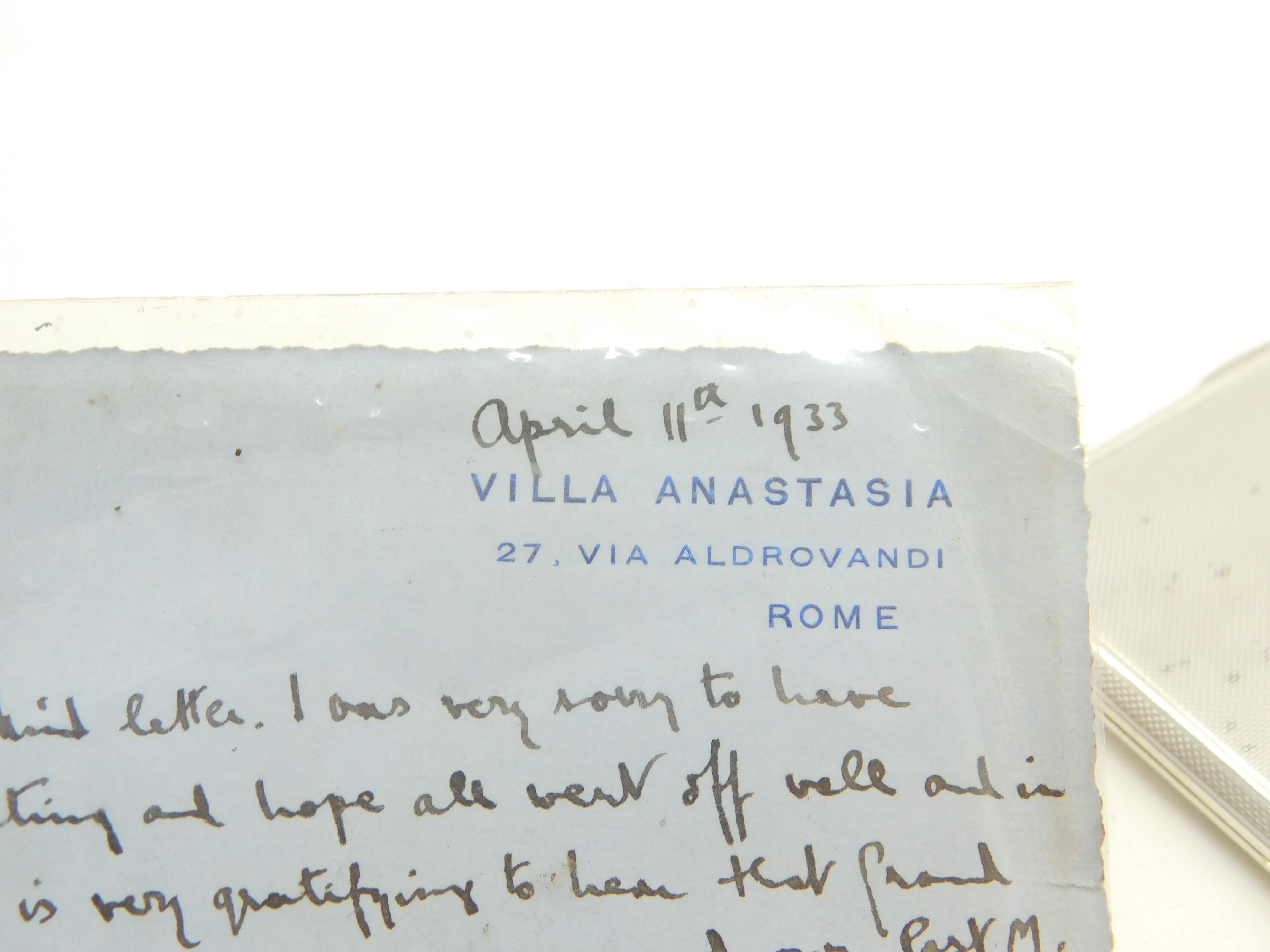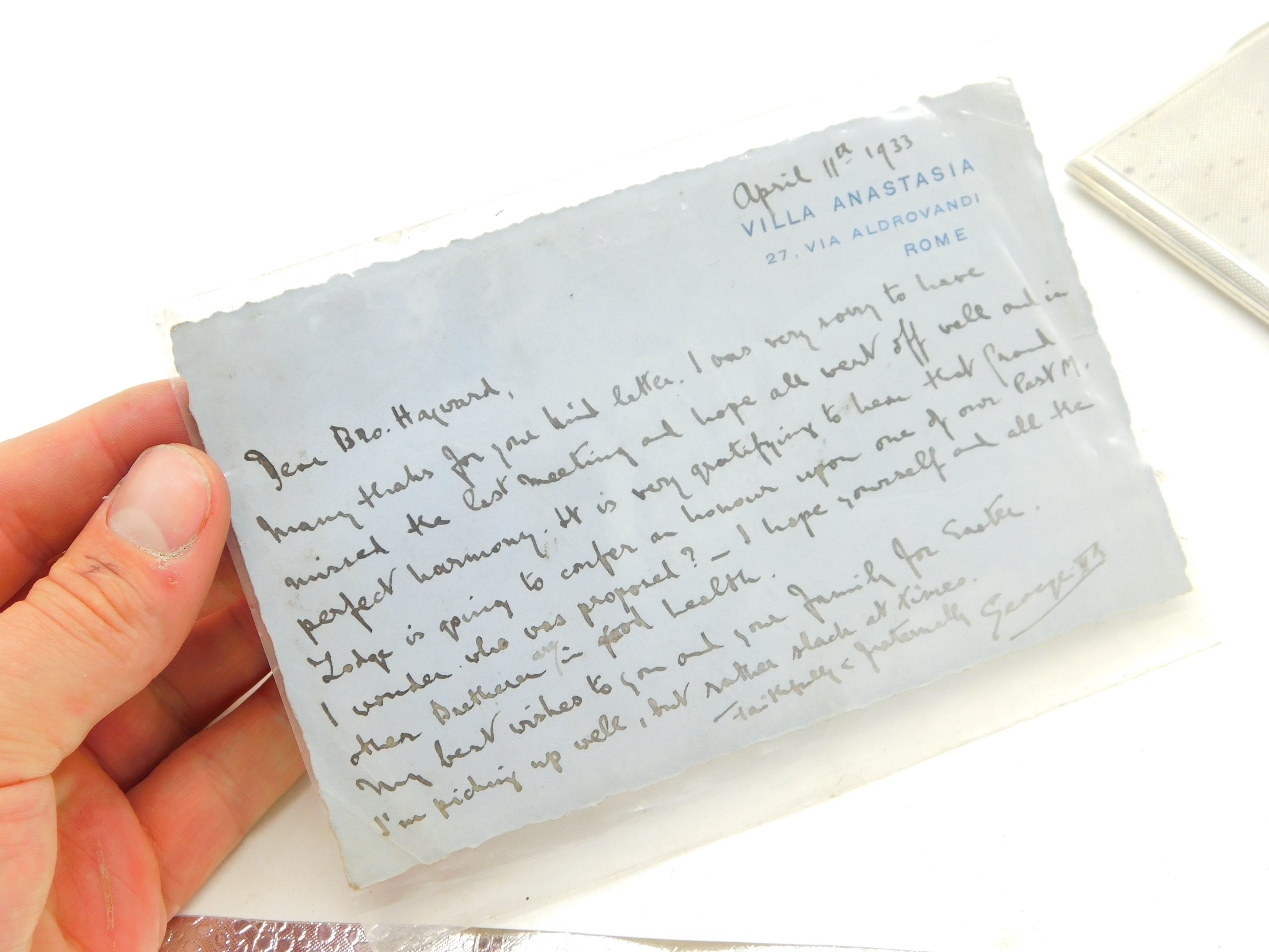 Details: A fantastic and wonderfully designed antique art deco Royal interest sterling silver engine turned cigarette case belonging to King George II of Greece engraved with the King's Royal intaglio depicting a crown over 'G. II' to the corner. Gilded to the interior and hallmarked Birmingham 1932. Forced to abdicate following the Greco-Turkish and with Greece declaring as a republic in 1924 King George II was forced into exile until monarchy was restored in 1935. This particular cigarette case is included with a handwritten letter from George II writing from Rome dated 'april 11th 1933' during his period of exile, in relation to his freemasonry lodge and the health of his friend signed off 'Faithfully & gratefully George. II'. A truly unique collection that would make a superb addition to any collection with lovely provenance.