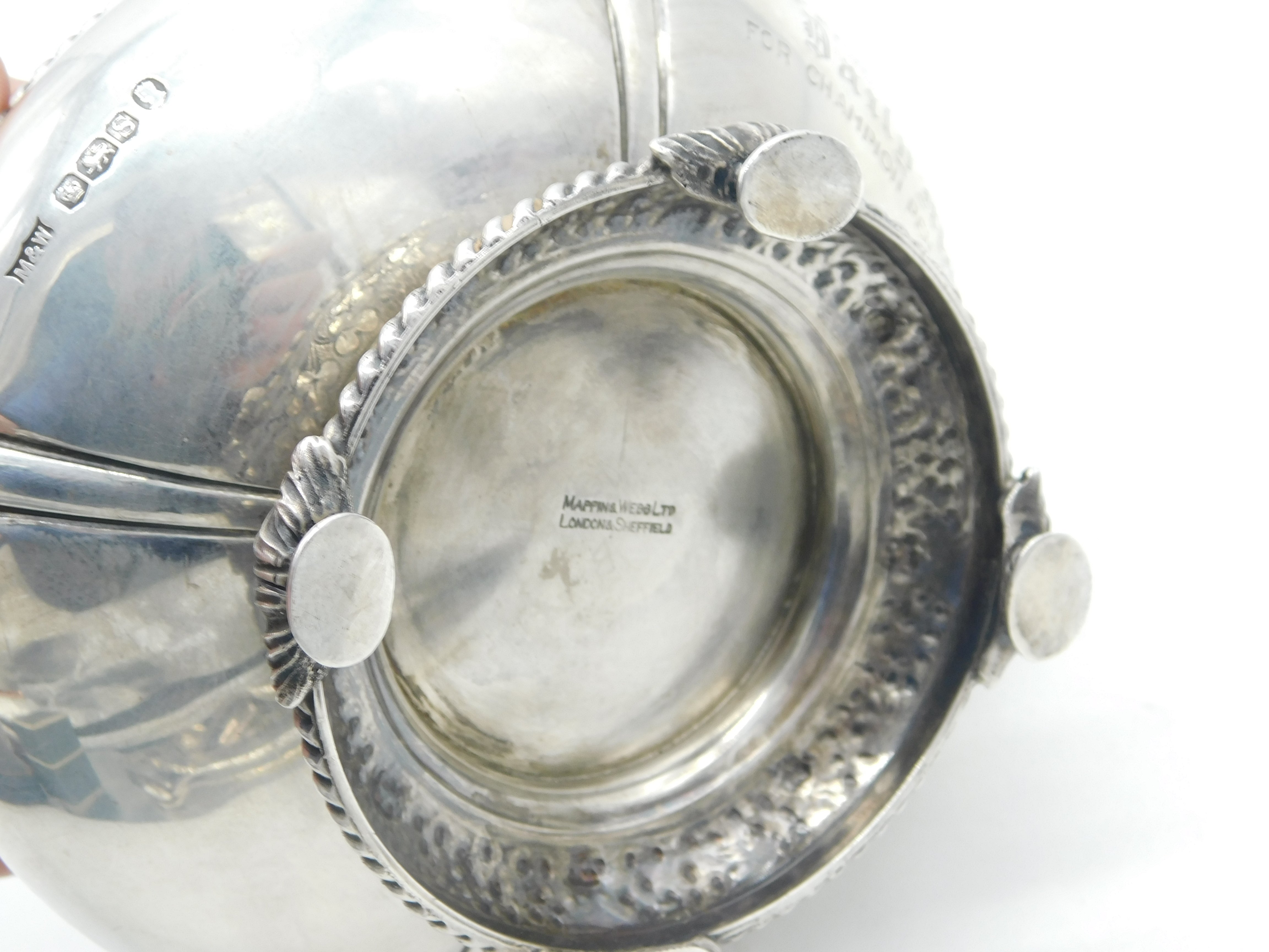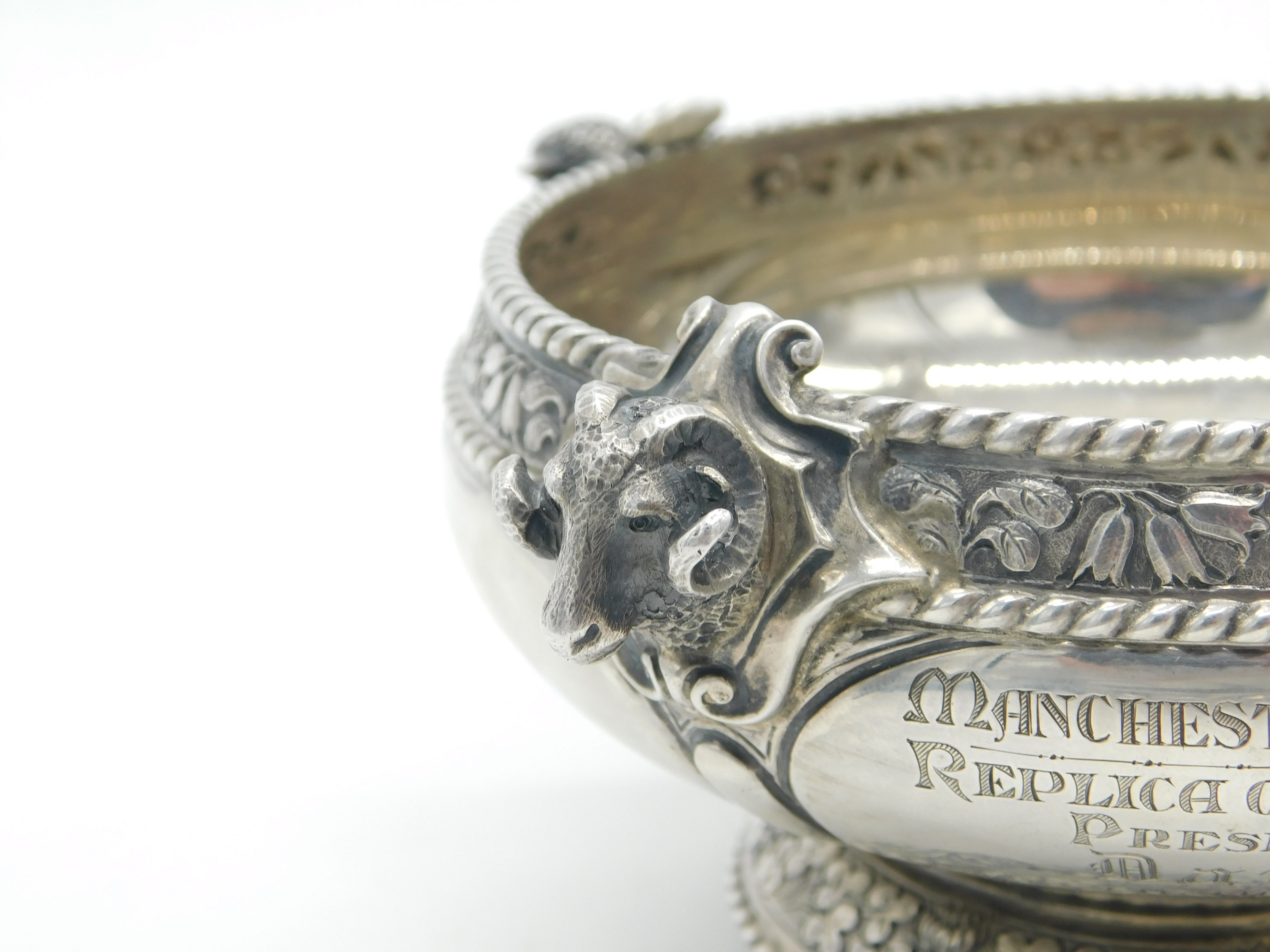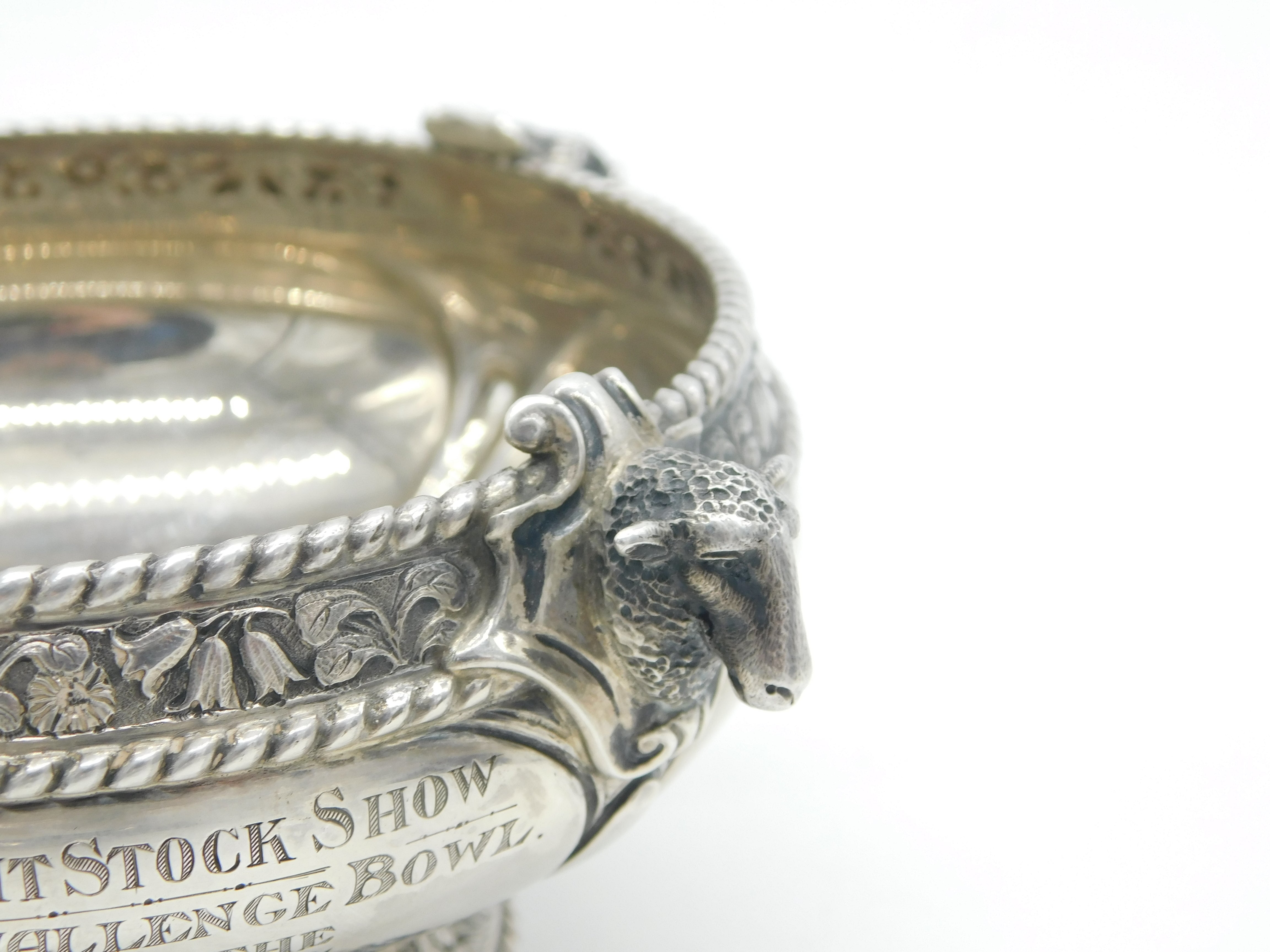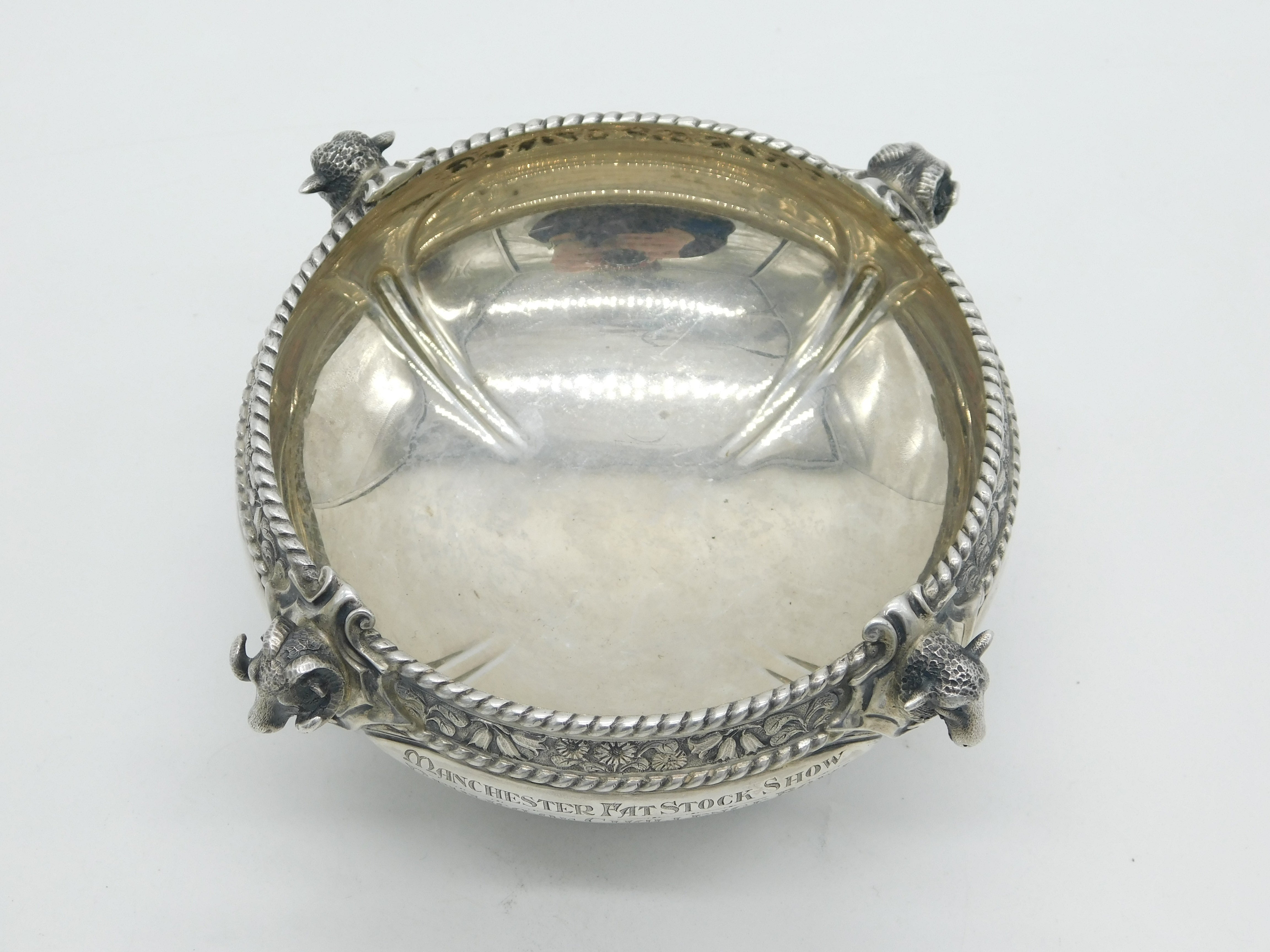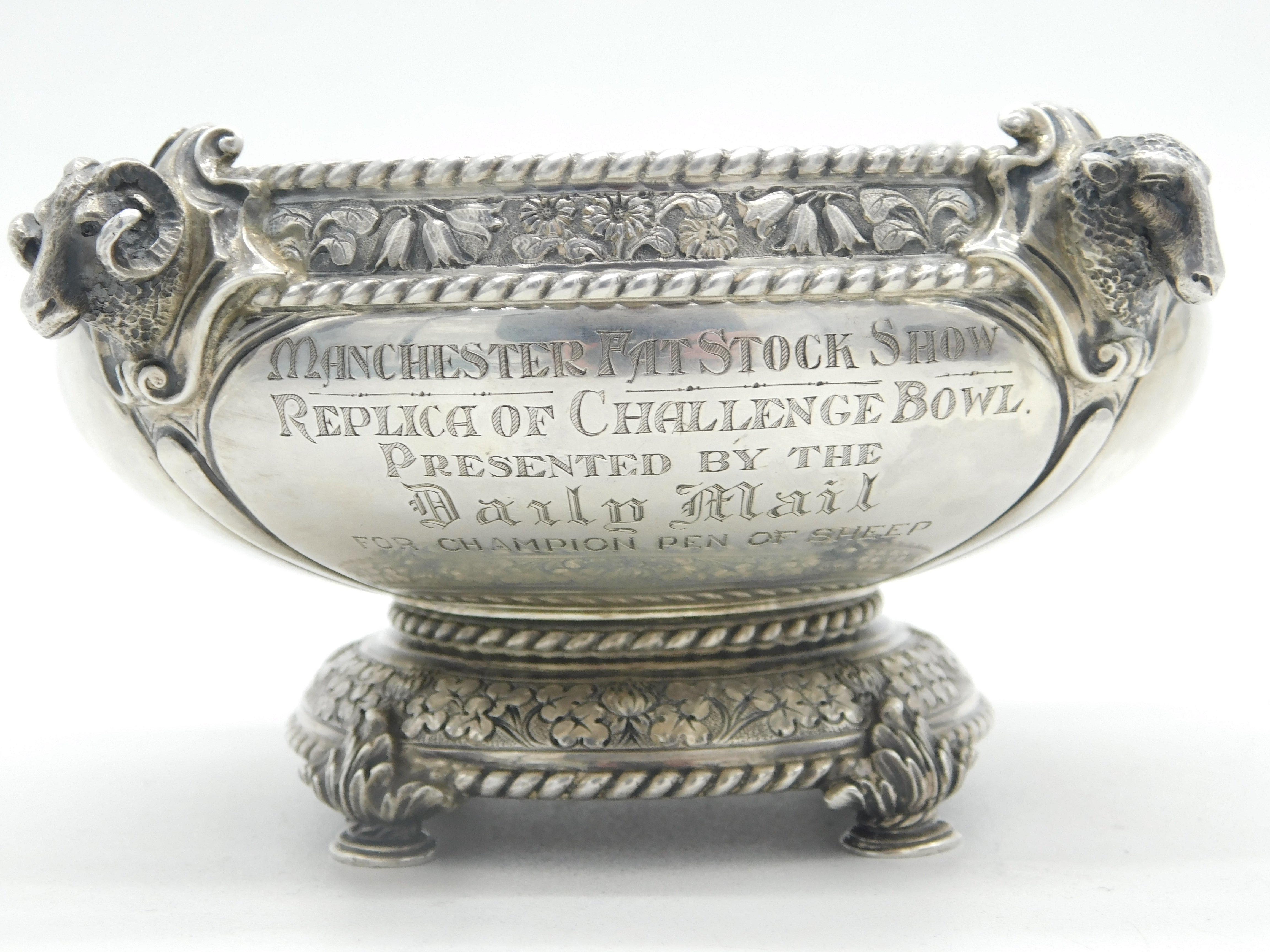 Details: A fantastic and wonderfully designed antique art deco sterling silver trophy cup bowl adorned with lovely floral patterned edges alongside cast sheep heads with superb detailing issued for the Daily Mail Champion Pen of Sheep a replica of the Challenge Bowl, hallmarked Sheffield 1935 by Mappin & Webb. This is a wonderful item that would make a perfect gift or addition to any collection. The BOX pictured is for PRESENTATION ONLY and is NOT included in the listings but used to frame the pictures unless specifically stated otherwise.