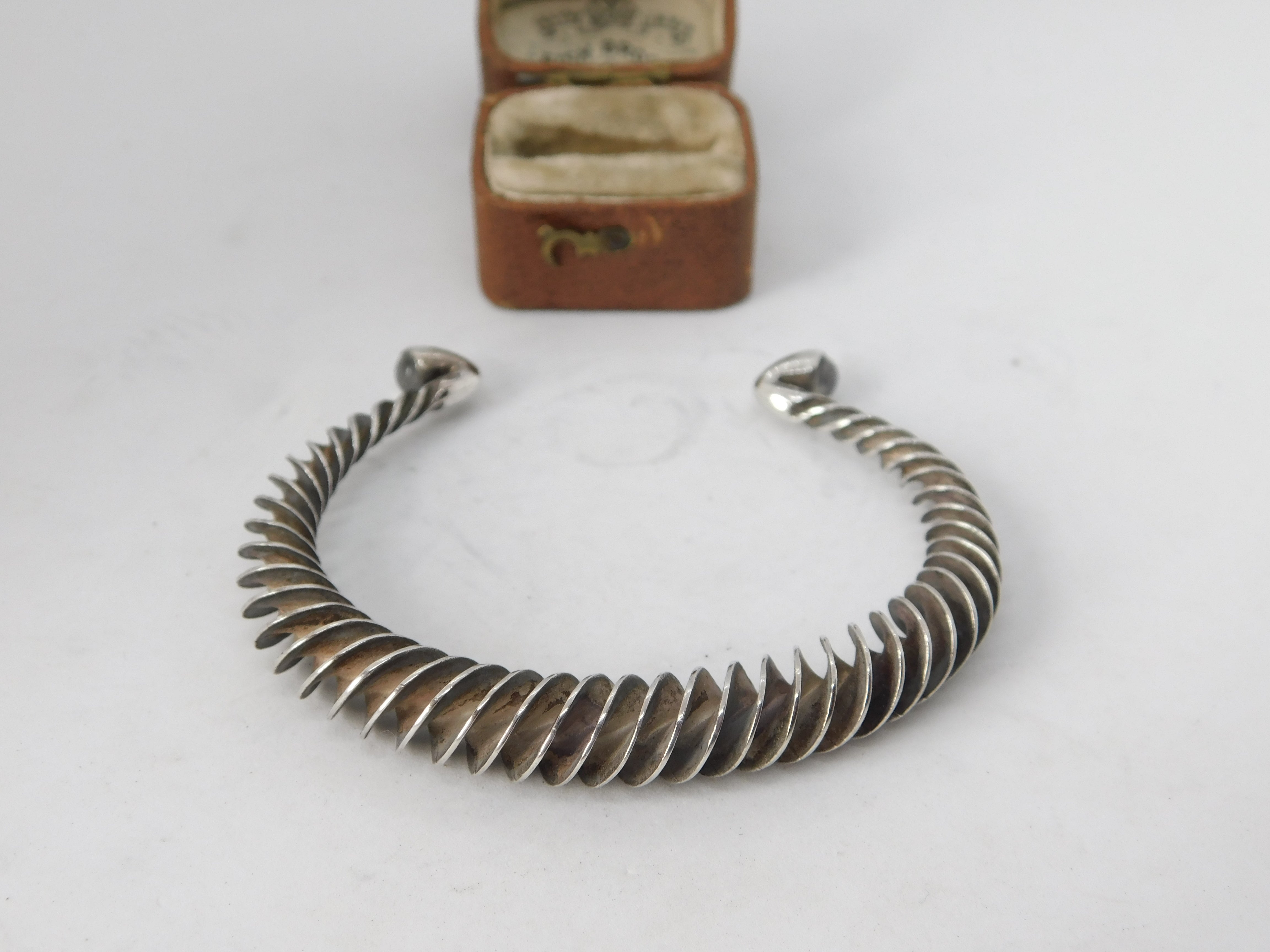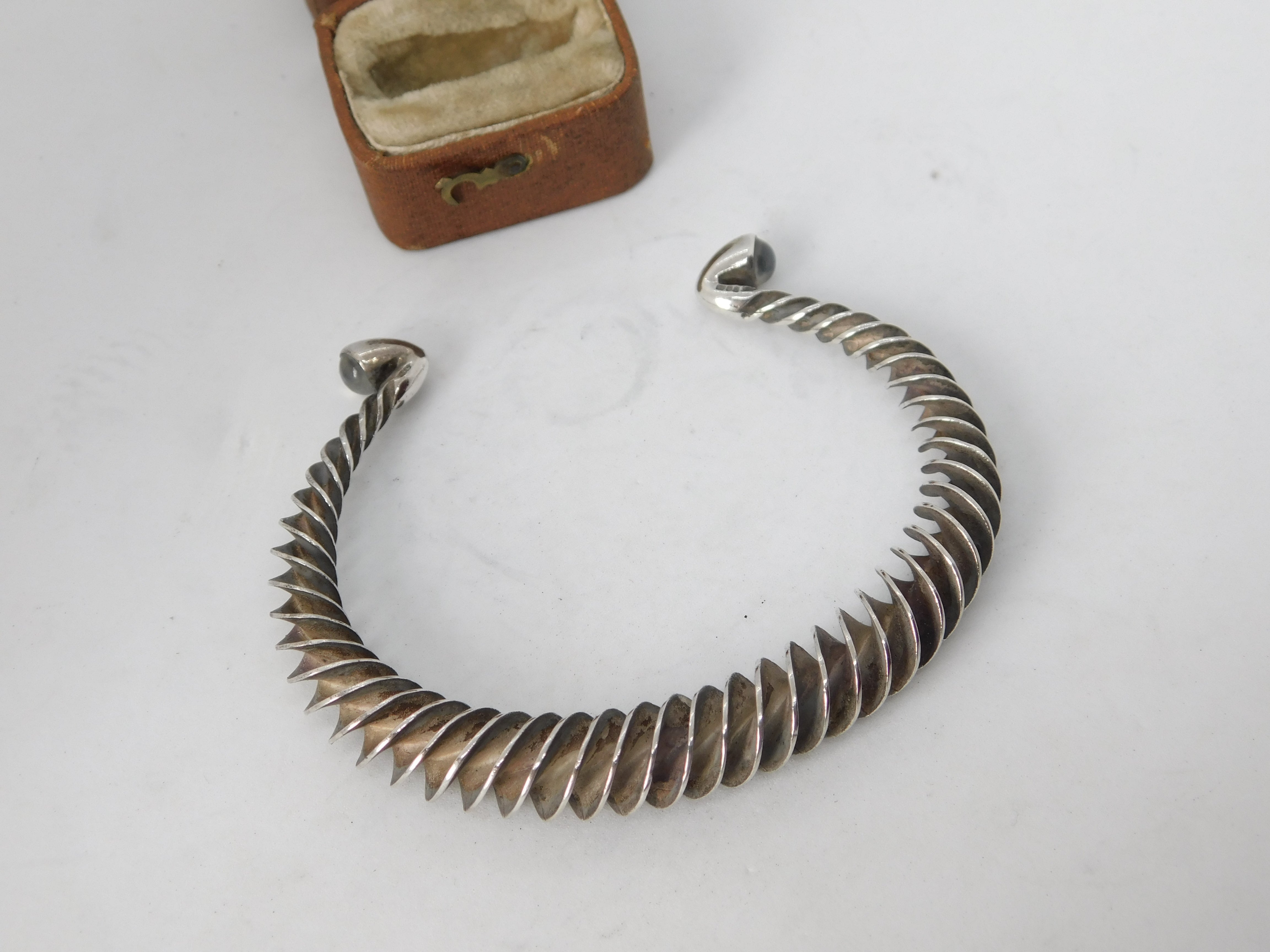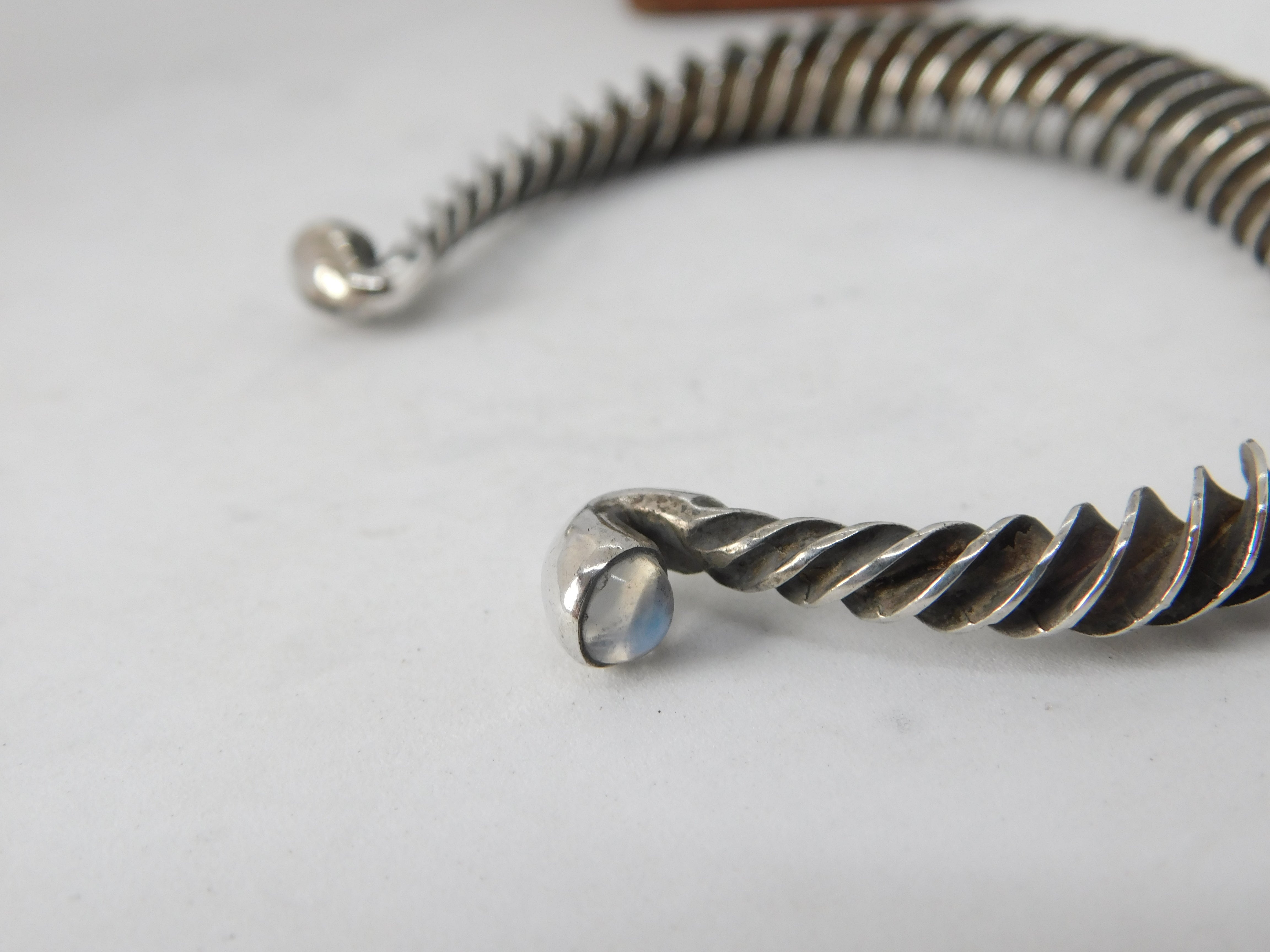 Details: A fantastic and wonderfully designed vintage designer sterling silver roman style bangle bracelet set with cabochon cut moonstones to either end London 1985. This is a wonderful item that would make a perfect gift or addition to any collection. The BOX pictured is for PRESENTATION ONLY and is NOT included in the listings but used to frame the pictures unless specifically stated otherwise.