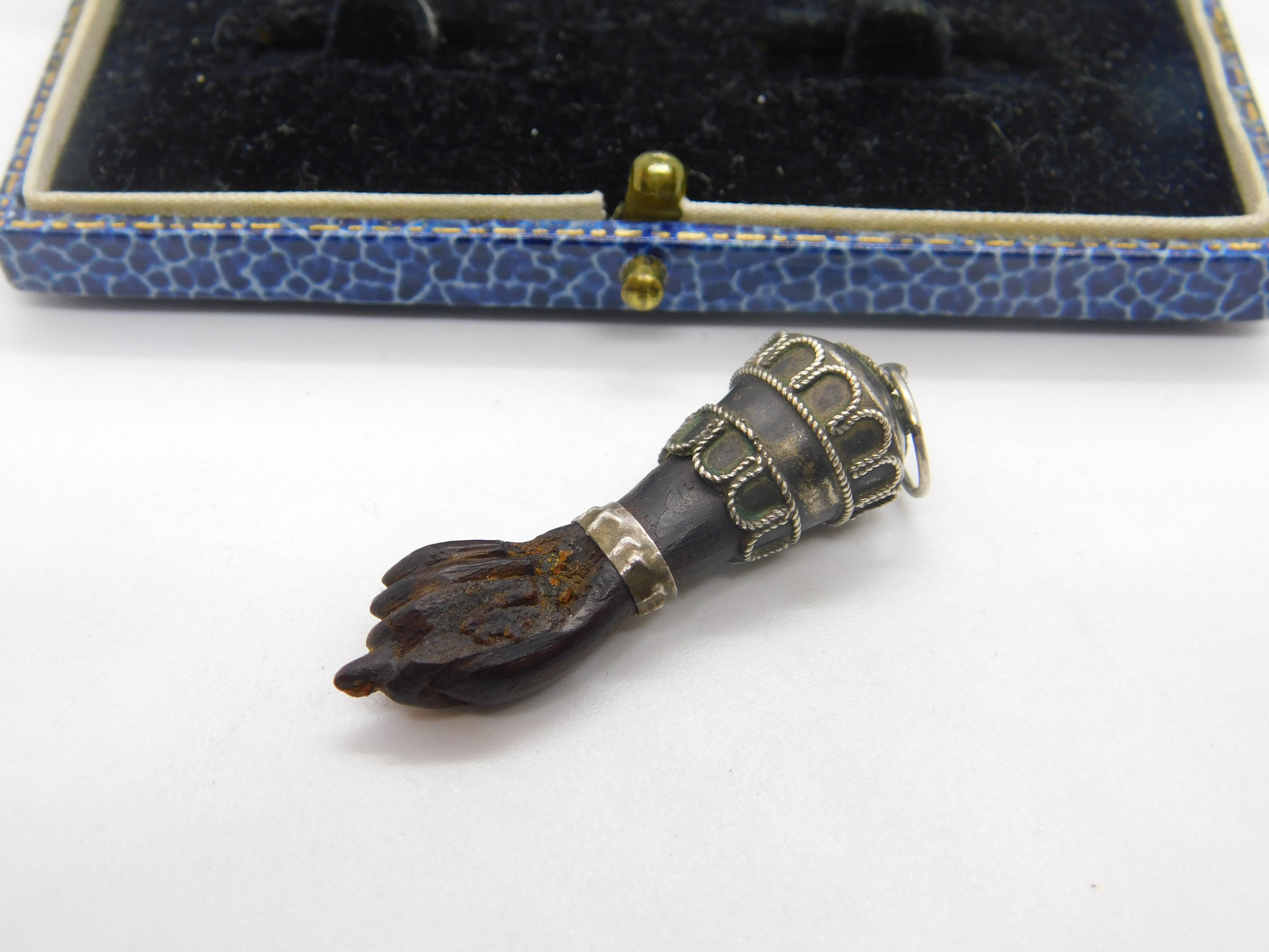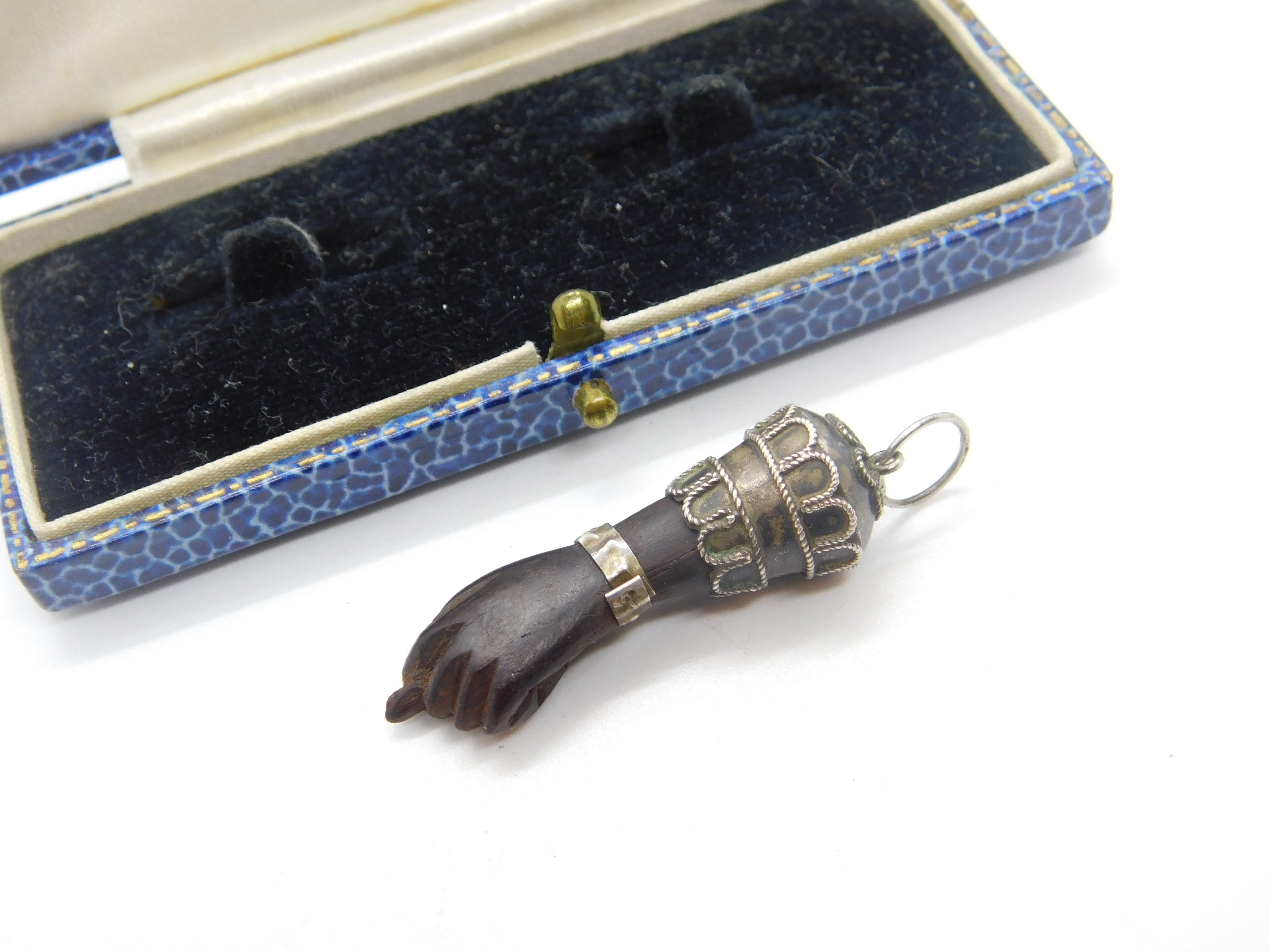 Details: A fantastic and wonderfully designed antique art deco sterling silver and carved ebony wood figa hand pendant with lovely design c1920. This is a wonderful item that would make a perfect gift or addition to any collection. The BOX pictured is for PRESENTATION ONLY and is NOT included in the listings but used to frame the pictures unless specifically stated otherwise.