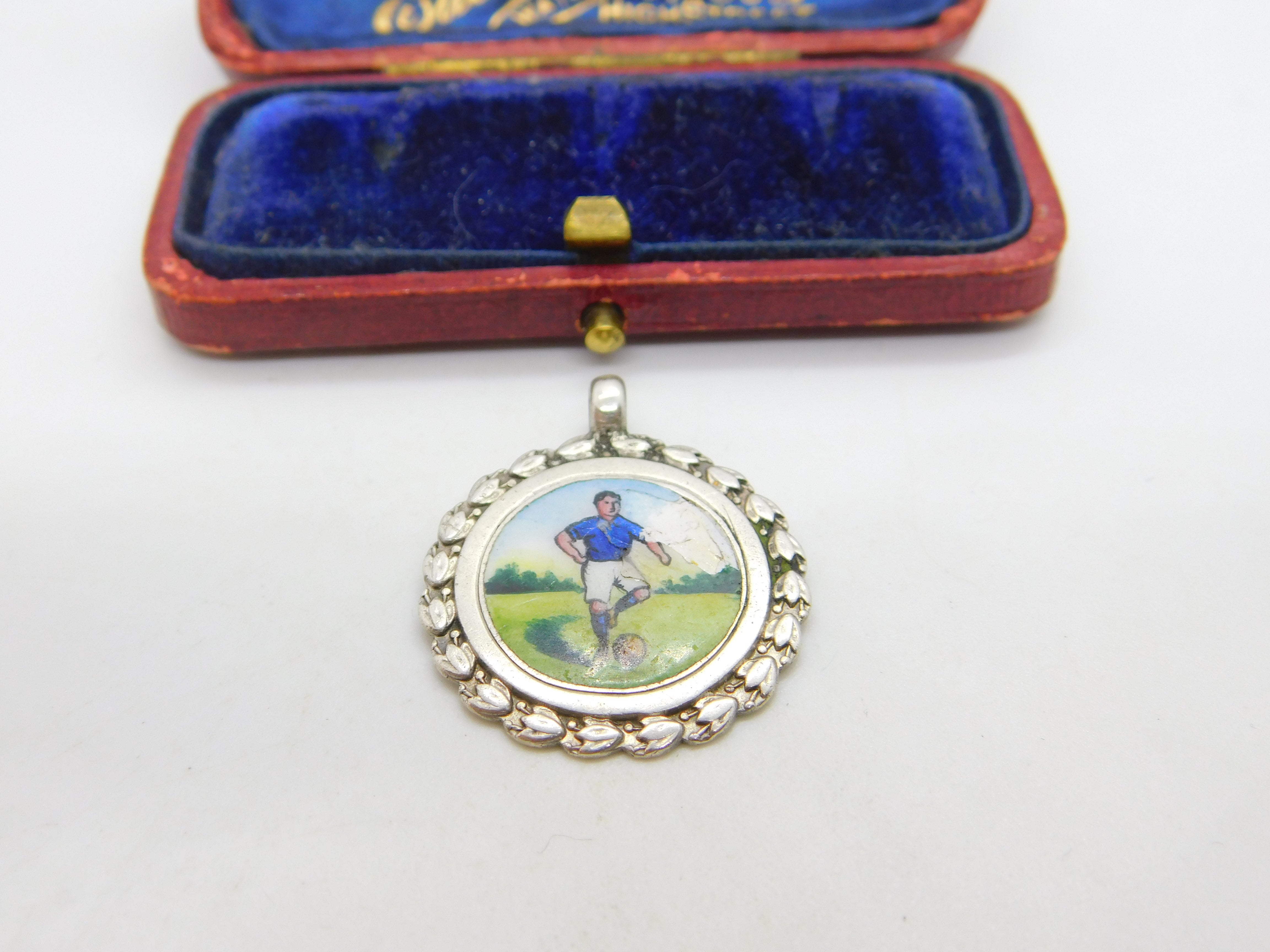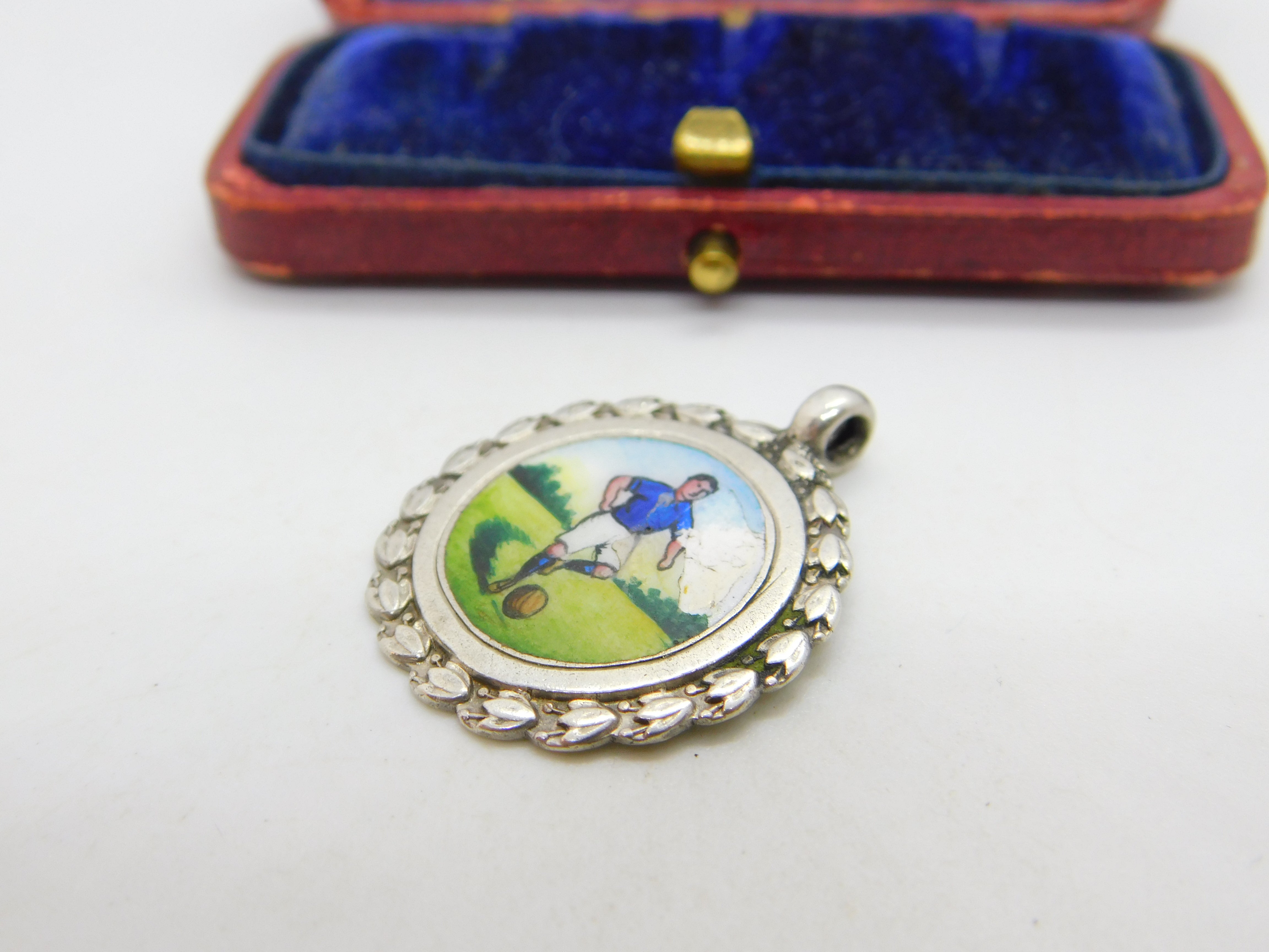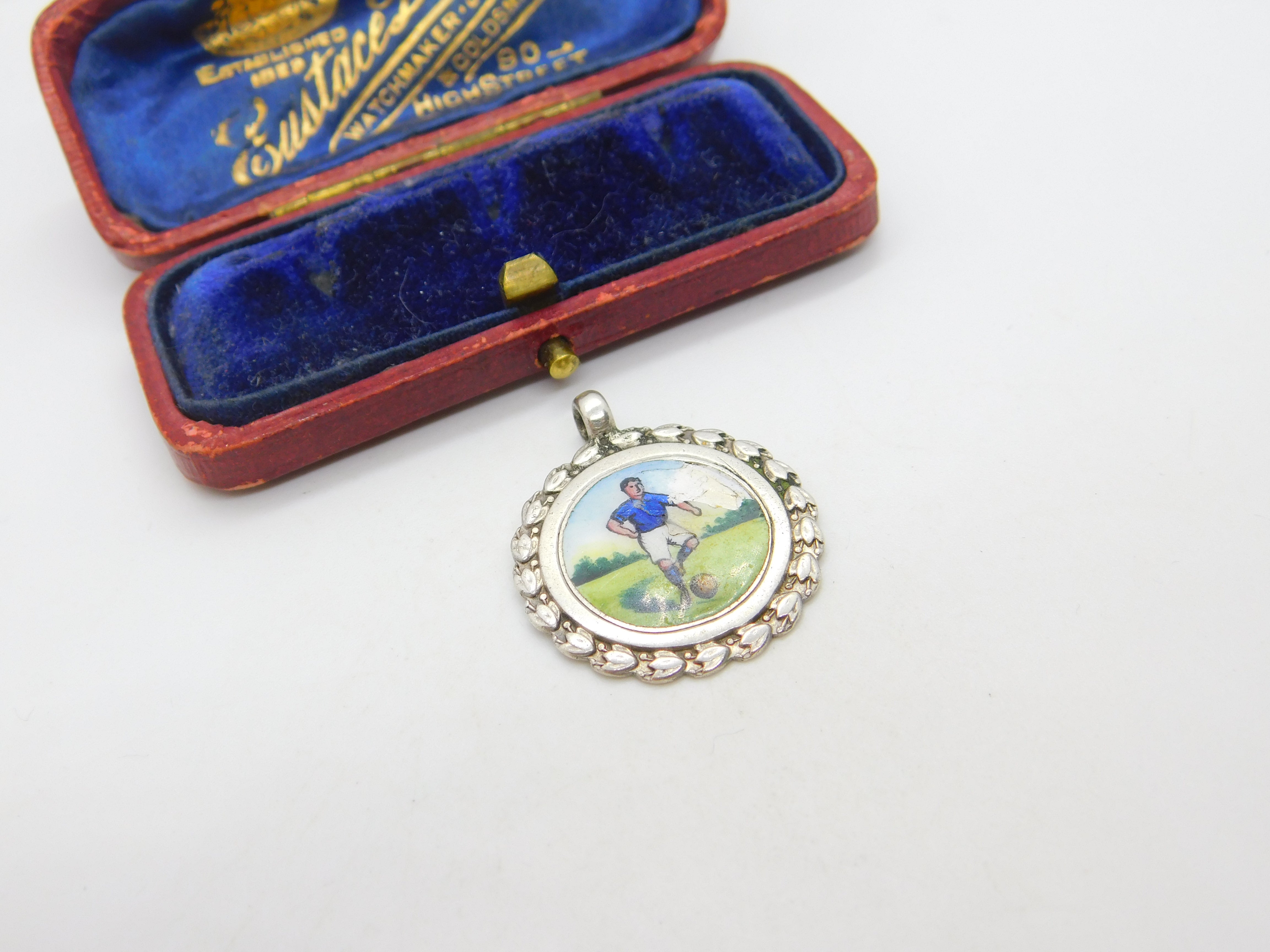 Details: A fantastic and wonderfully designed antique art deco sterling silver colourful enamel football soccer player sporting fob medal hallmarked Birmingham 1922 to the reverse. Chip to the left side of the enamel. This is a wonderful item that would make a perfect gift or addition to any collection. The BOX pictured is for PRESENTATION ONLY and is NOT included in the listings but used to frame the pictures unless specifically stated otherwise.