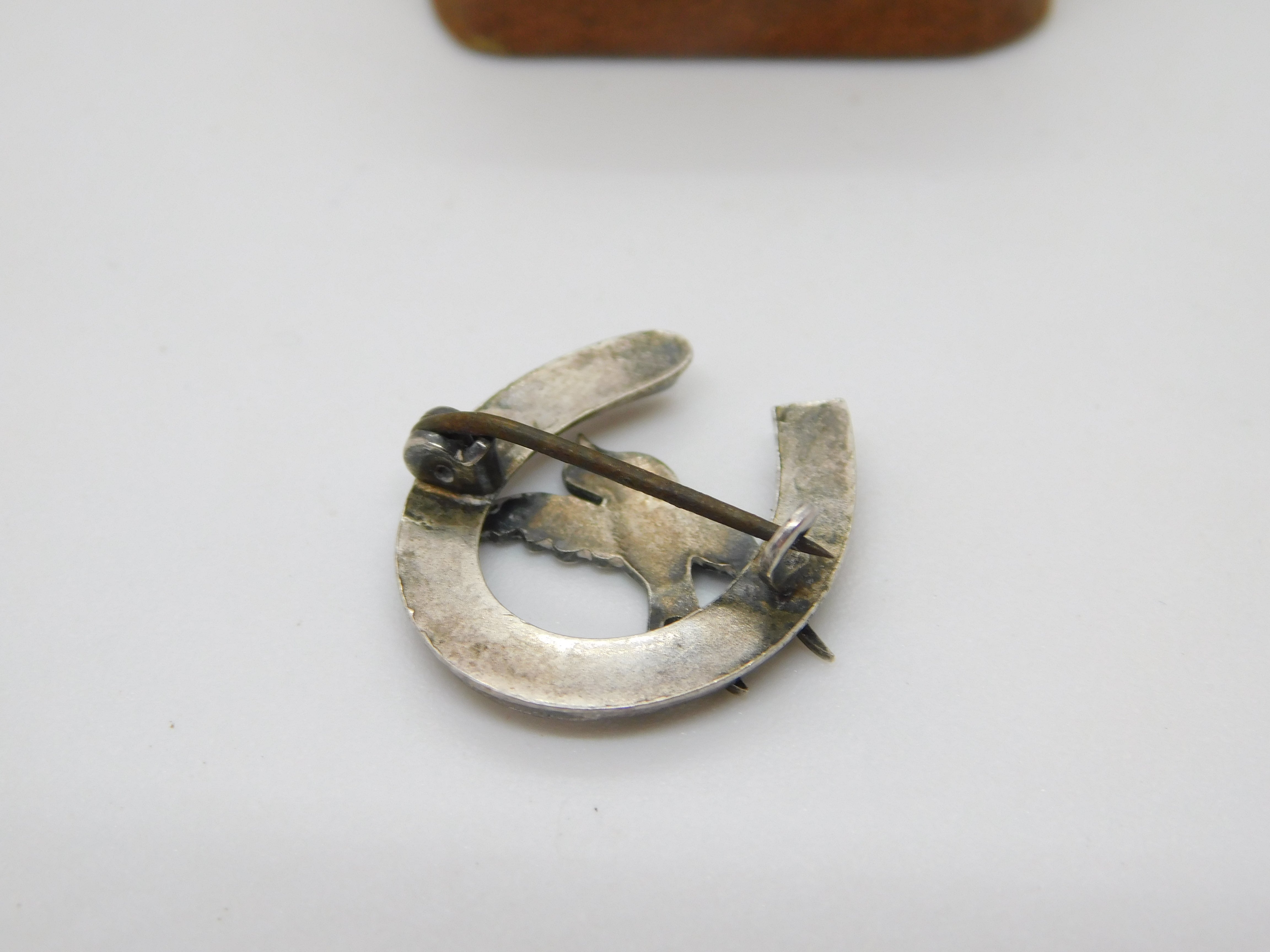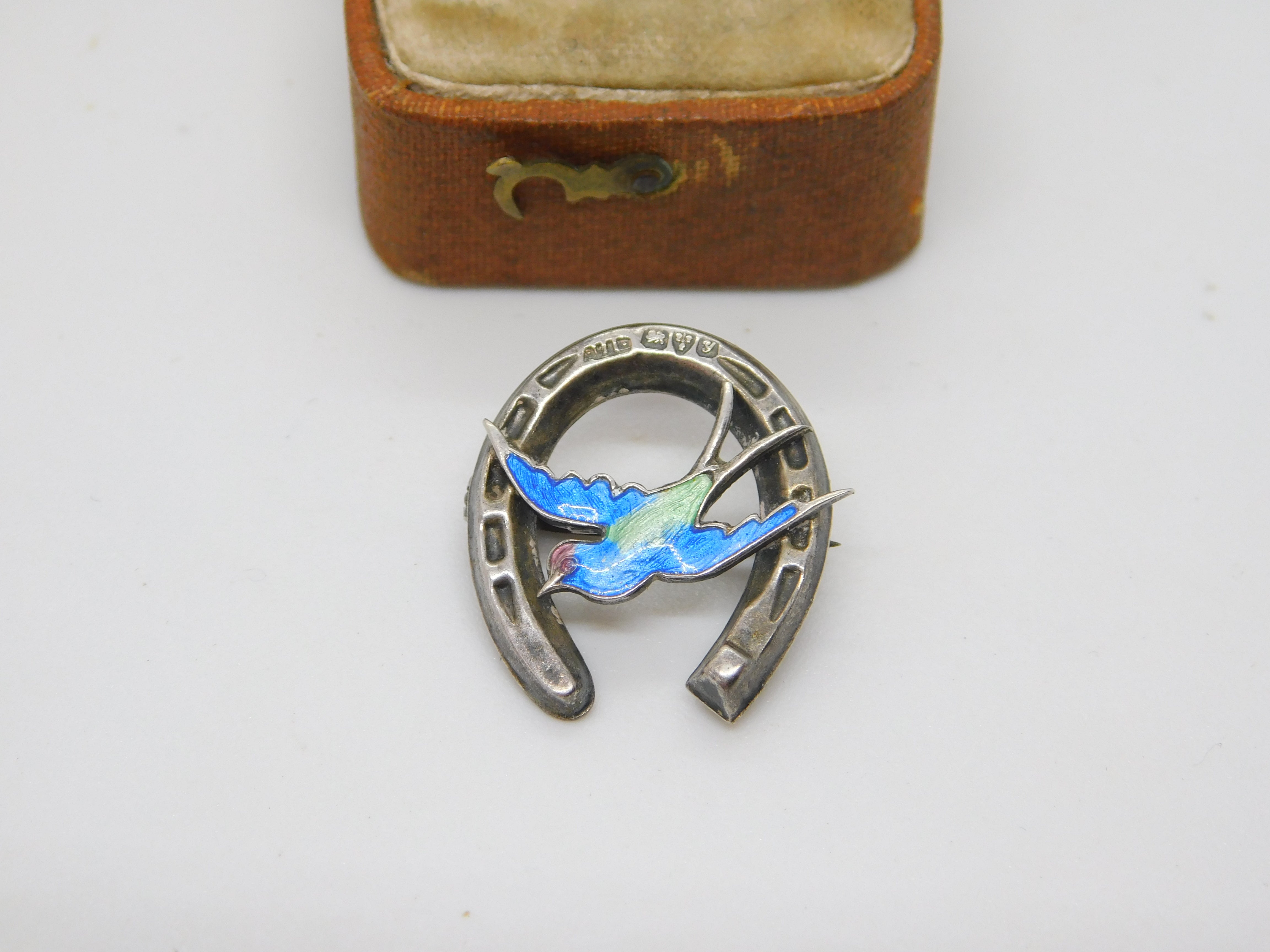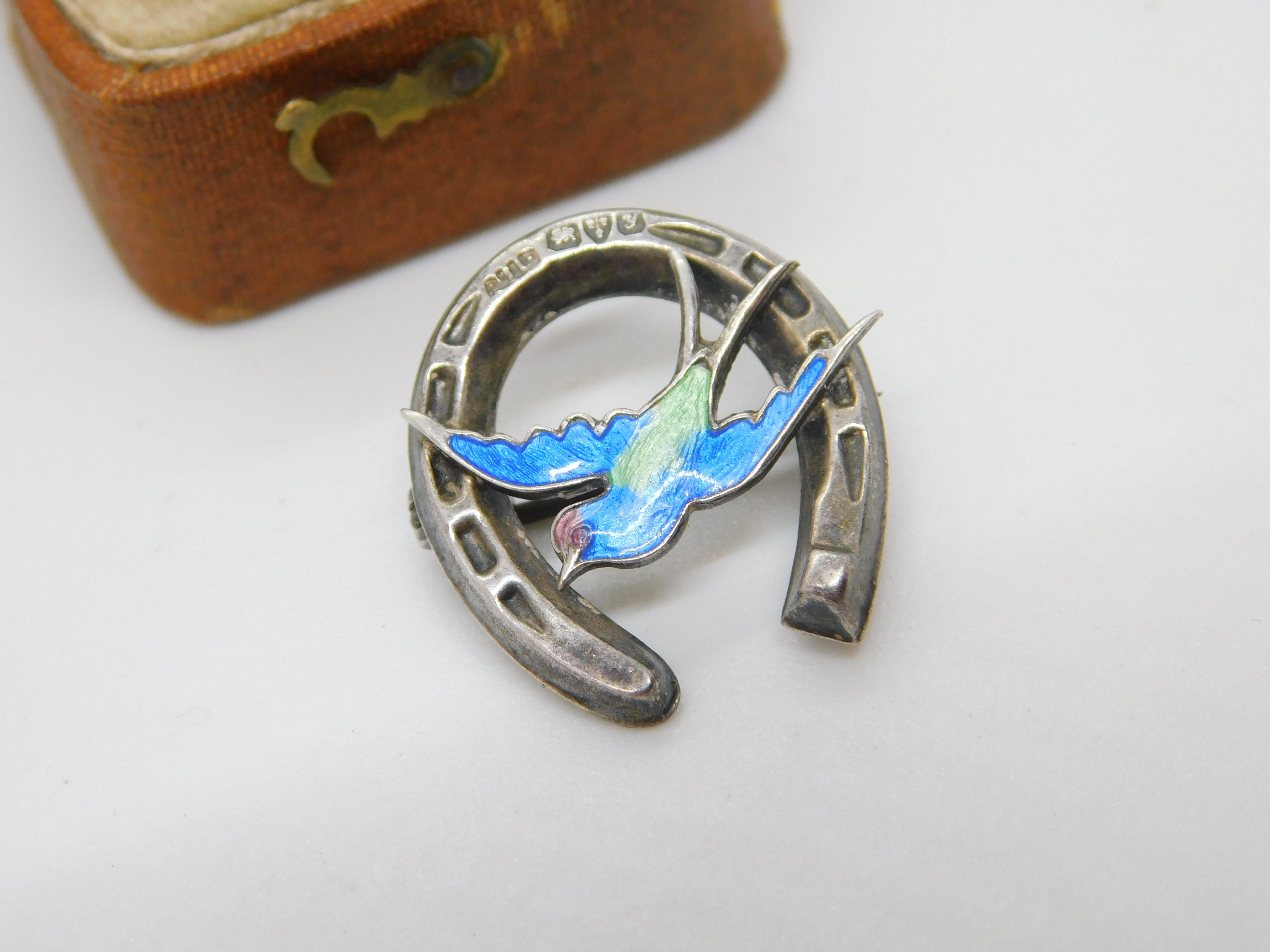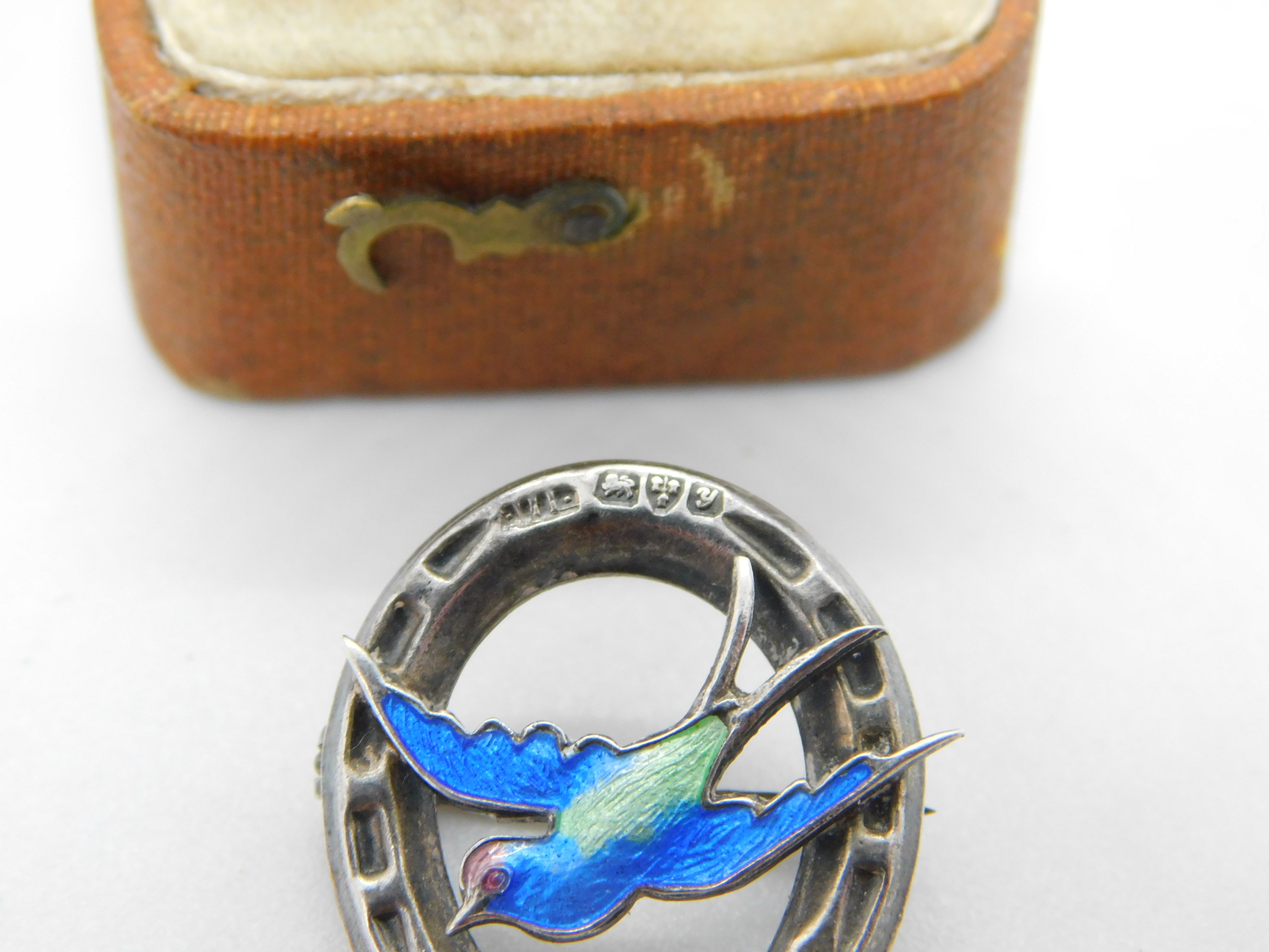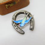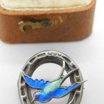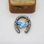Sterling Silver Enamel Swallow & Horseshoe Sweetheart Brooch 1924 Antique