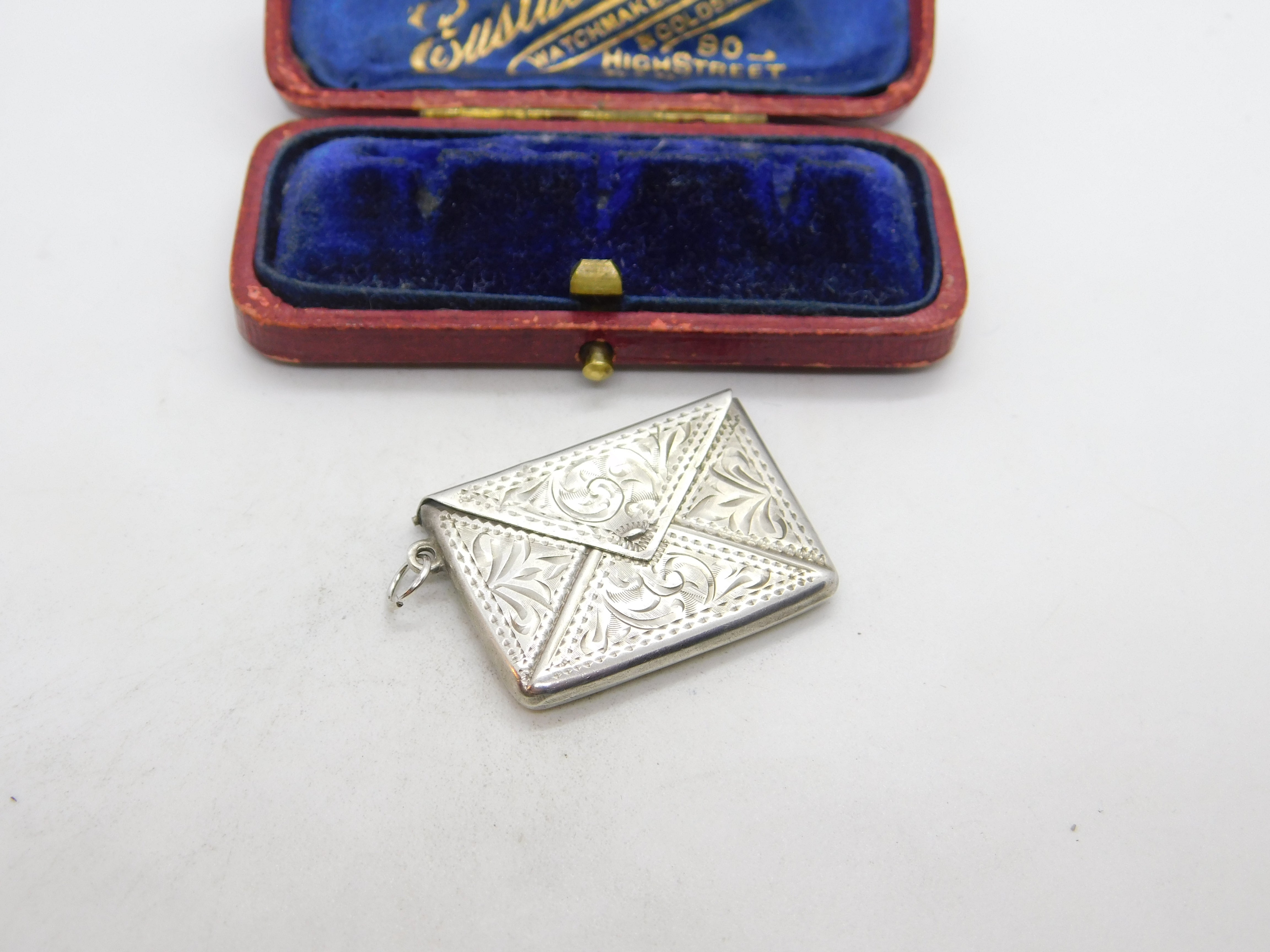 Details: A fantastic and wonderfully designed antique art deco sterling silver floral pattern envelope form stamp case fob pendant hallmarked to the interior c1940. This is a wonderful item that would make a perfect gift or addition to any collection. The BOX pictured is for PRESENTATION ONLY and is NOT included in the listings but used to frame the pictures unless specifically stated otherwise.