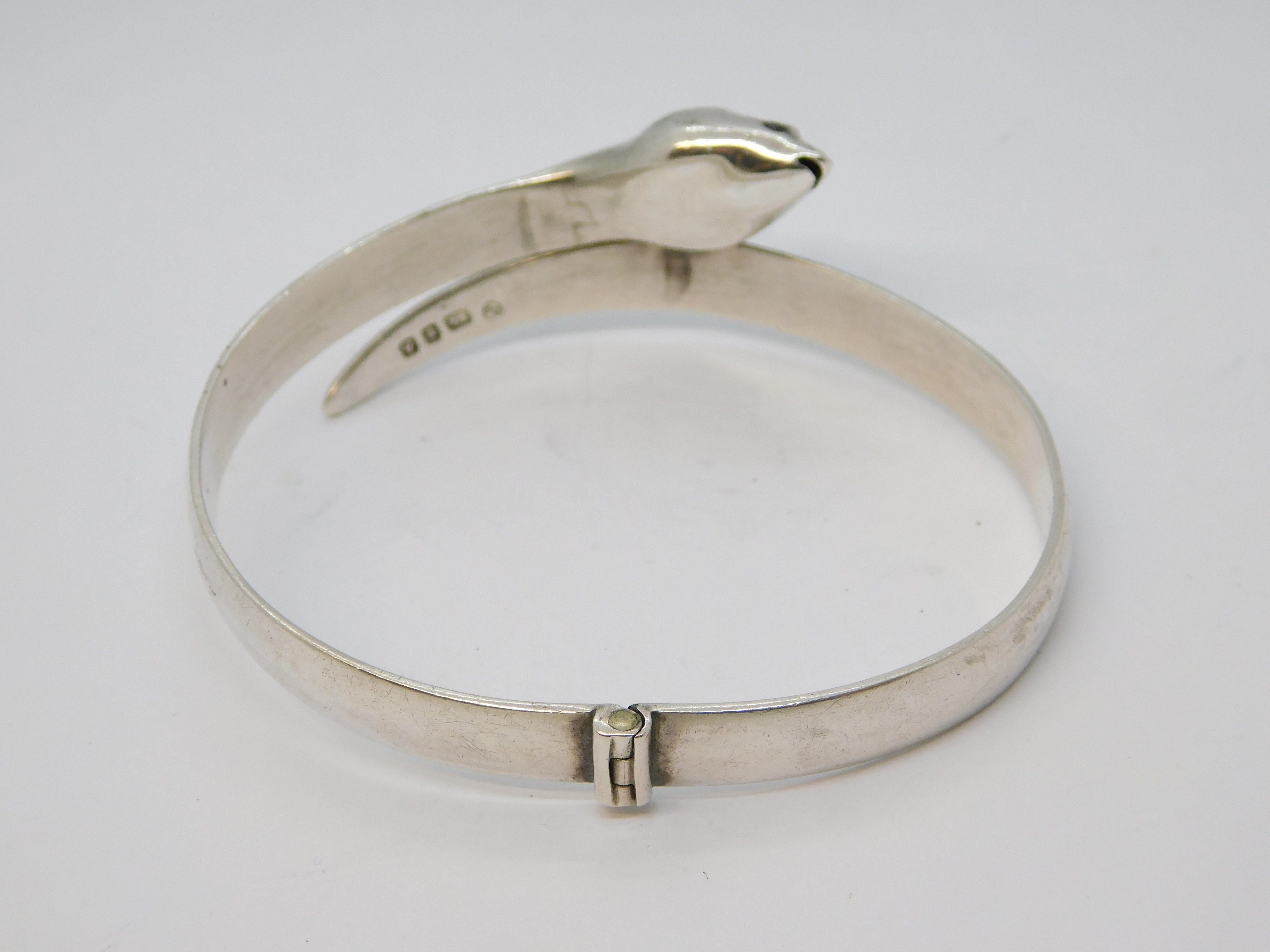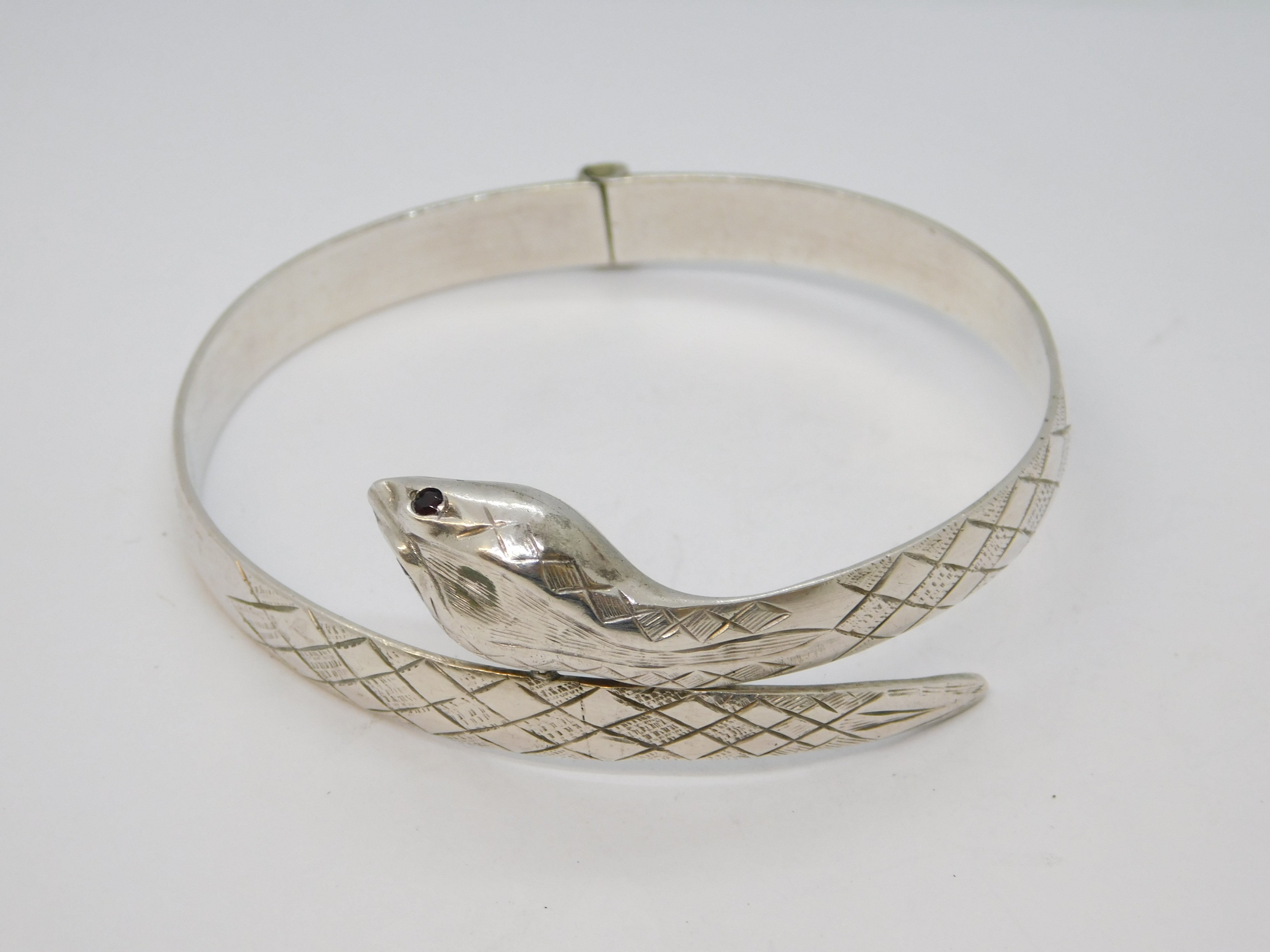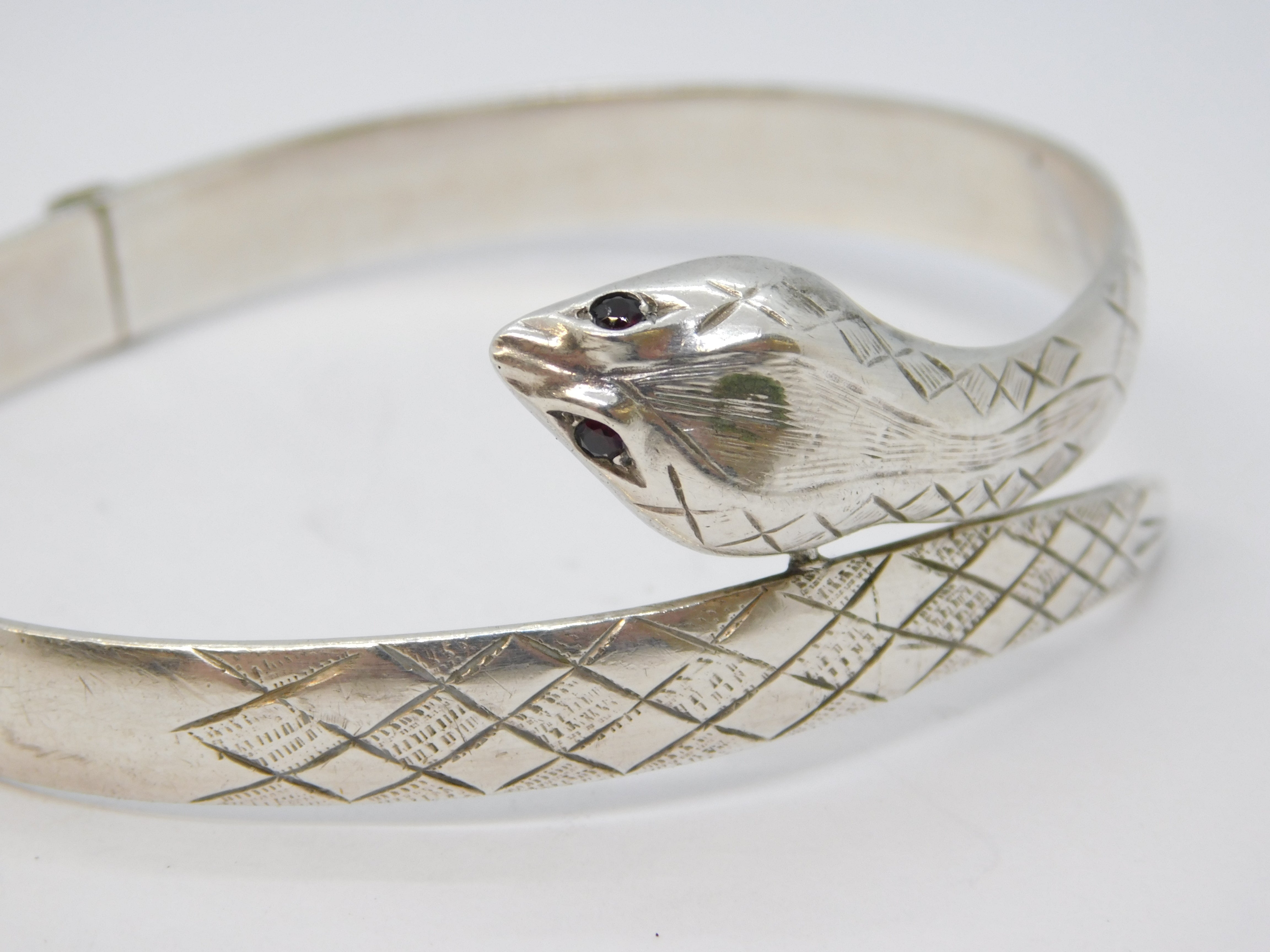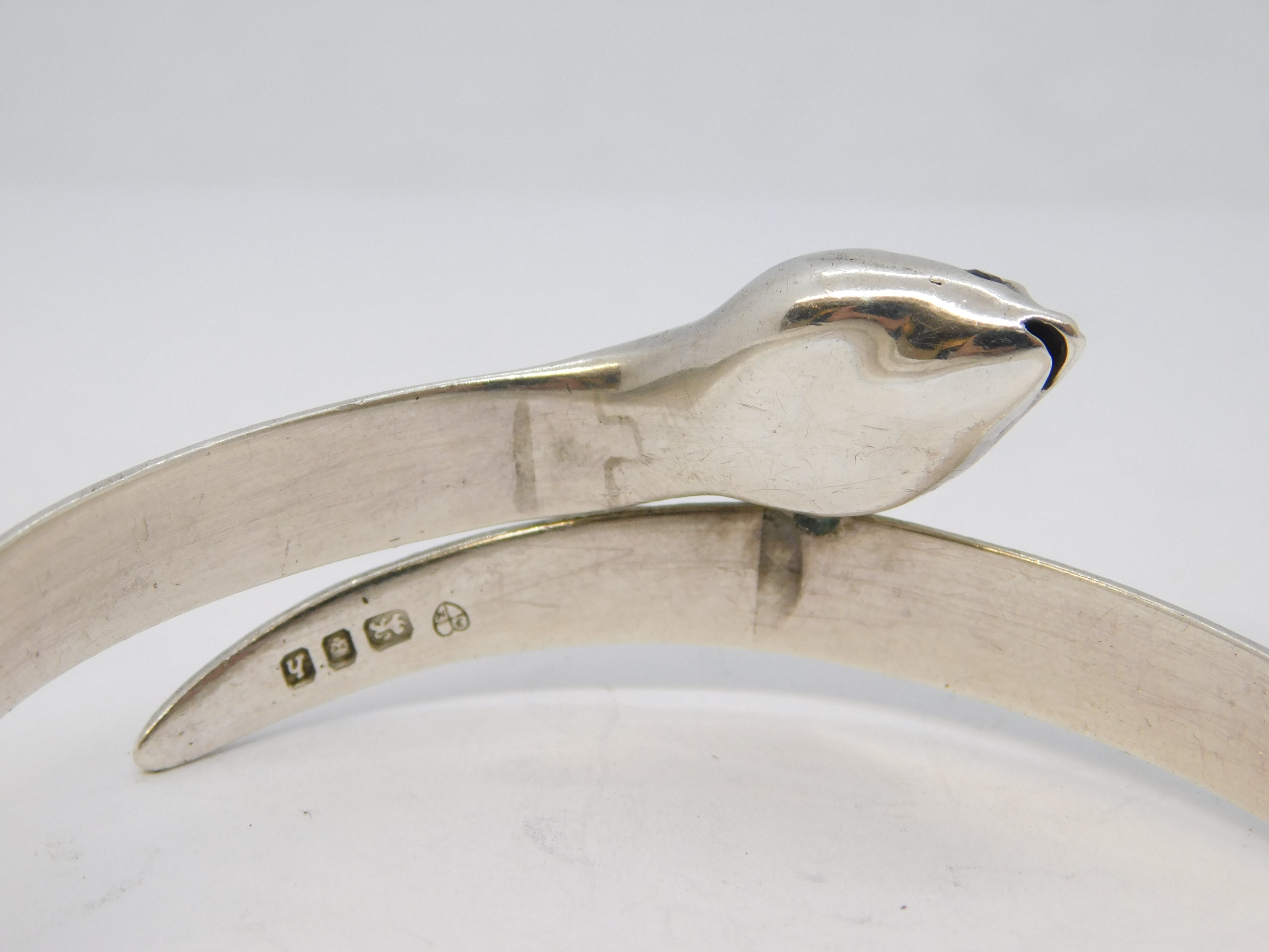 Details: A fantastic and wonderfully designed vintage sterling silver snake or serpent cuff bangle bracelet set with garnet eyes hallmarked London 1963 to the interior. This is a wonderful item that would make a perfect gift or addition to any collection. We are more than happy to provide XRF reports for items upon request.