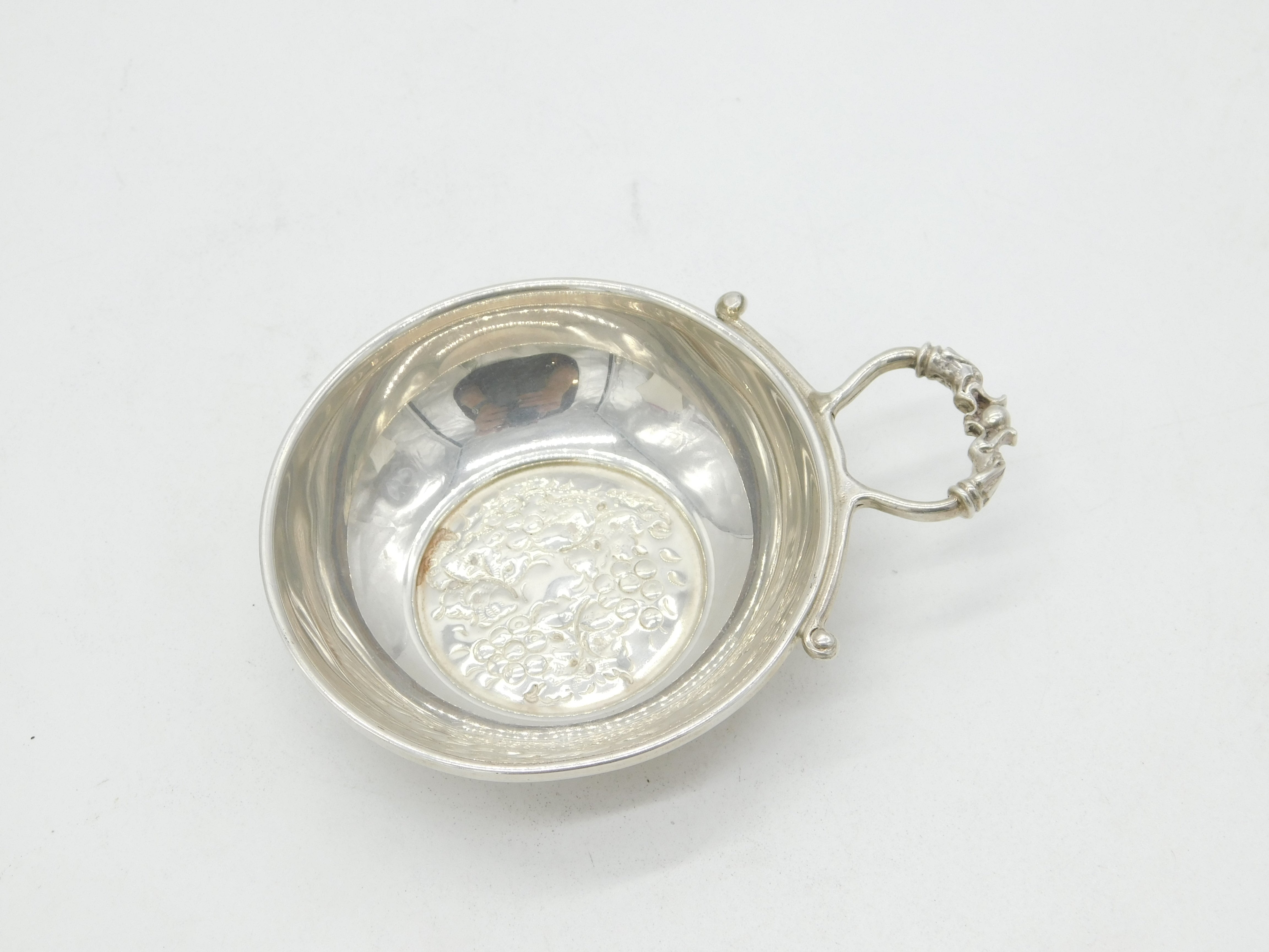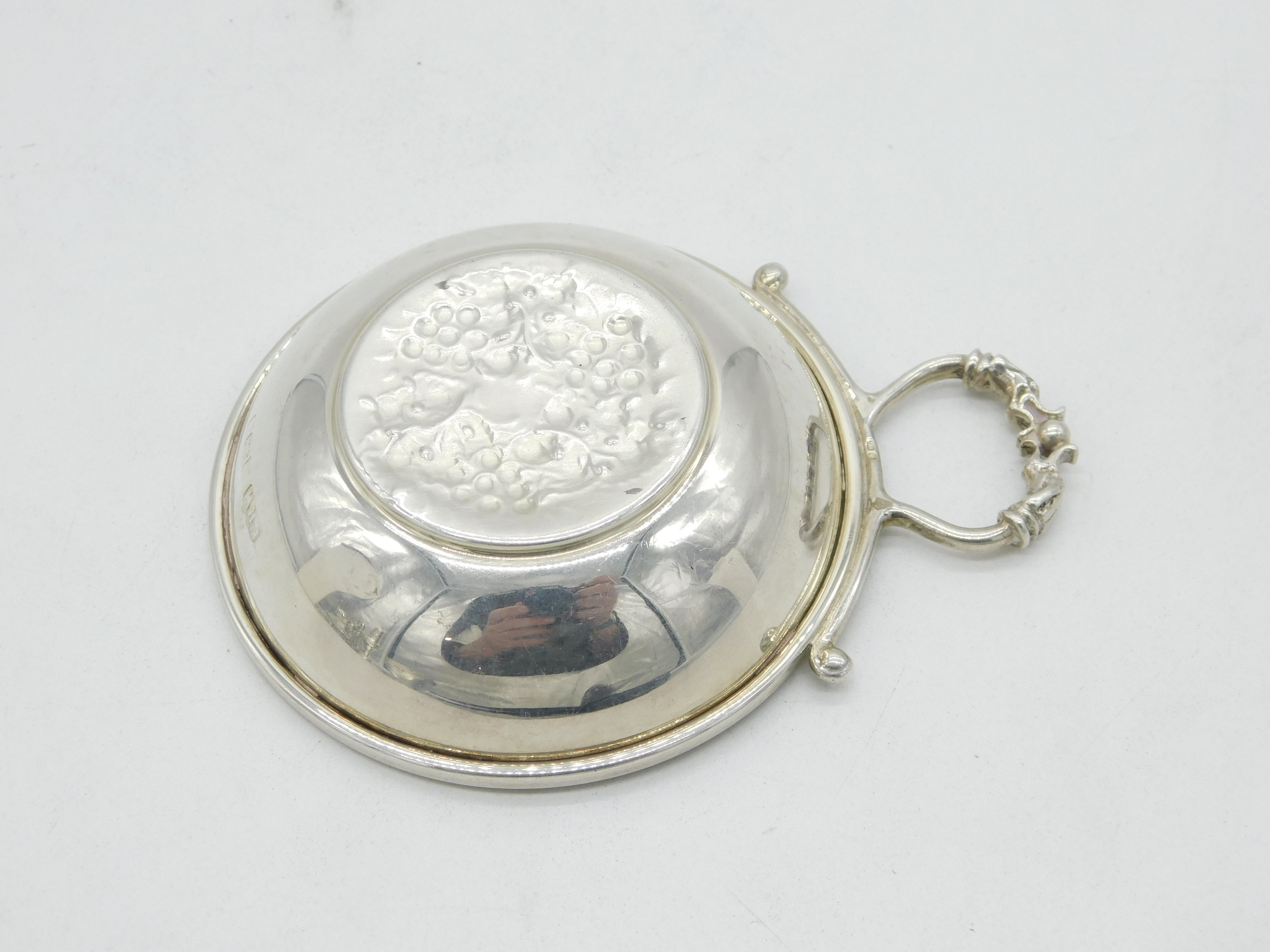 Details: A fantastic and wonderfully designed vintage sterling silver grape pattern tastevin or wine taster with charming detailing hallmarked Birmingham 1979 to the edge by maker Lawrence R Watson & Co. This is a wonderful item that would make a perfect gift or addition to any collection.