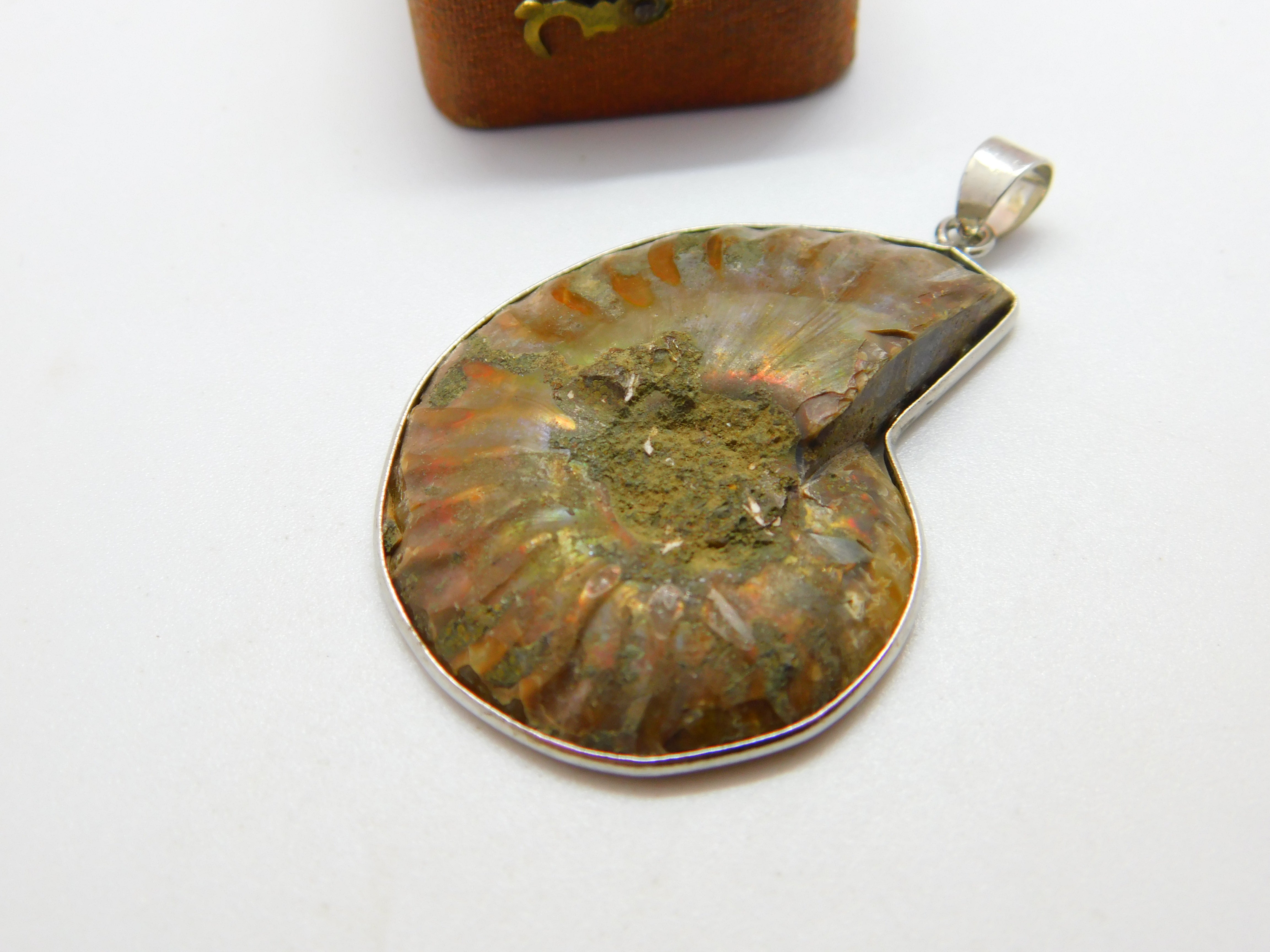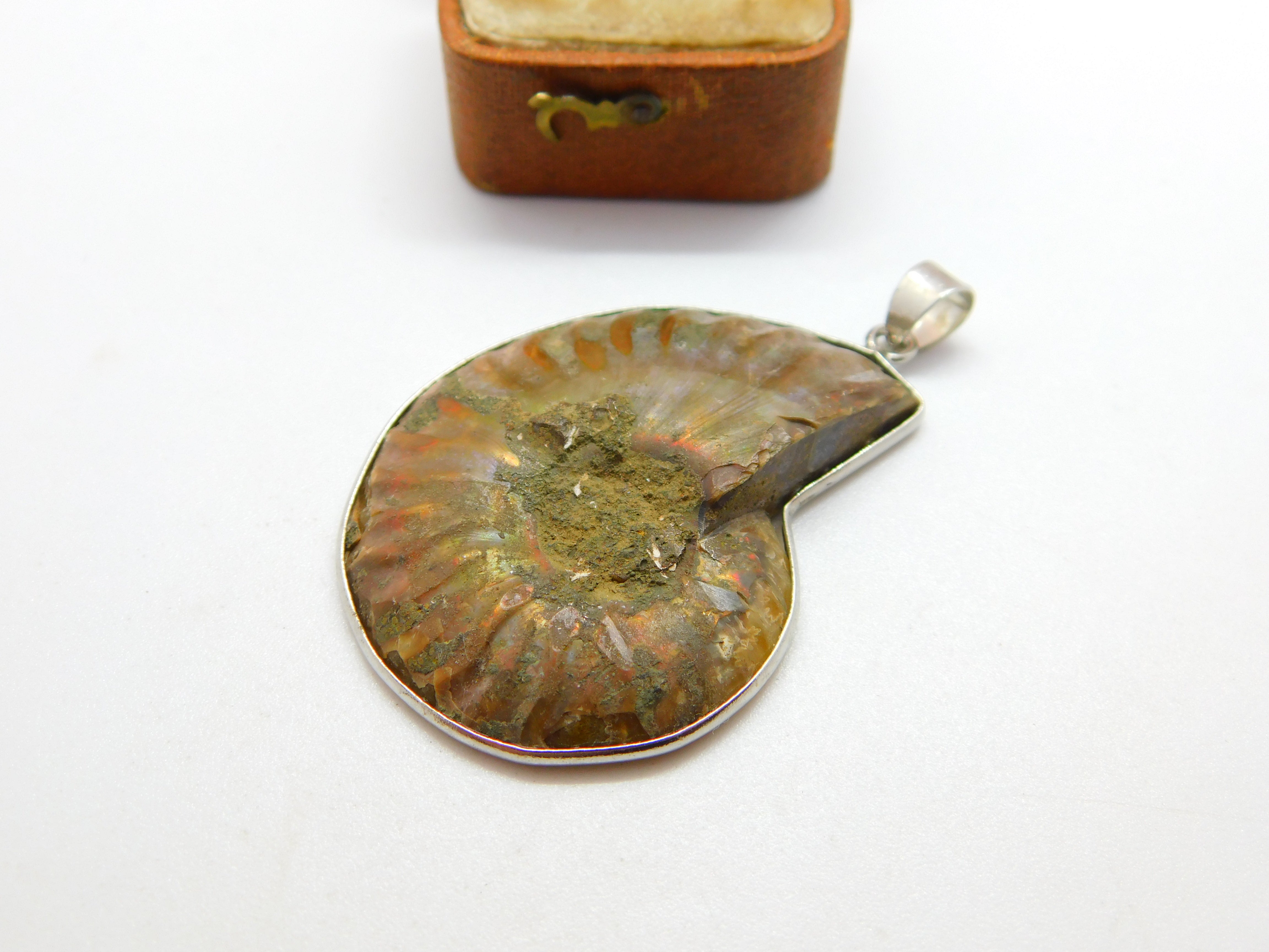 Details: A fantastic and wonderfully designed vintage sterling silver mounted large ammonite fossil set drop pendant c1970. This is a wonderful item that would make a perfect gift or addition to any collection. The BOX pictured is for PRESENTATION ONLY and is NOT included in the listings but used to frame the pictures unless specifically stated otherwise.