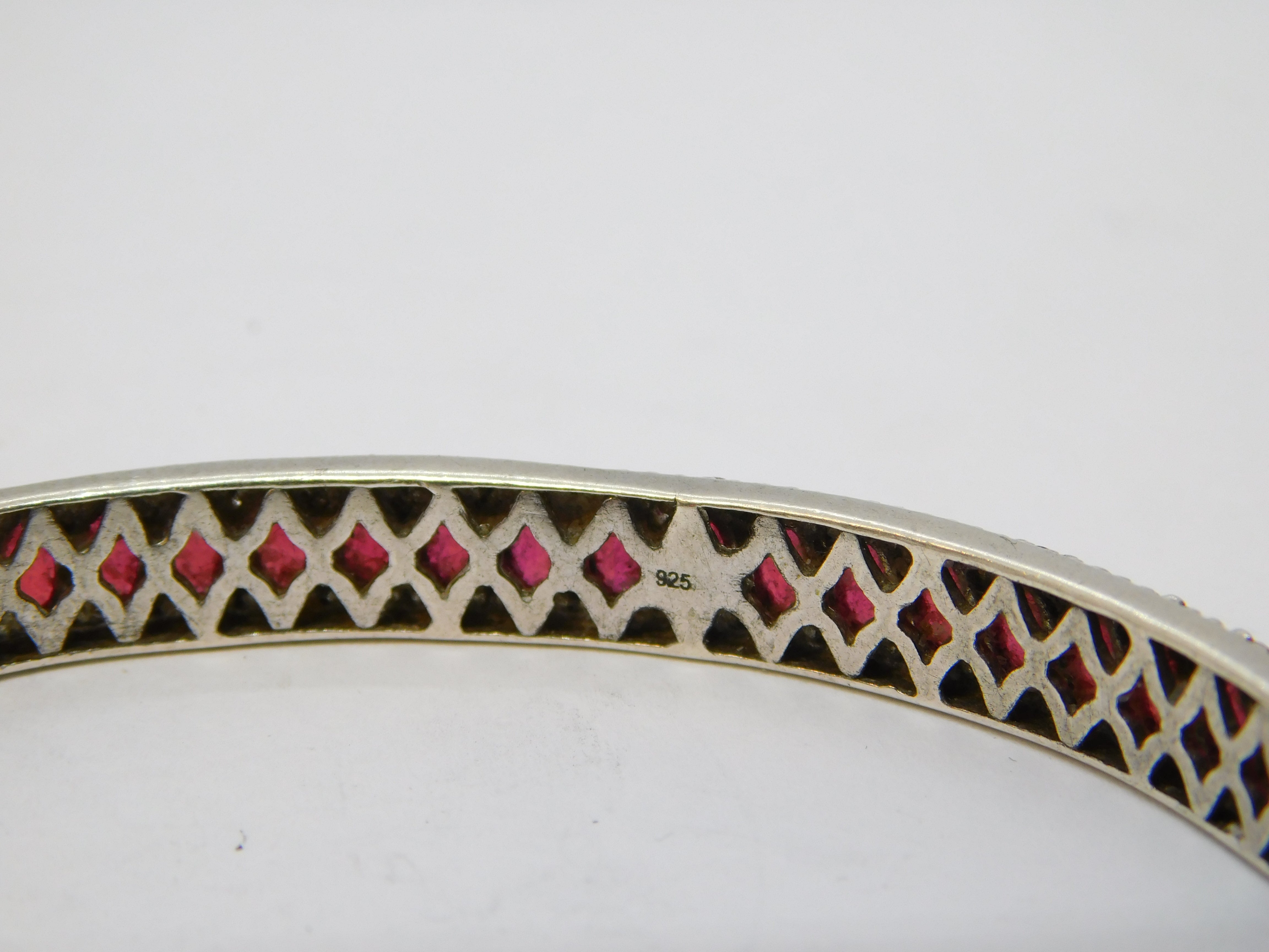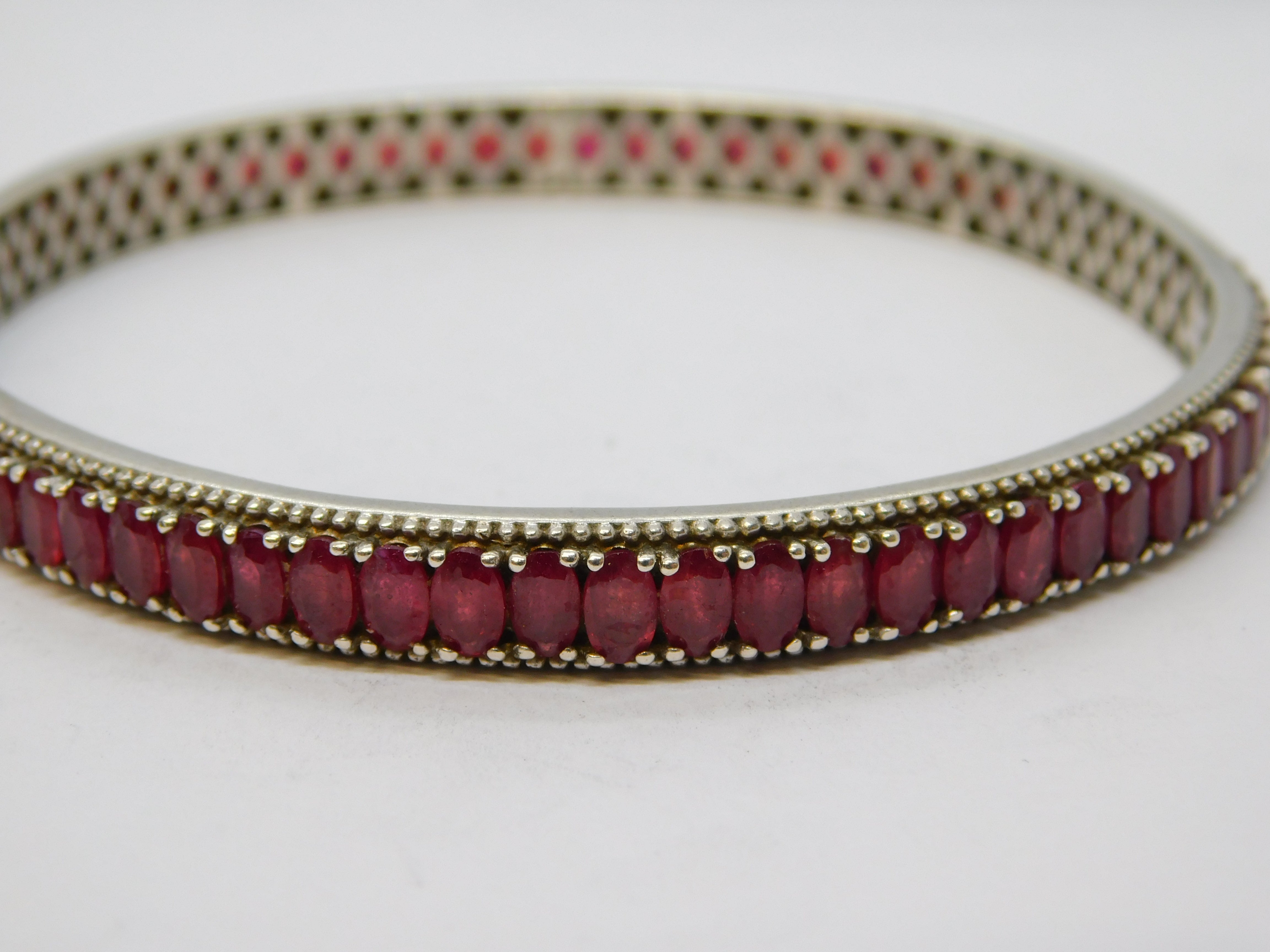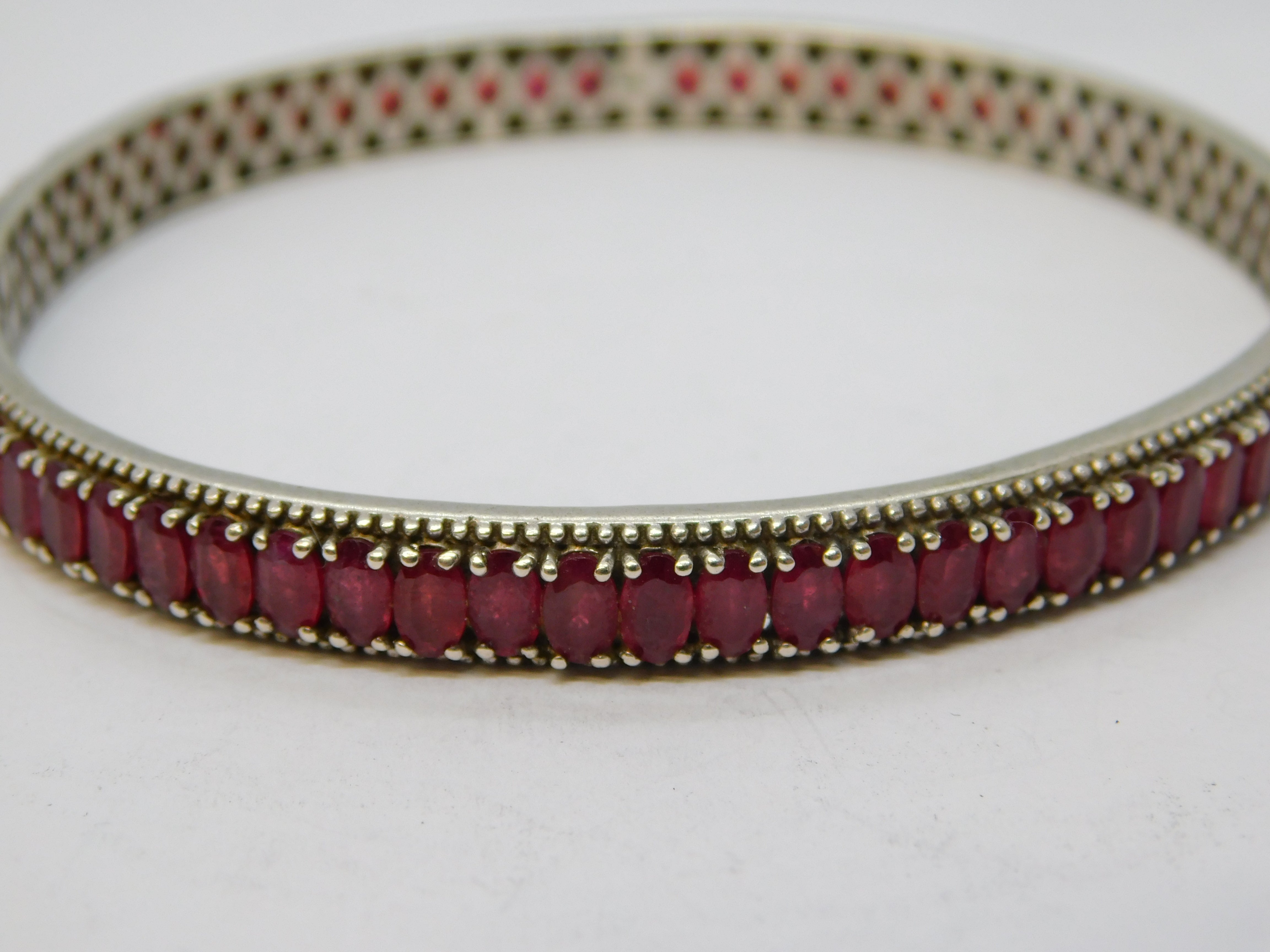Details: A fantastic and wonderfully designed vintage sterling silver eternity bangle bracelet set with marquise cut ruby stones hallmarked to the interior, the bangle is slightly misshapen and has a very tiny split to the silver, the stones have all been tested. This is a wonderful item that would make a perfect gift or addition to any collection. We are more than happy to provide XRF reports for items upon request.