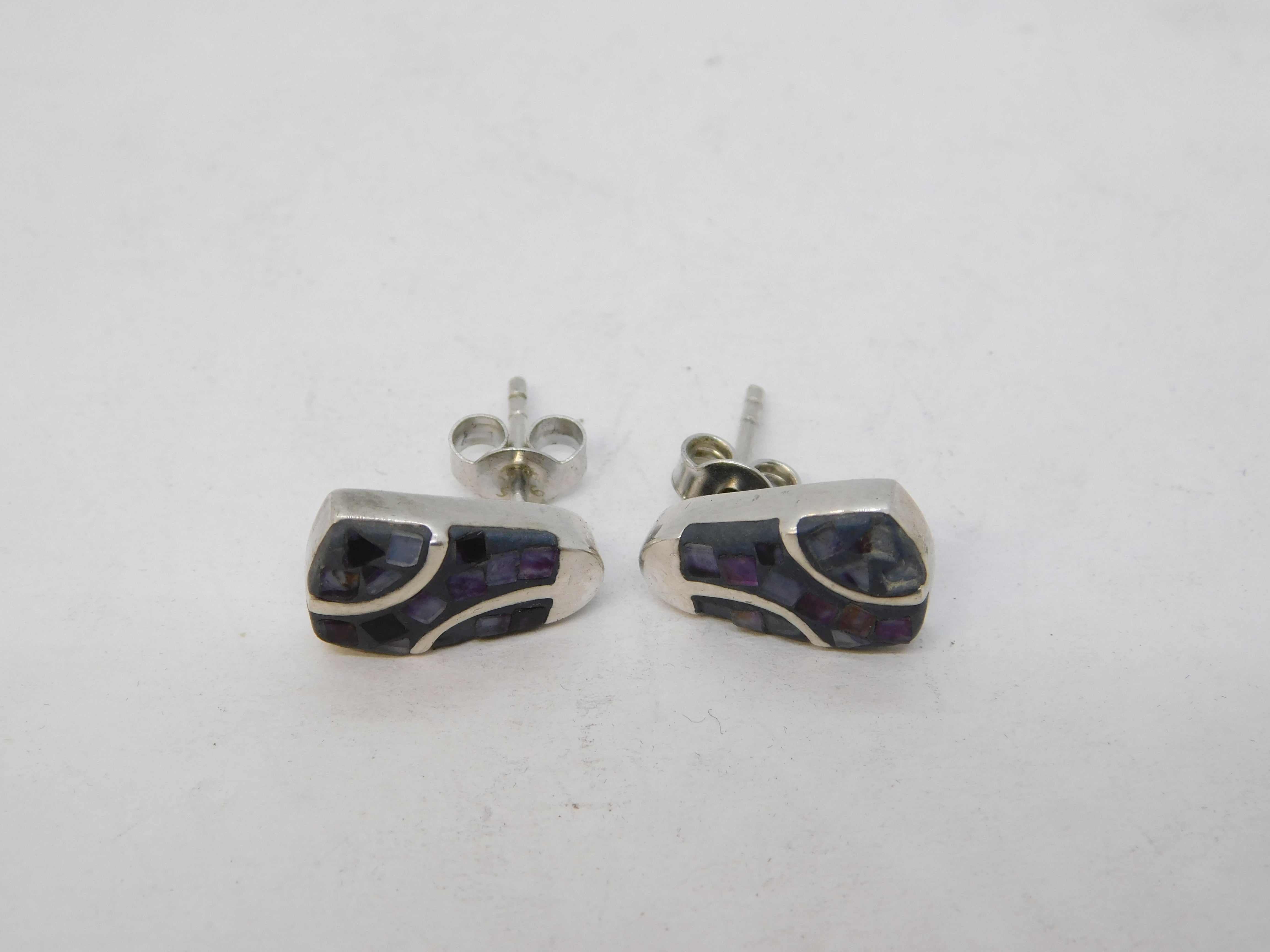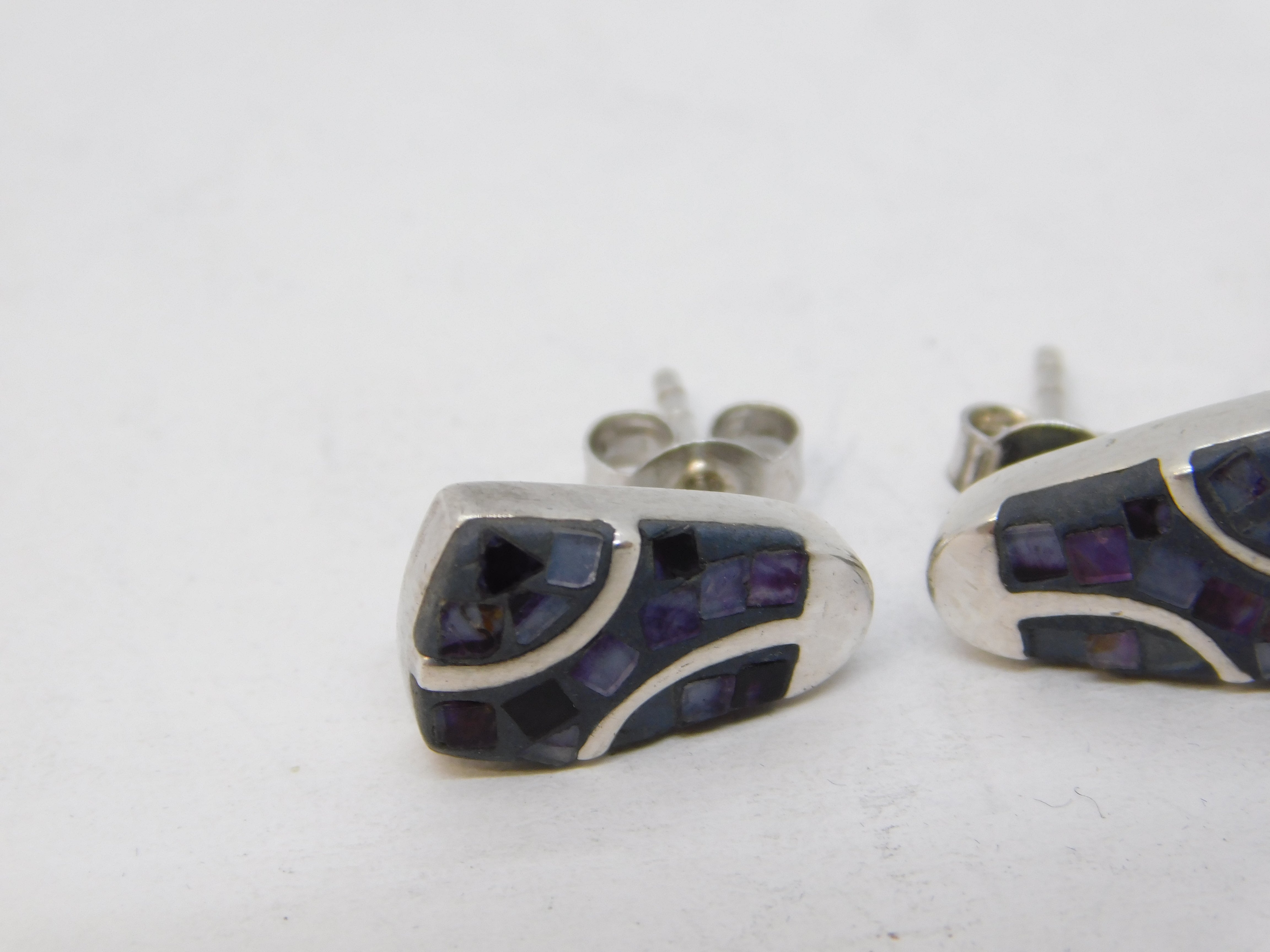 Details: A fantastic and wonderfully designed sterling silver & Derbyshire blue john stud earrings with lovely detailing c1970. This is a wonderful item that would make a perfect gift or addition to any collection.