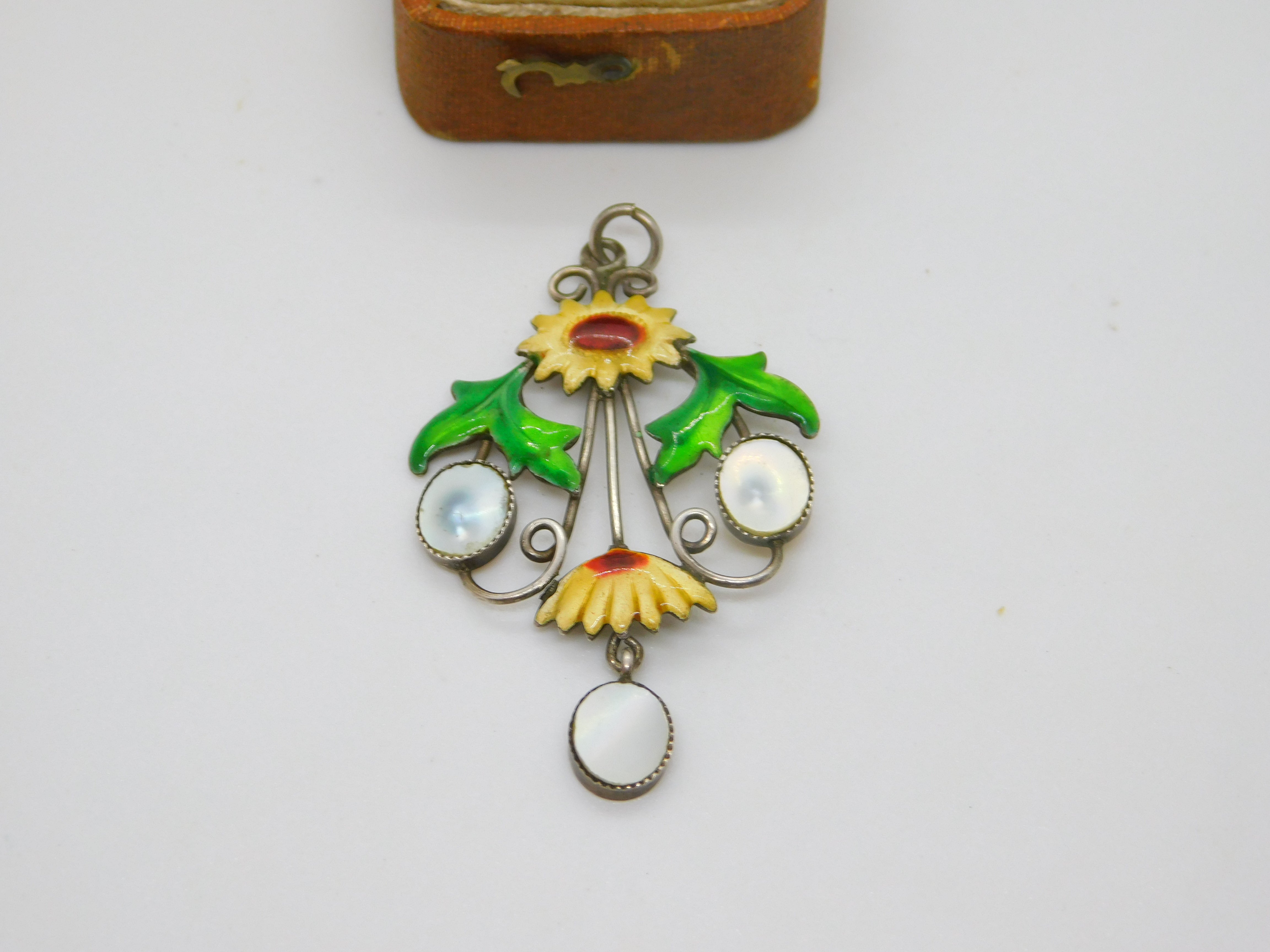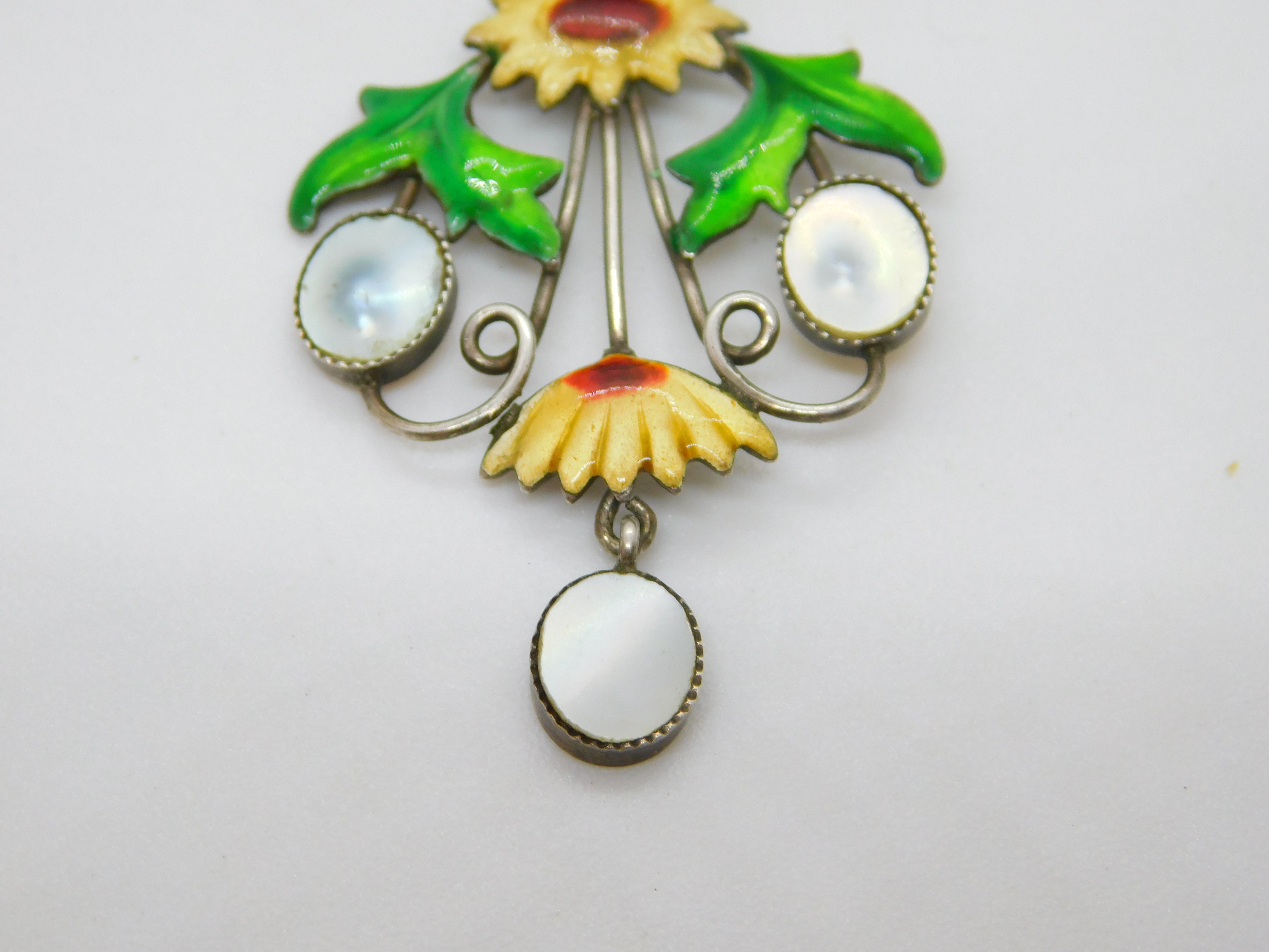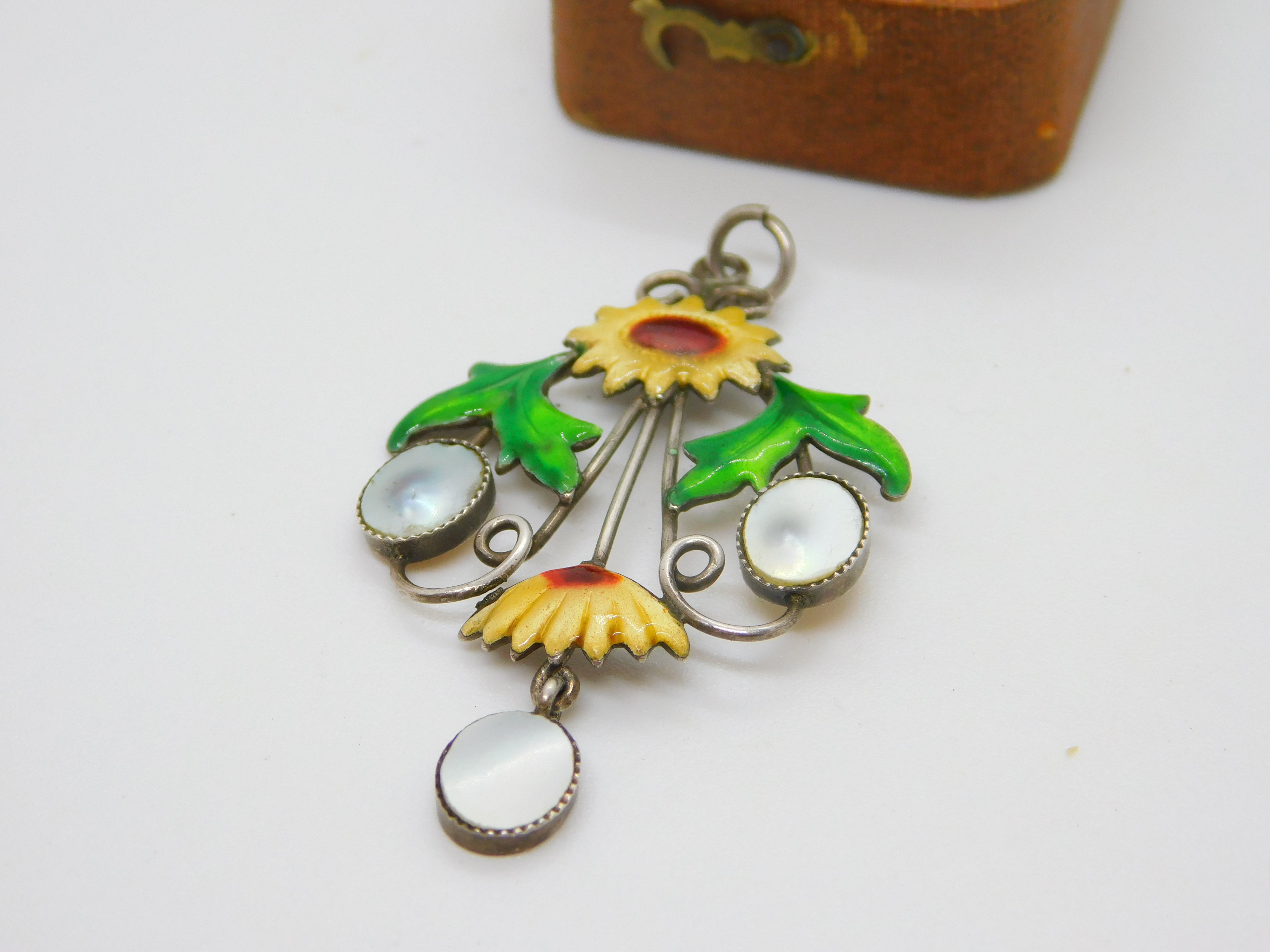 Details: A fantastic and wonderfully designed antique art deco sterling silver lavalier drop pendant adorned with superb enamel and mother of pearl depciting sunflowers c1920, the silver has been XRF tested, ename in good condition. This is a wonderful item that would make a perfect gift or addition to any collection. The BOX pictured is for PRESENTATION ONLY and is NOT included in the listings but used to frame the pictures unless specifically stated otherwise.