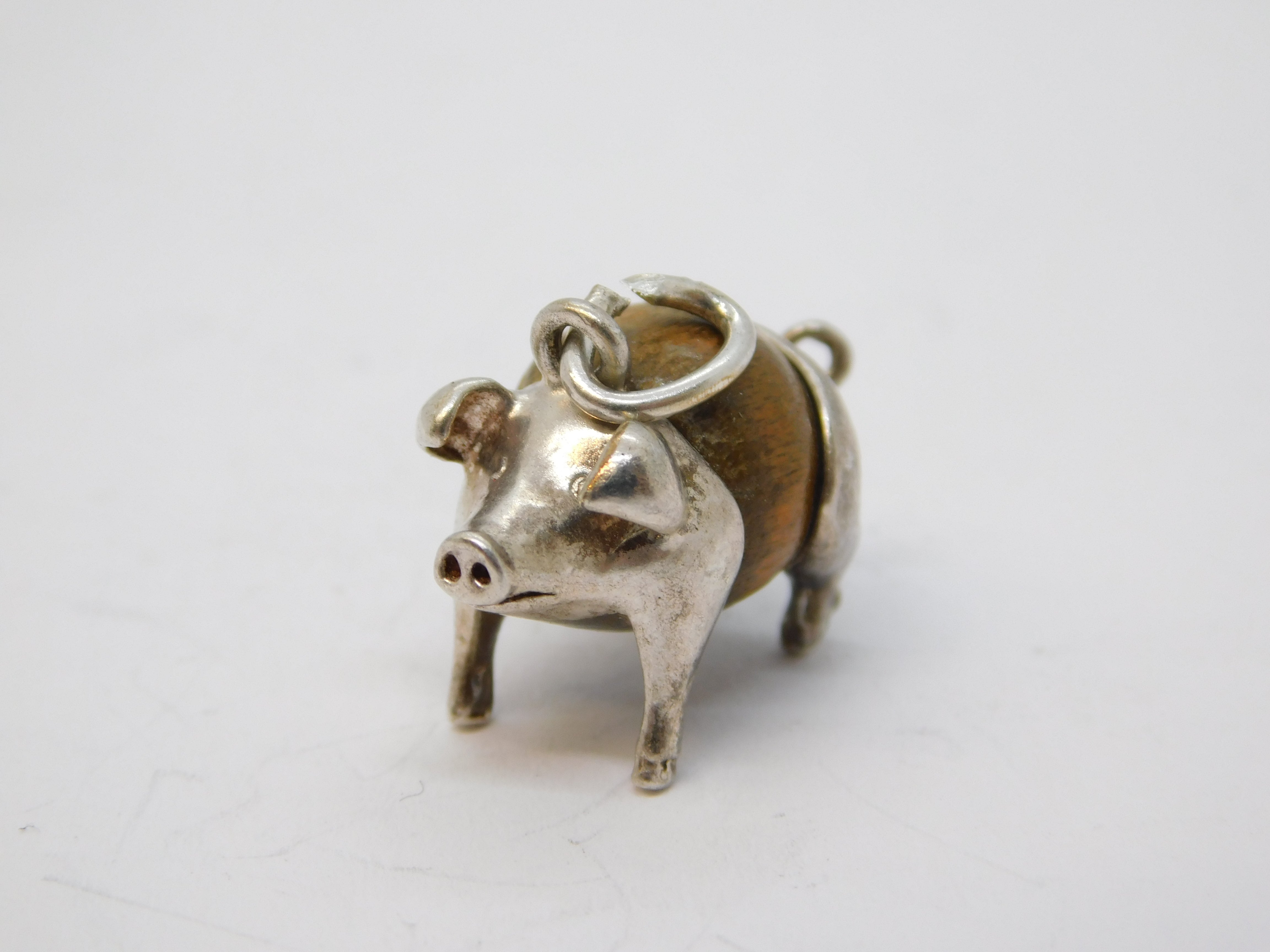 Details: A fantastic and wonderfully designed vintage sterling silver & carved oak wood set pig charm pendant faintly marked c1950. This is a wonderful item that would make a perfect gift or addition to any collection. We are more than happy to provide XRF reports for items upon request.