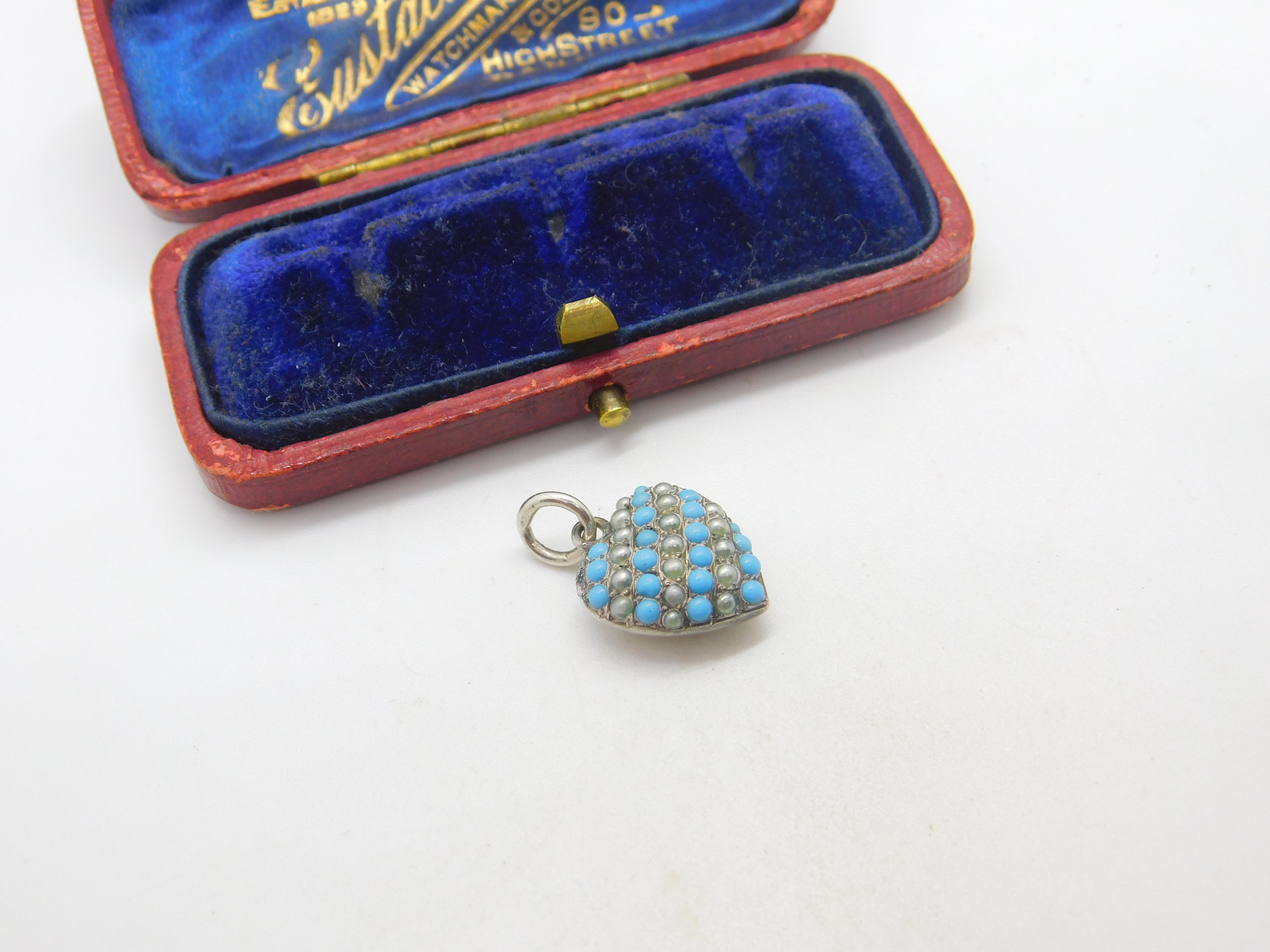 Details: A fantastic and wonderfully designed antique art deco sterling silver puffy heart charm or pendant with pave set turquoise & seed pearl hallmarked to the reverse c1920 missing two small pearls to the left corner. This is a wonderful item that would make a perfect gift or addition to any collection. The BOX pictured is for PRESENTATION ONLY and is NOT included in the listings but used to frame the pictures unless specifically stated otherwise.