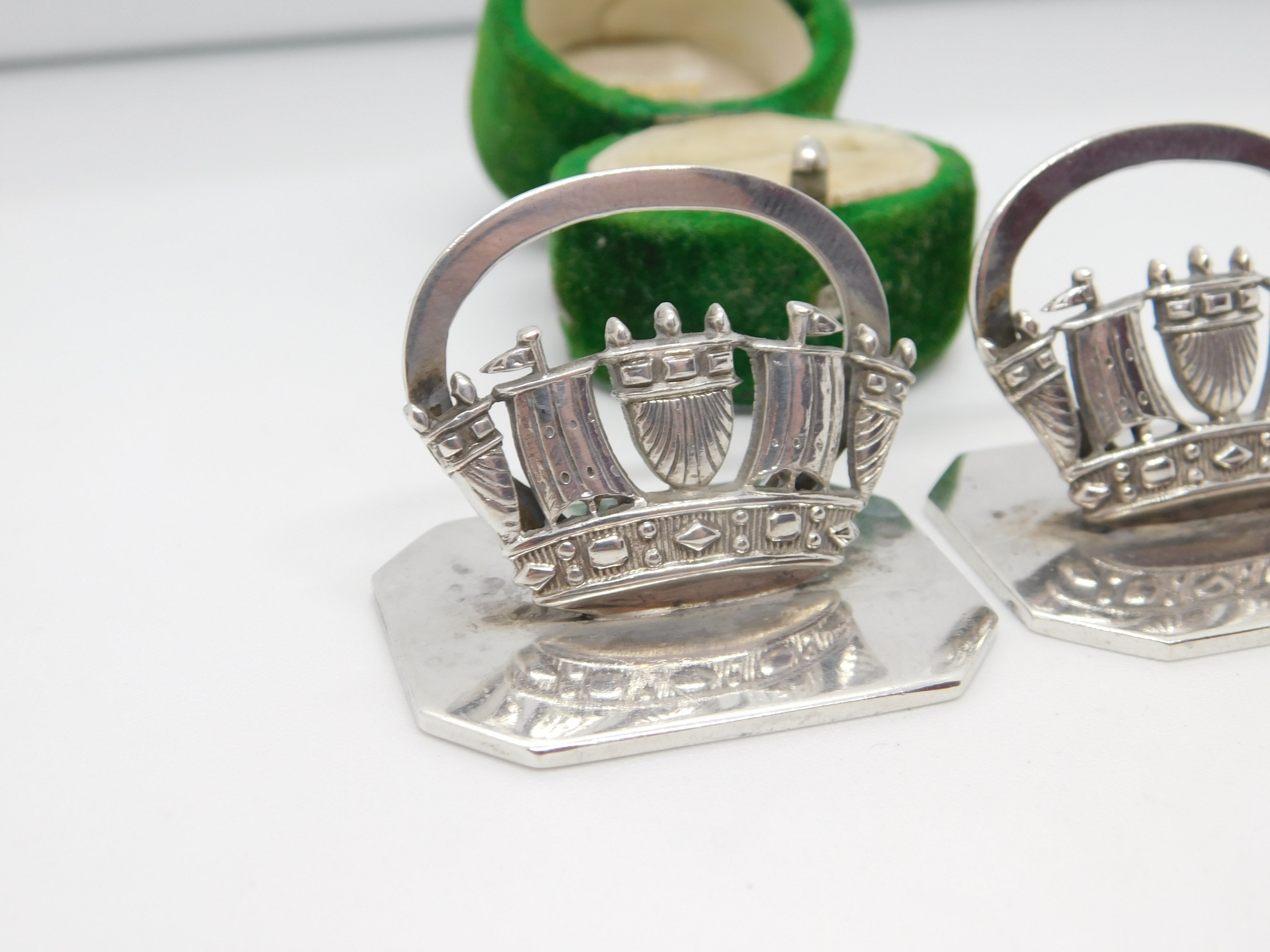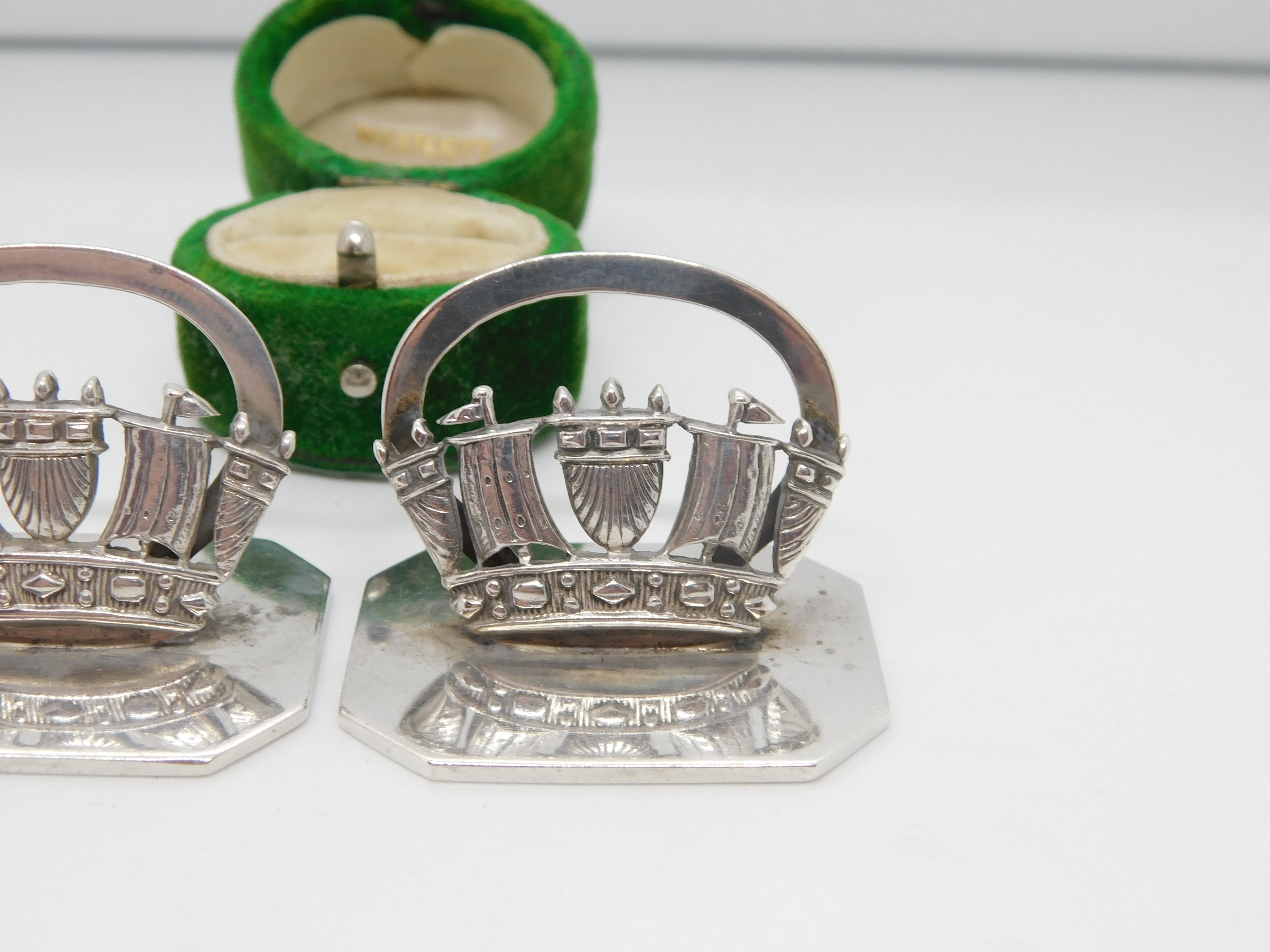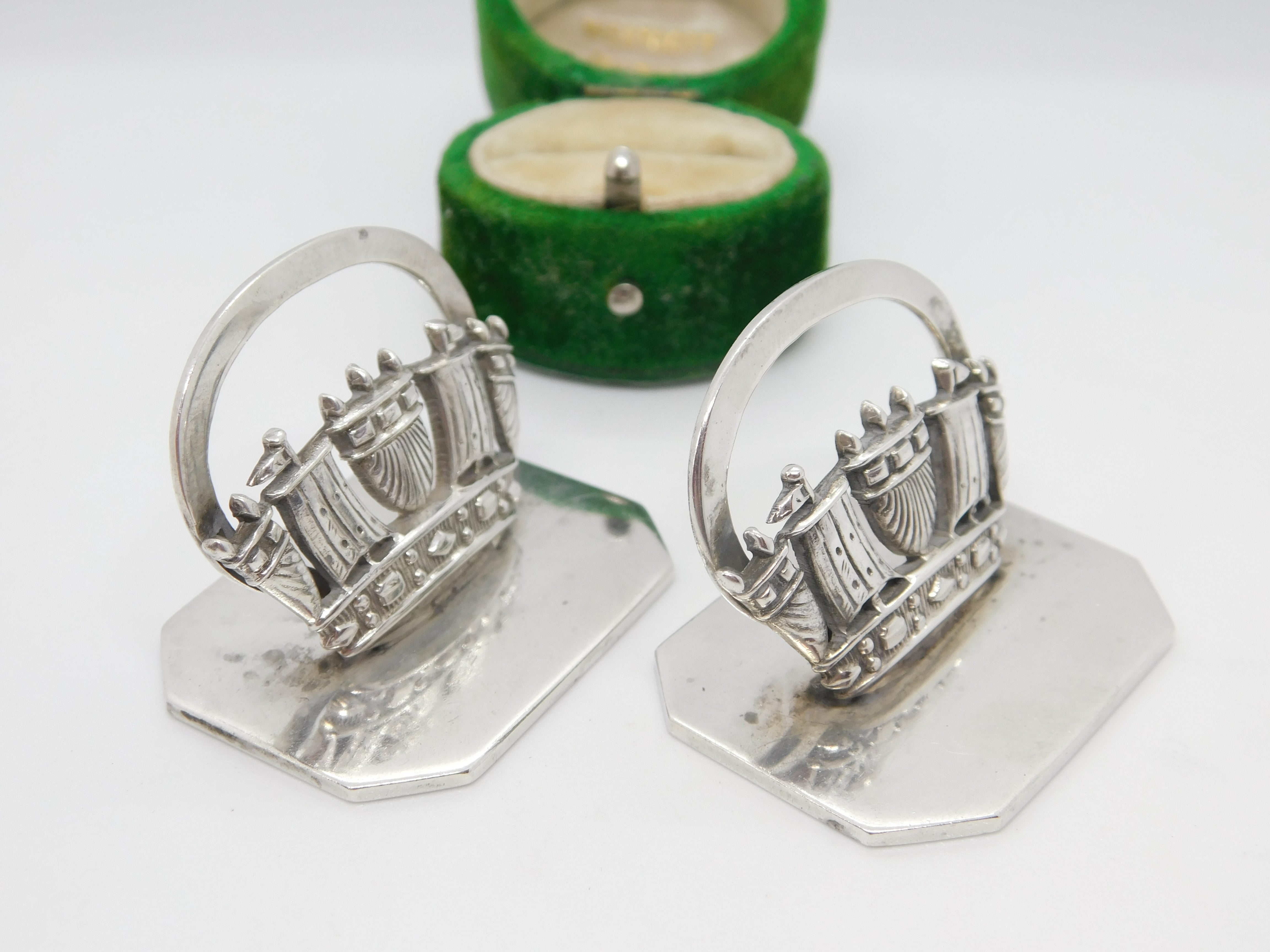Details: A fantastic and wonderfully designed antique art deco pair of sterling silver royal navy ship menu holders or place settings hallmarked Chester 1920 by John William Barrett. This is a wonderful item that would make a perfect gift or addition to any collection. The BOX pictured is for PRESENTATION ONLY and is NOT included in the listings but used to frame the pictures unless specifically stated otherwise.