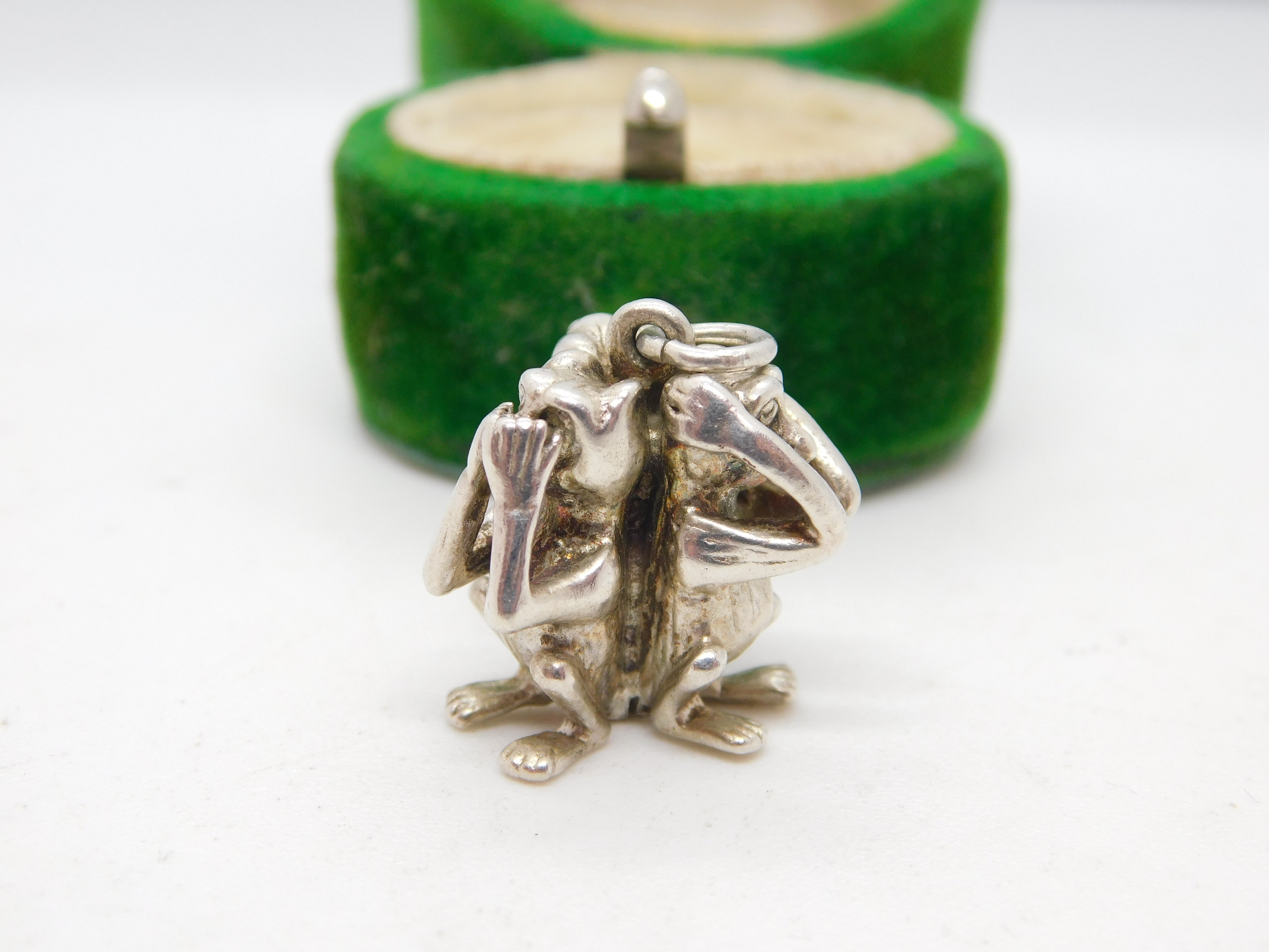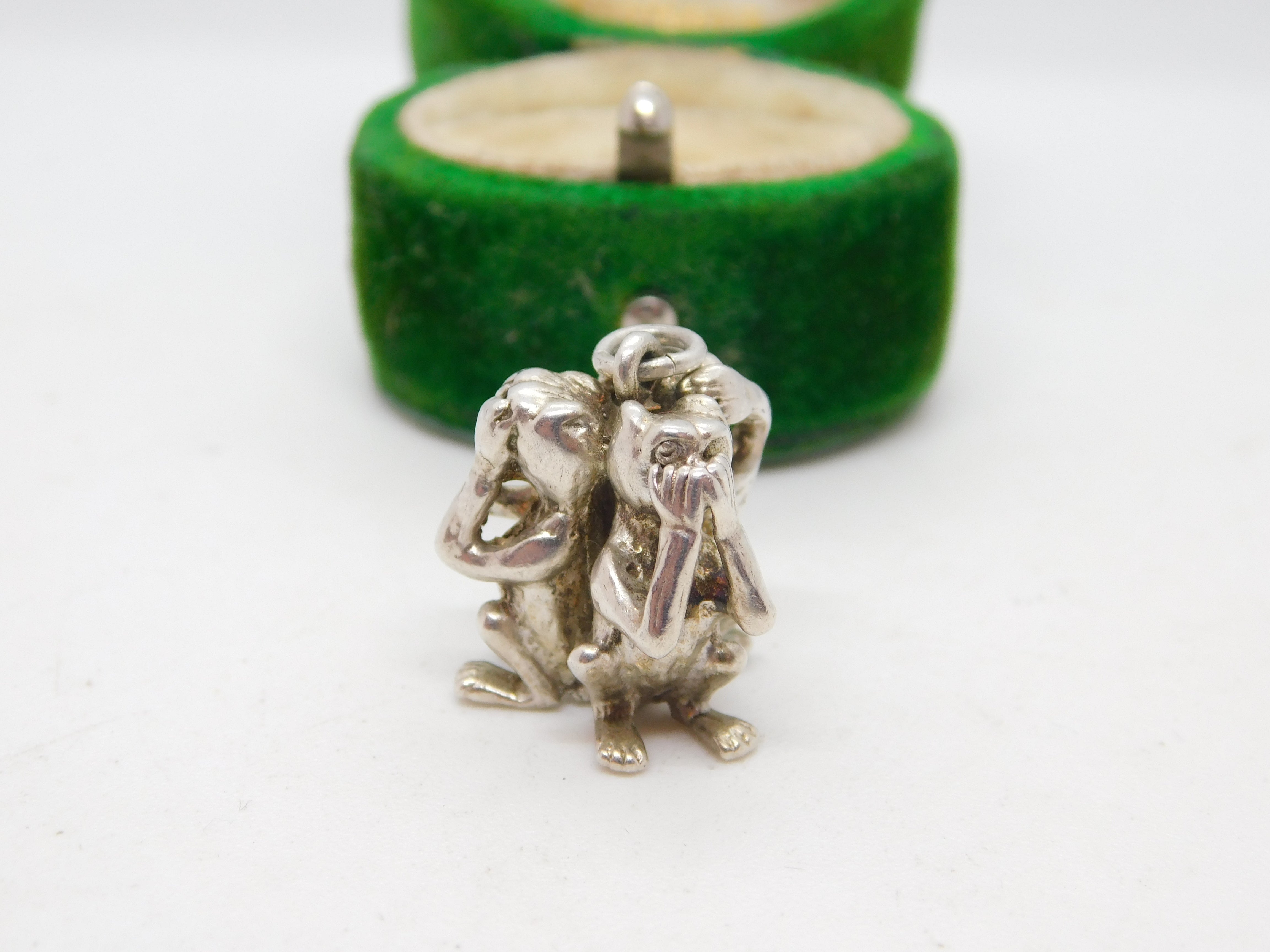 Details: A fantastic and wonderfully designed vintage sterling silver charm pendant in the form of three monkeys symbolising the concept see, hear & speak no evil hallmarked to the edge c1970. This is a wonderful item that would make a perfect gift or addition to any collection. The BOX pictured is for PRESENTATION ONLY and is NOT included in the listings but used to frame the pictures unless specifically stated otherwise.
