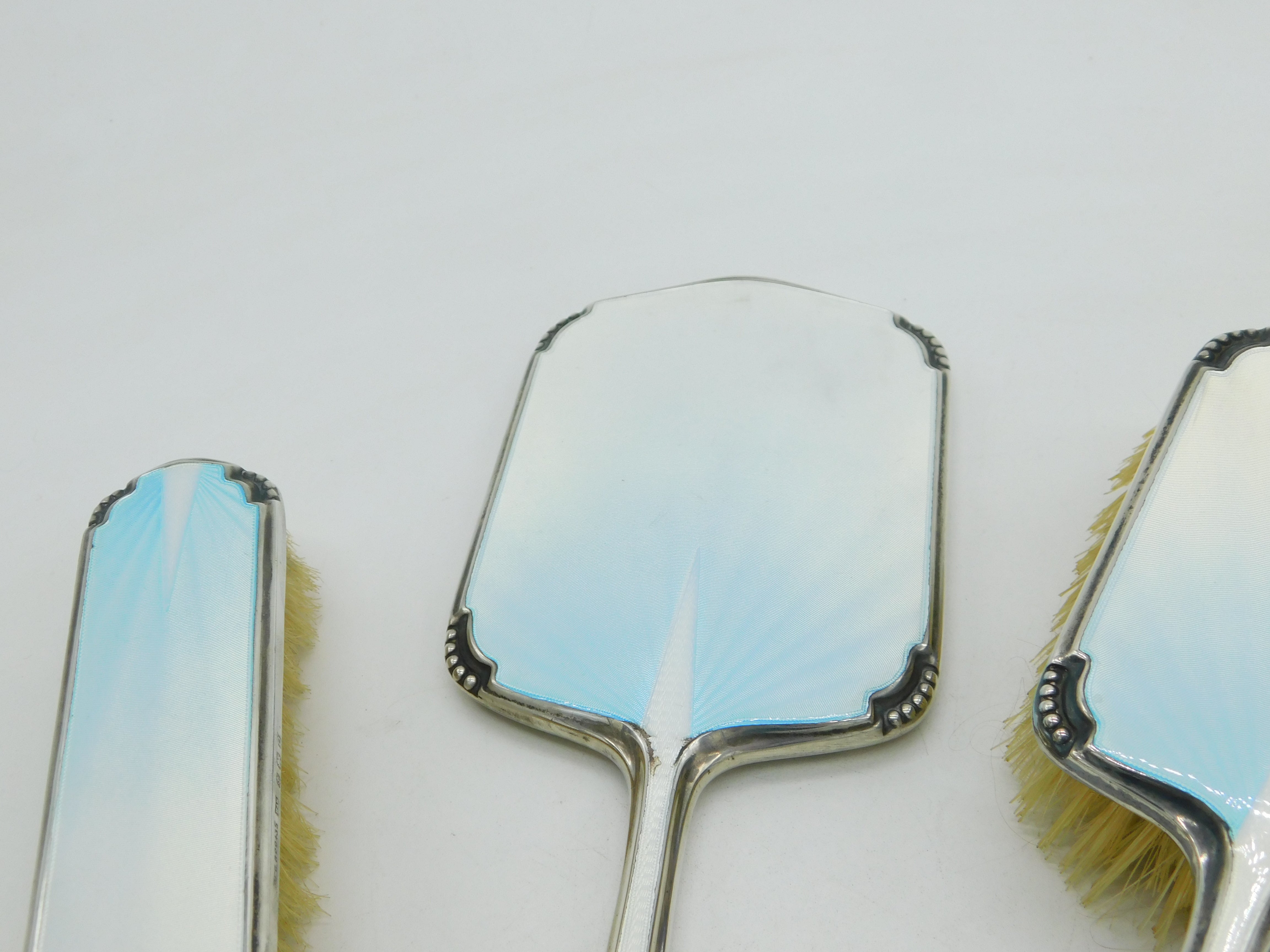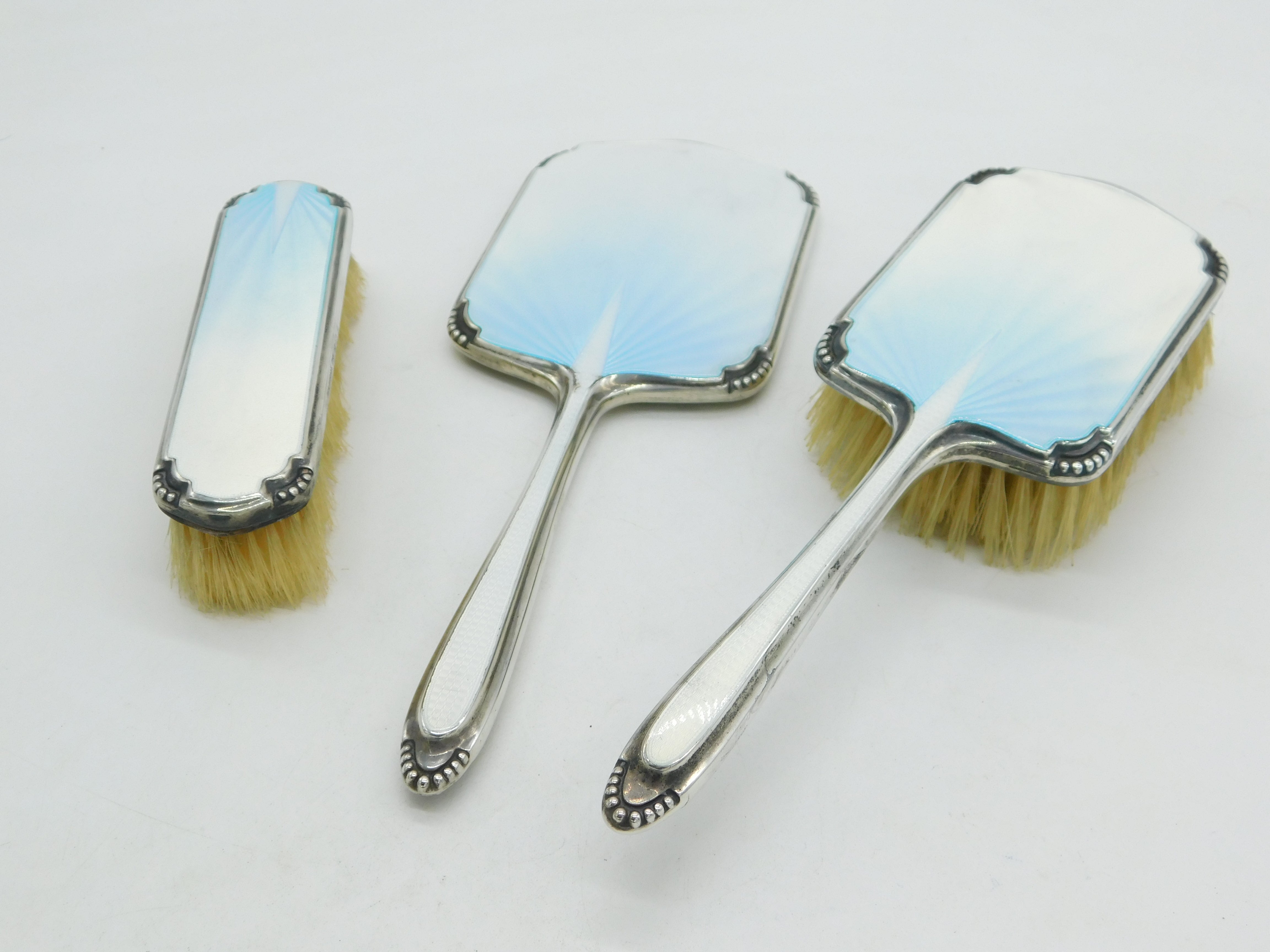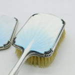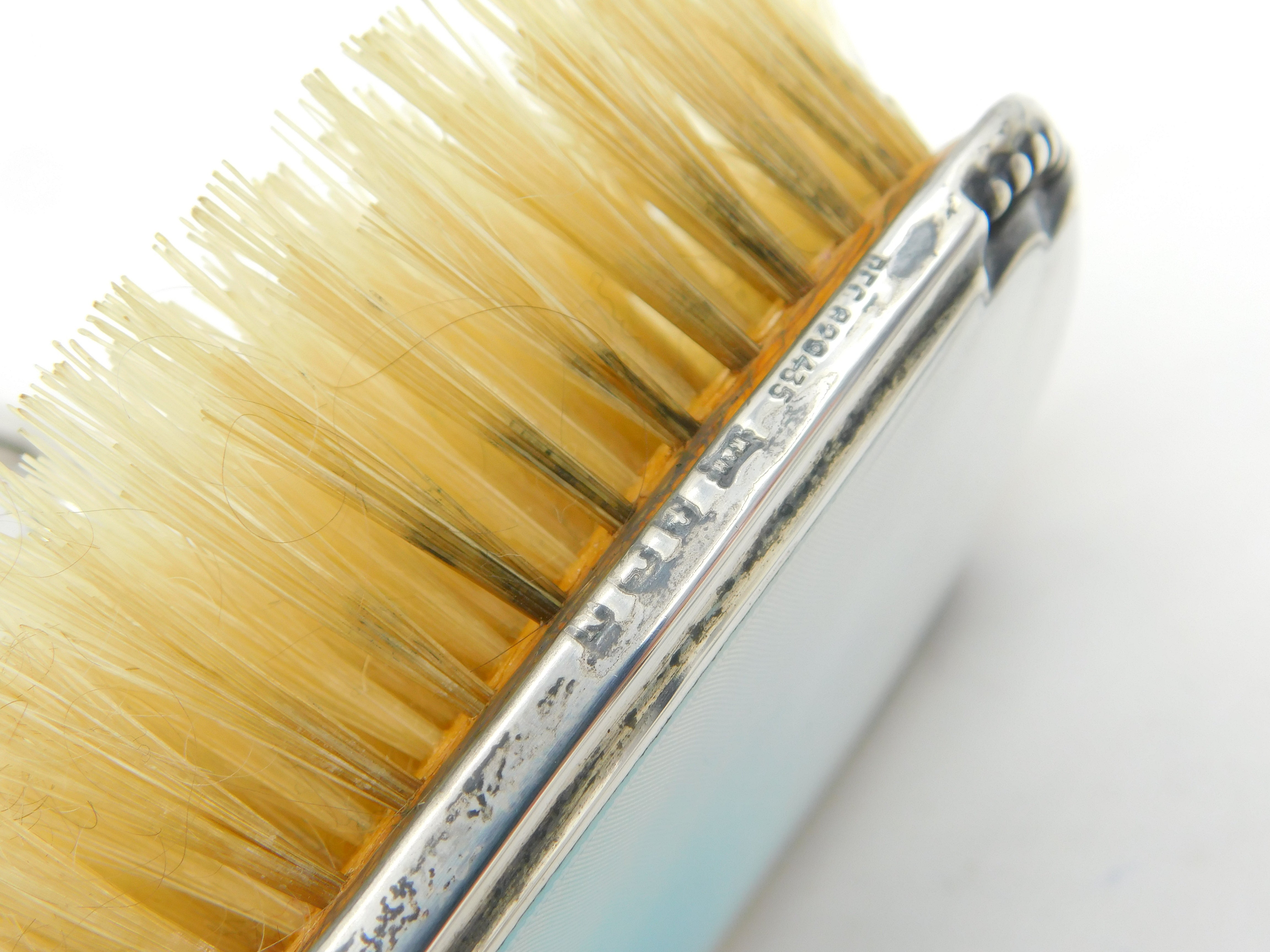 Details: A fantastic and wonderfully designed antique art deco sterling silver guilloche enamel vanity set with superb sky blue & white patterns hallmarked Chester 1938 by Walker & Hall to include Mirror, hairbrush and smaller brush. The brushes are hallmarked Birmingham but of the same date as the mirror. Enamel nibbles please note this. This is a wonderful item that would make a perfect gift or addition to any collection. The BOX pictured is for PRESENTATION ONLY and is NOT included in the listings but used to frame the pictures unless specifically stated otherwise.
