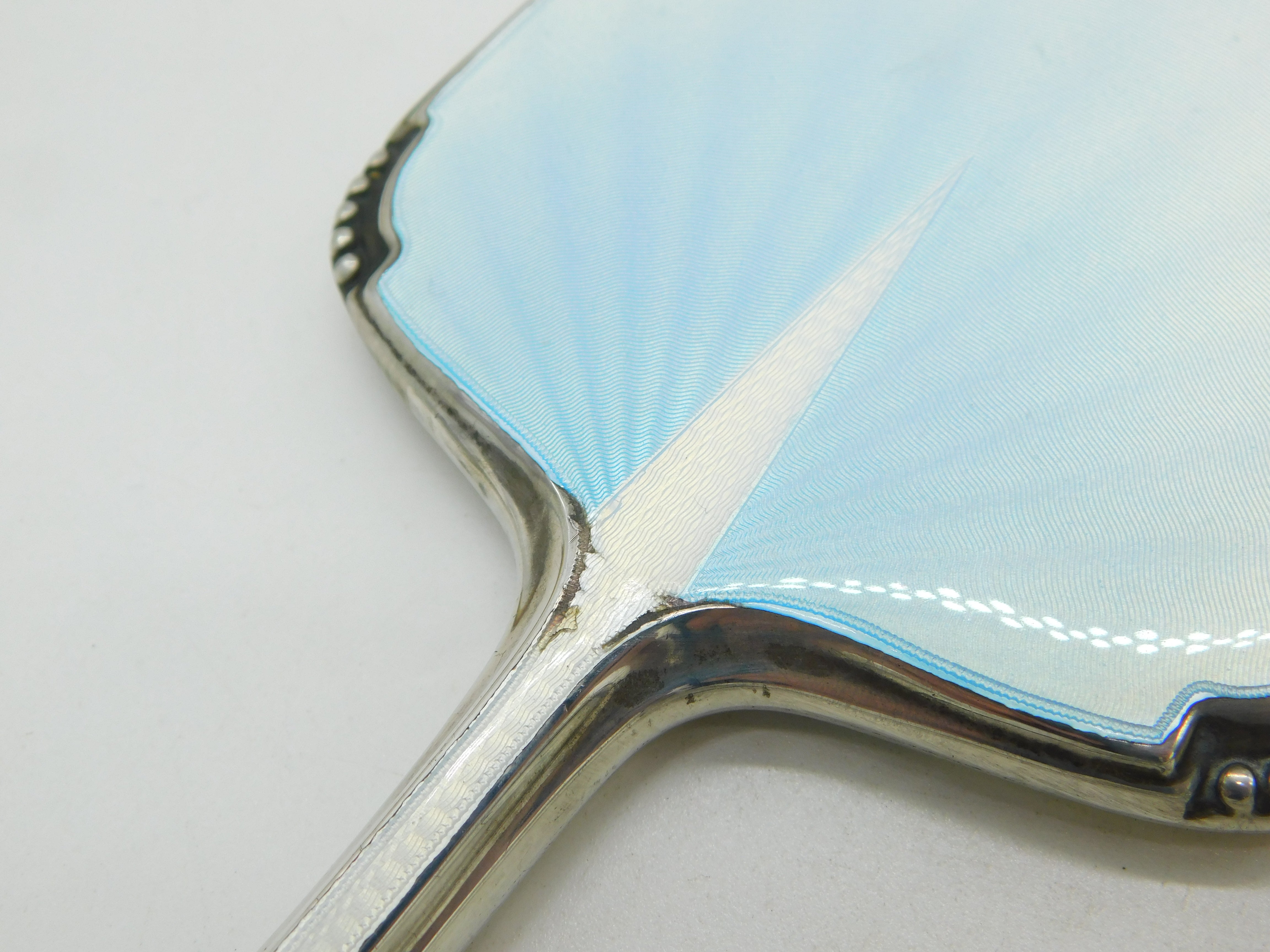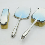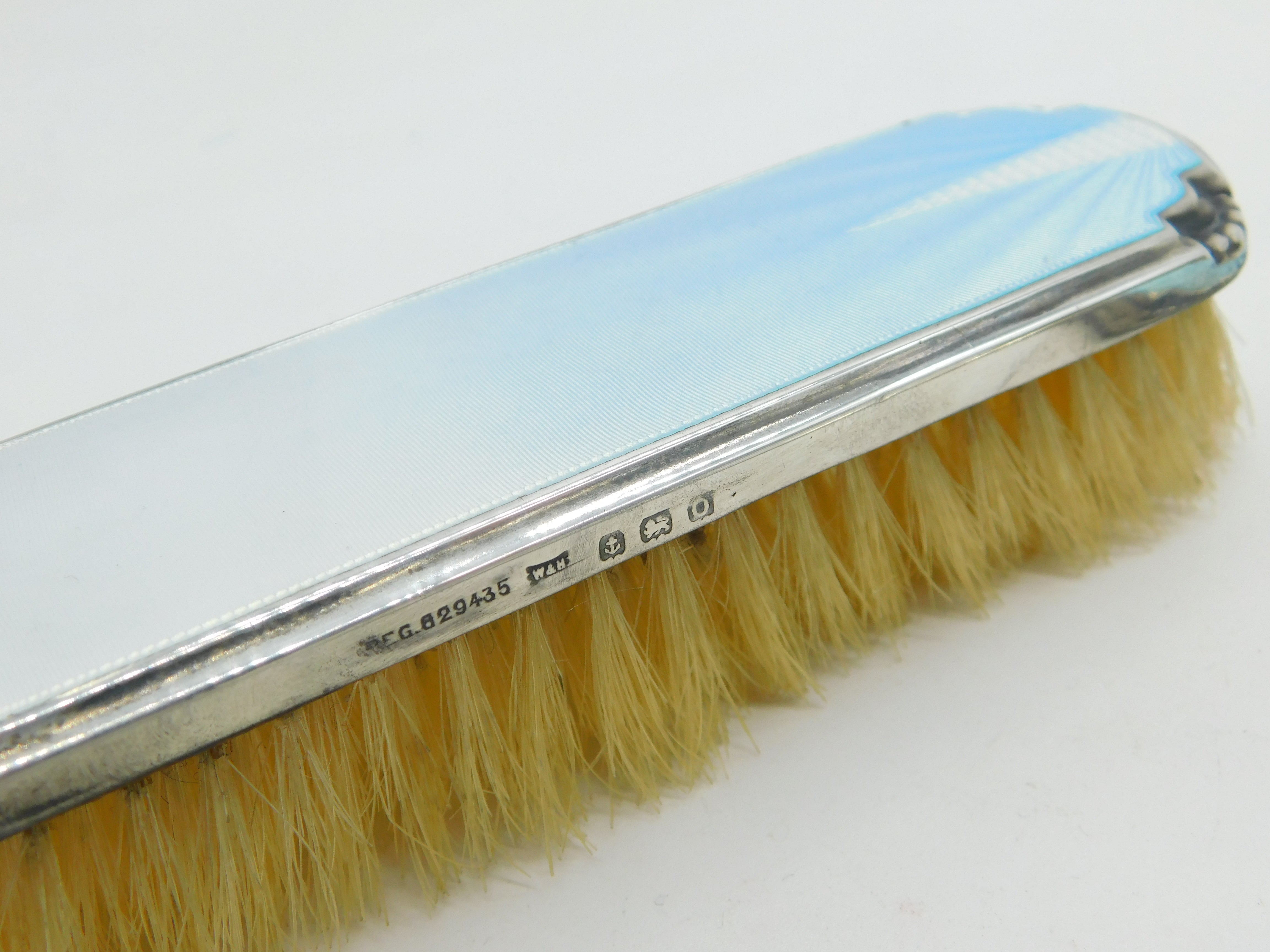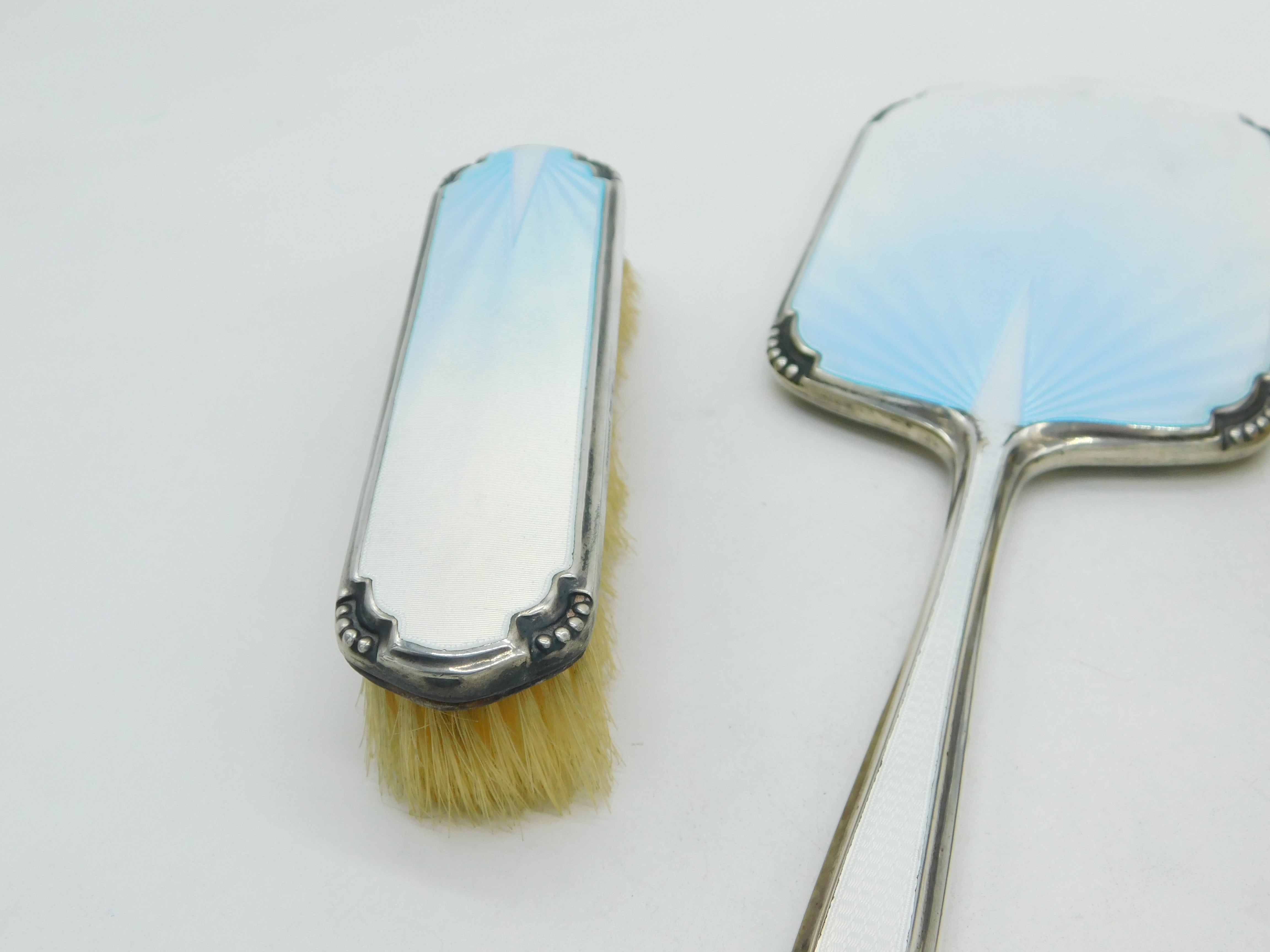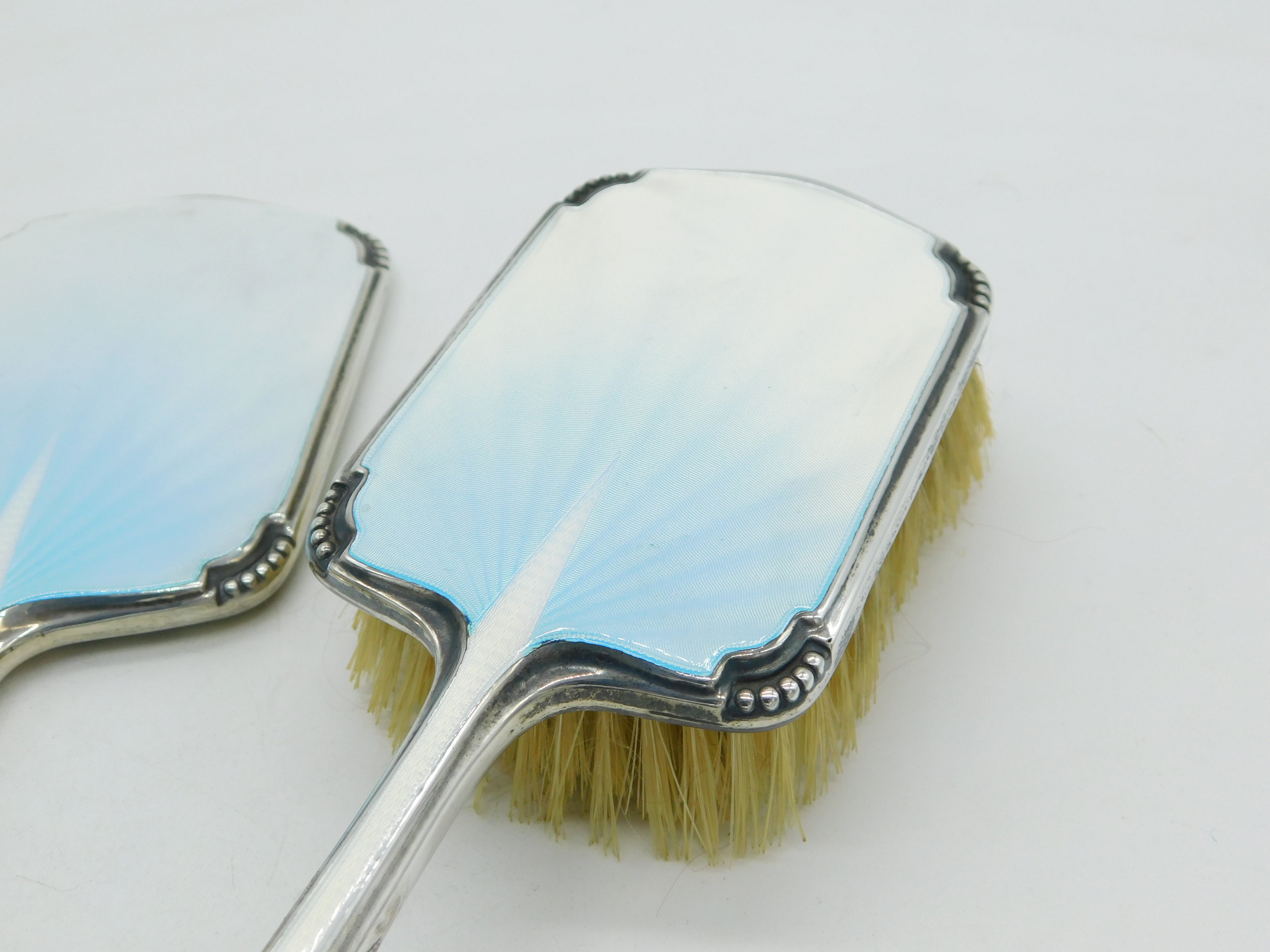 Details: A fantastic and wonderfully designed antique art deco sterling silver guilloche enamel vanity set with superb sky blue & white patterns hallmarked Chester 1938 by Walker & Hall to include Mirror, hairbrush and smaller brush. The brushes are hallmarked Birmingham but of the same date as the mirror. Enamel nibbles please note this. This is a wonderful item that would make a perfect gift or addition to any collection. The BOX pictured is for PRESENTATION ONLY and is NOT included in the listings but used to frame the pictures unless specifically stated otherwise.
