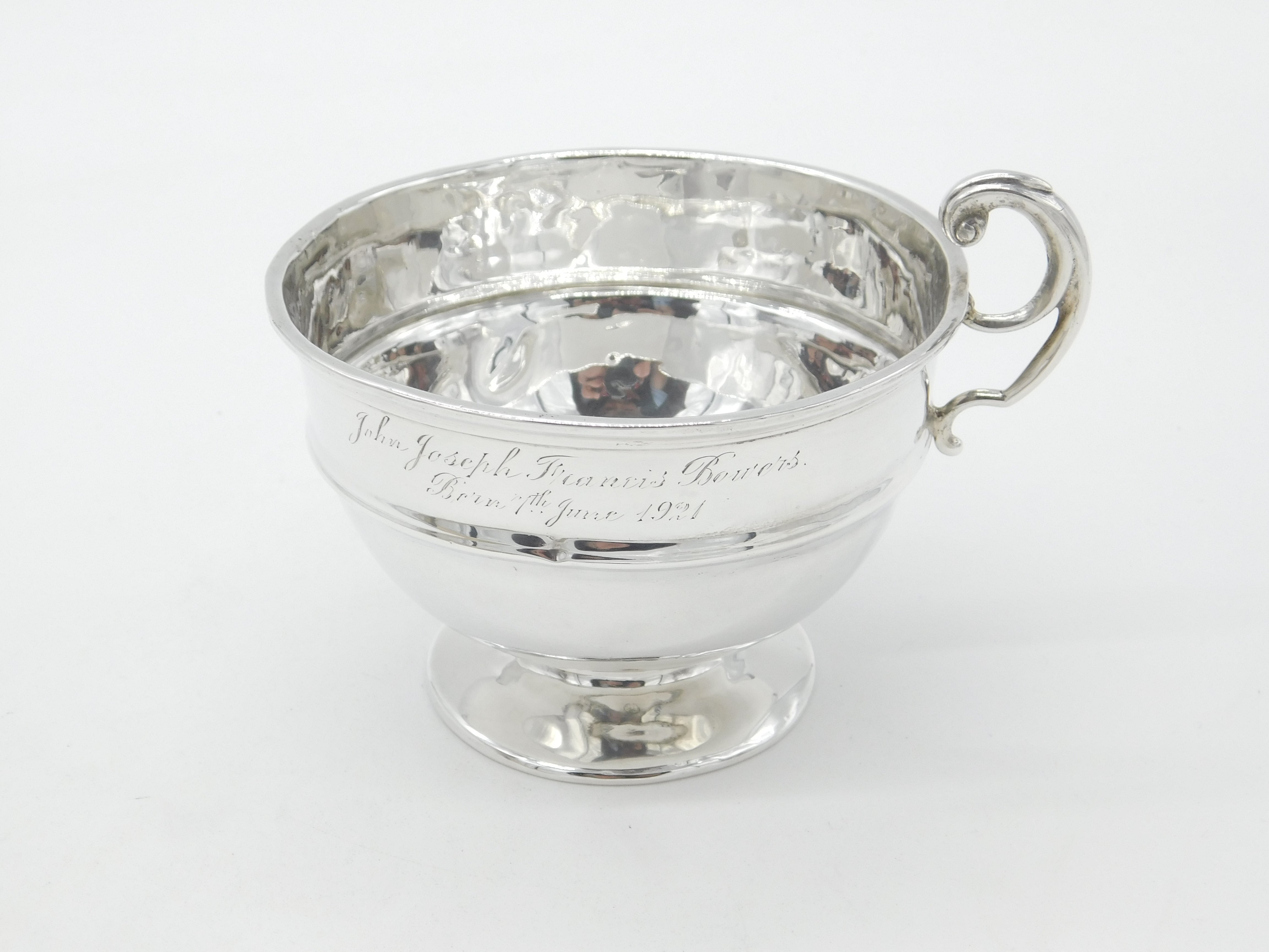 Details: A fantastic and wonderfully designed antique art deco sterling silver wide bowl christening mug with unusual shape inscluoing scroll handle engraved to the edge, hallmarked Birmingham 1921 by Joseph Gloster. This is a wonderful item that would make a perfect gift or addition to any collection. The BOX pictured is for PRESENTATION ONLY and is NOT included in the listings but used to frame the pictures unless specifically stated otherwise.
